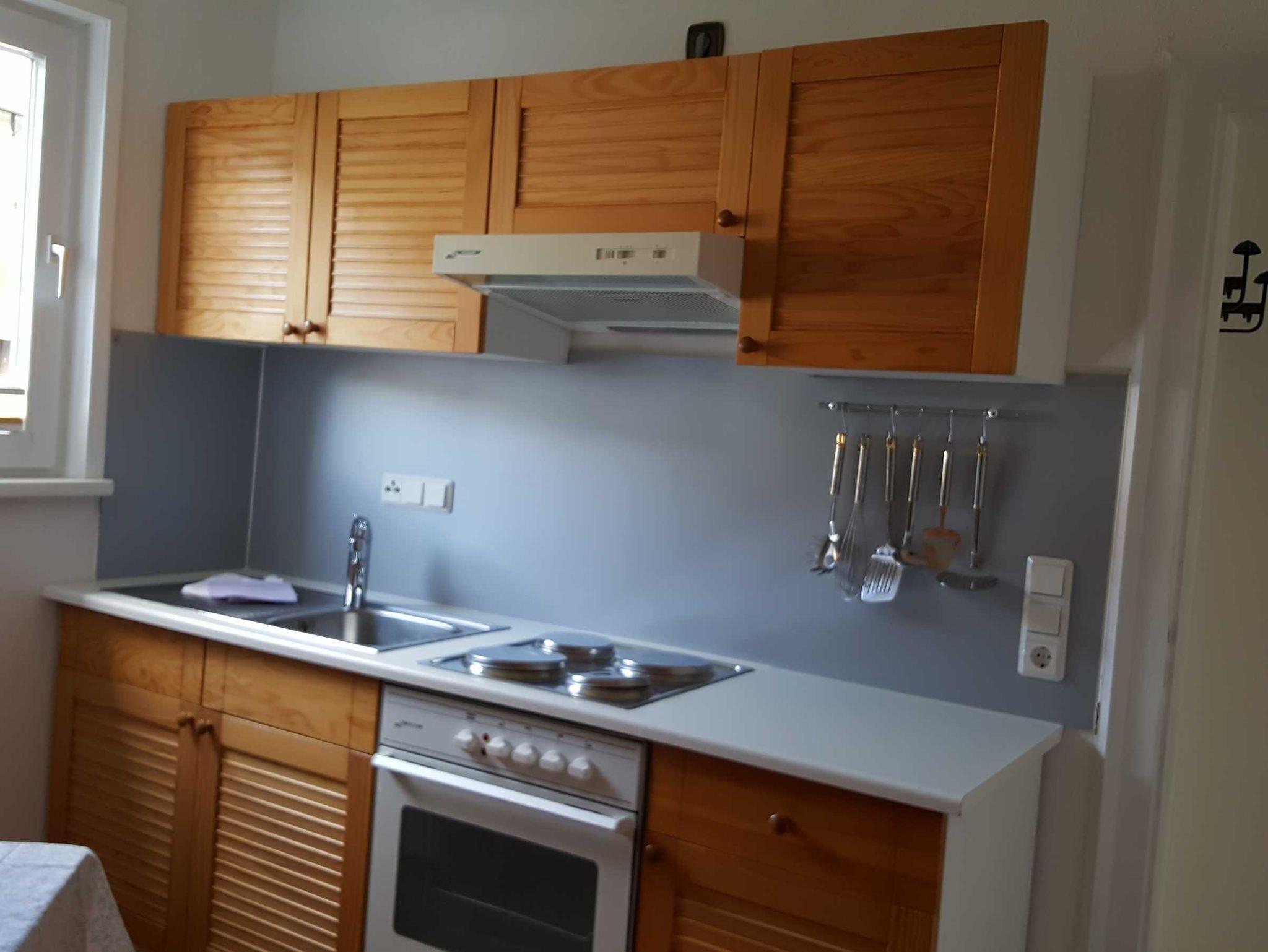 Weiterhin ist die Wohnung mit einer komplett eingerichteten Küche mit Backofen und 4 Flammenherd