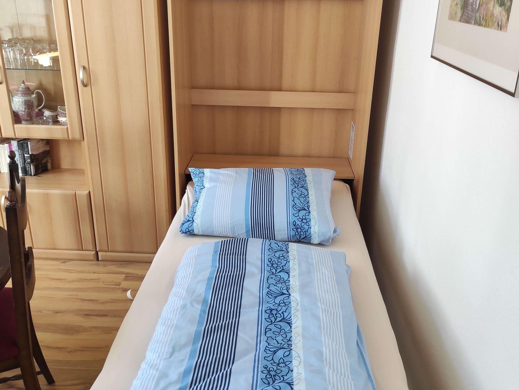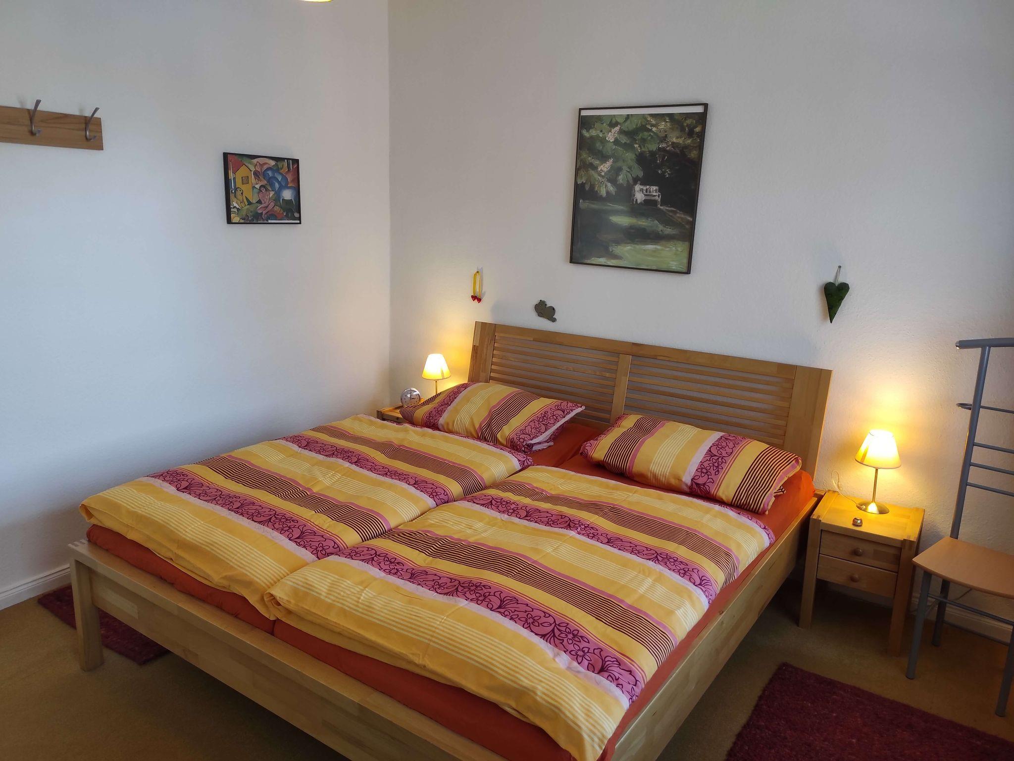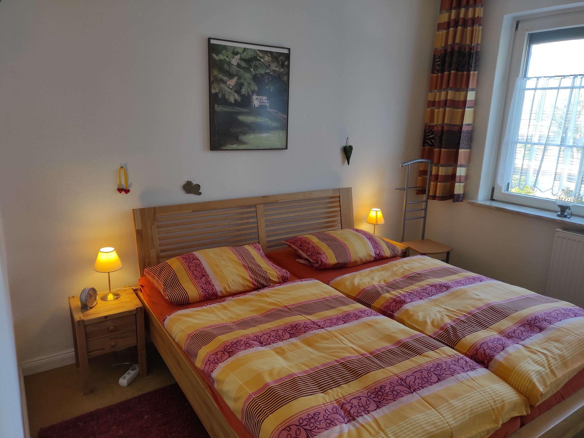 Die Ferienwohnung liegt im 1. Obergeschoss. Sie hat 3 helle, freundlich eingerichtete Zimmer. Sie verfügt über ein Schlafzimmer mit Doppelbett. Eine zusätzliche Schlafgelegenheit bietet das Schrankklappbett (0,90 x 2m) das sich im Esszimmer befindet.