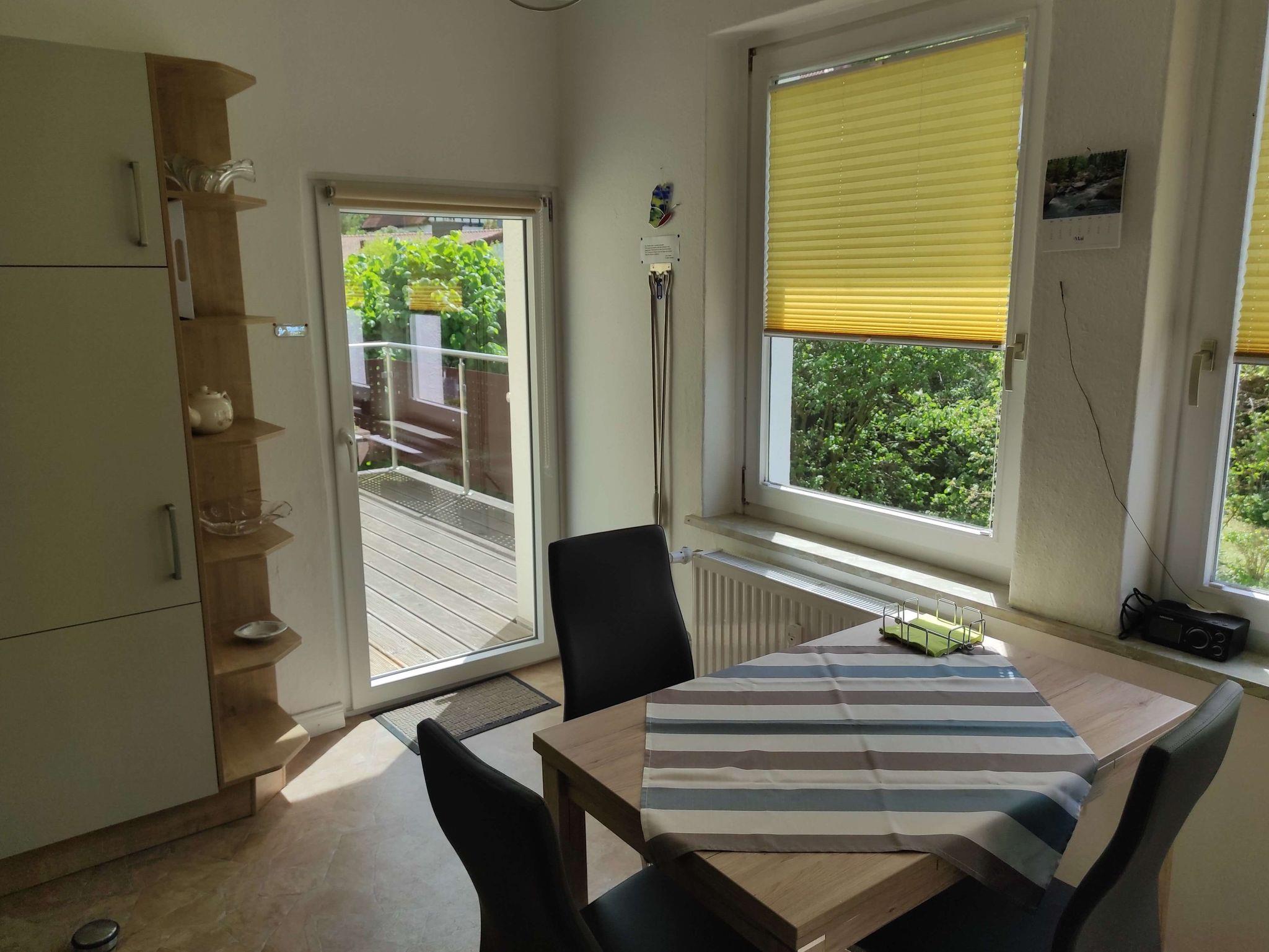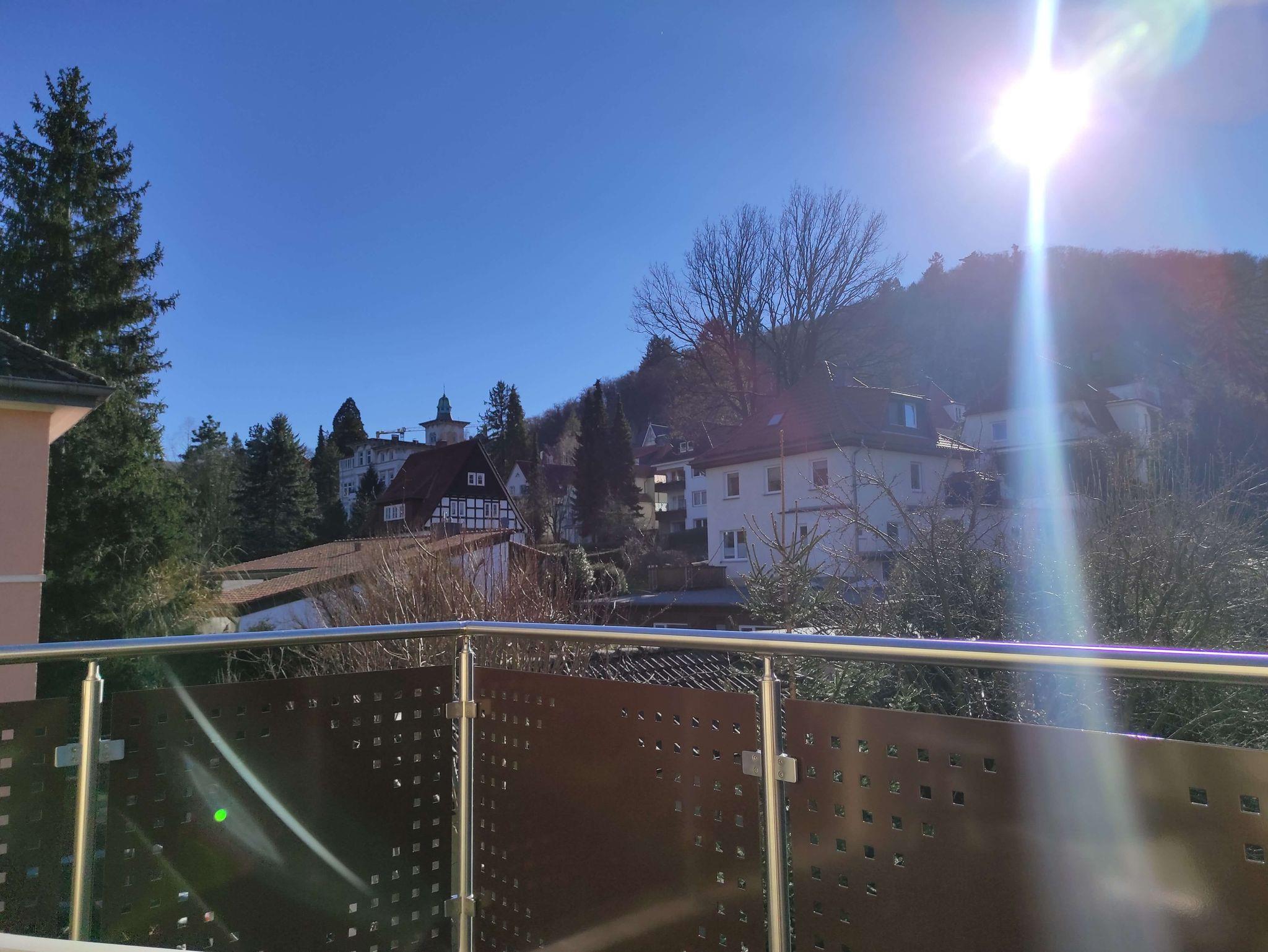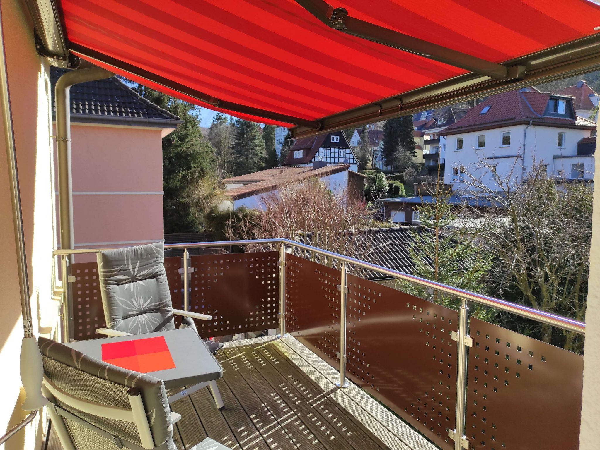 Vom Panorama-Fenster im Wohnzimmer aus haben Sie einen Blick auf den Burgberg. Ein großer Balkon, mit Markise, lädt zum Entspannen ein. Auch im Garten können Sie sich im Sommer erholen.