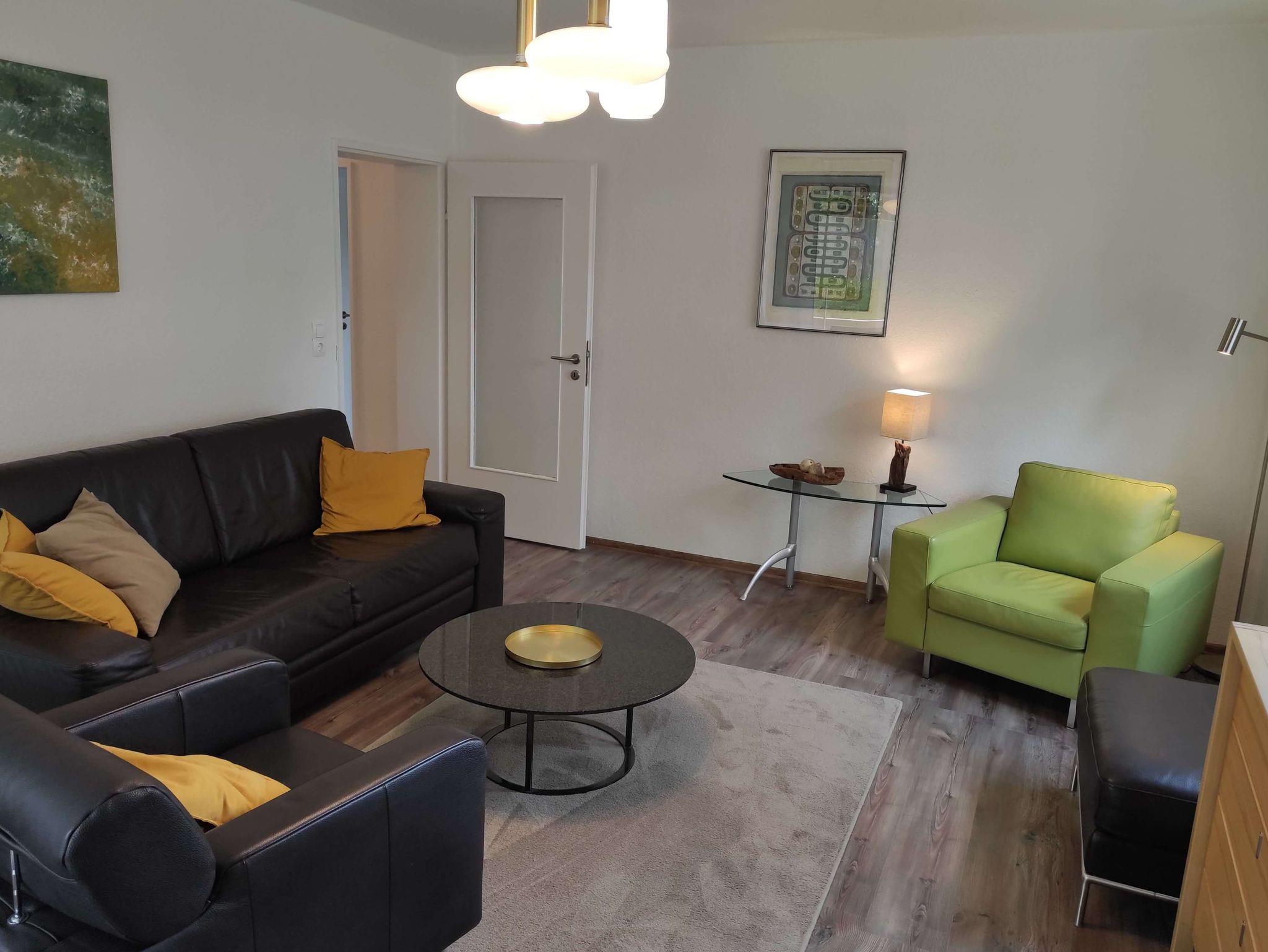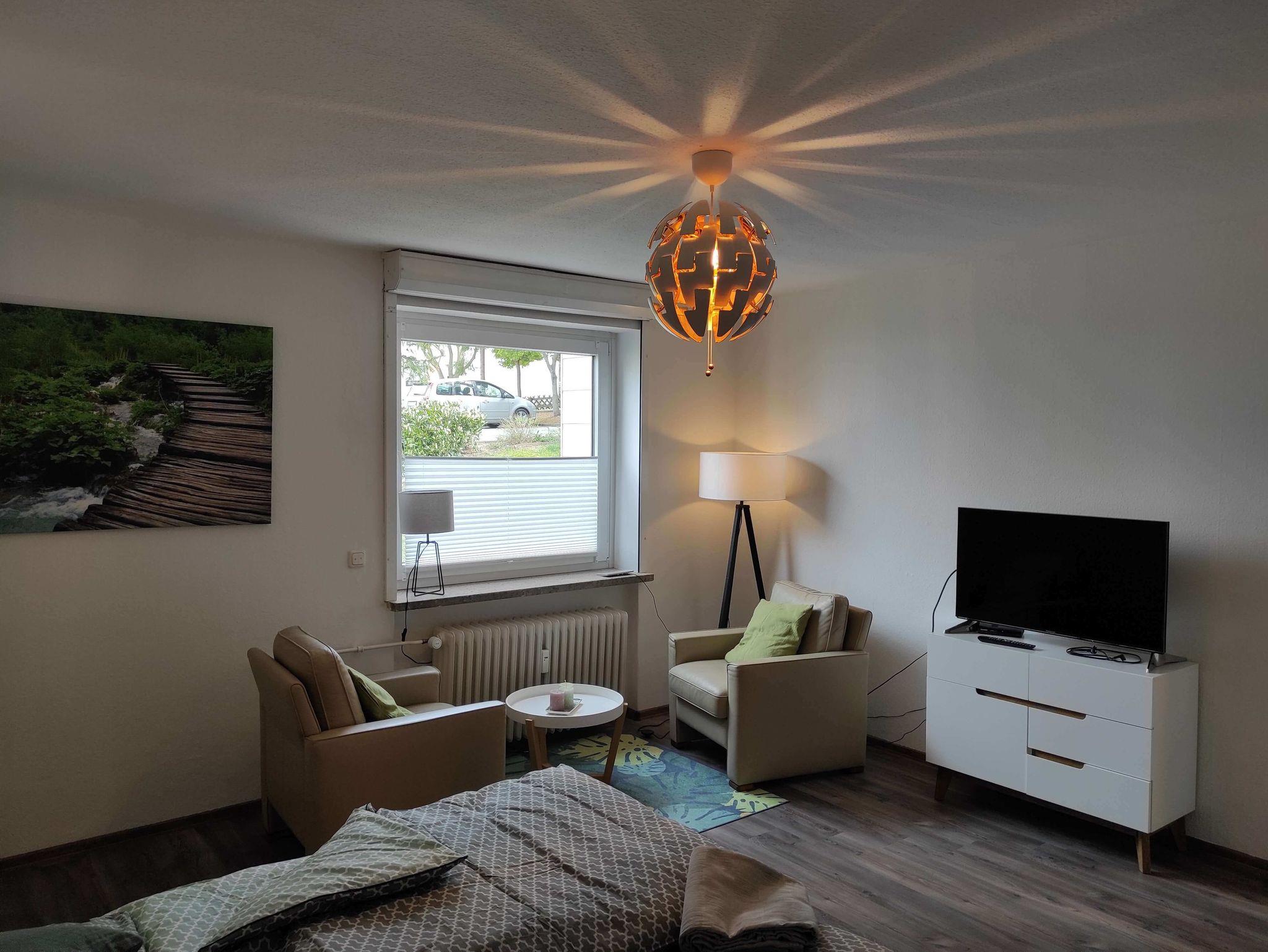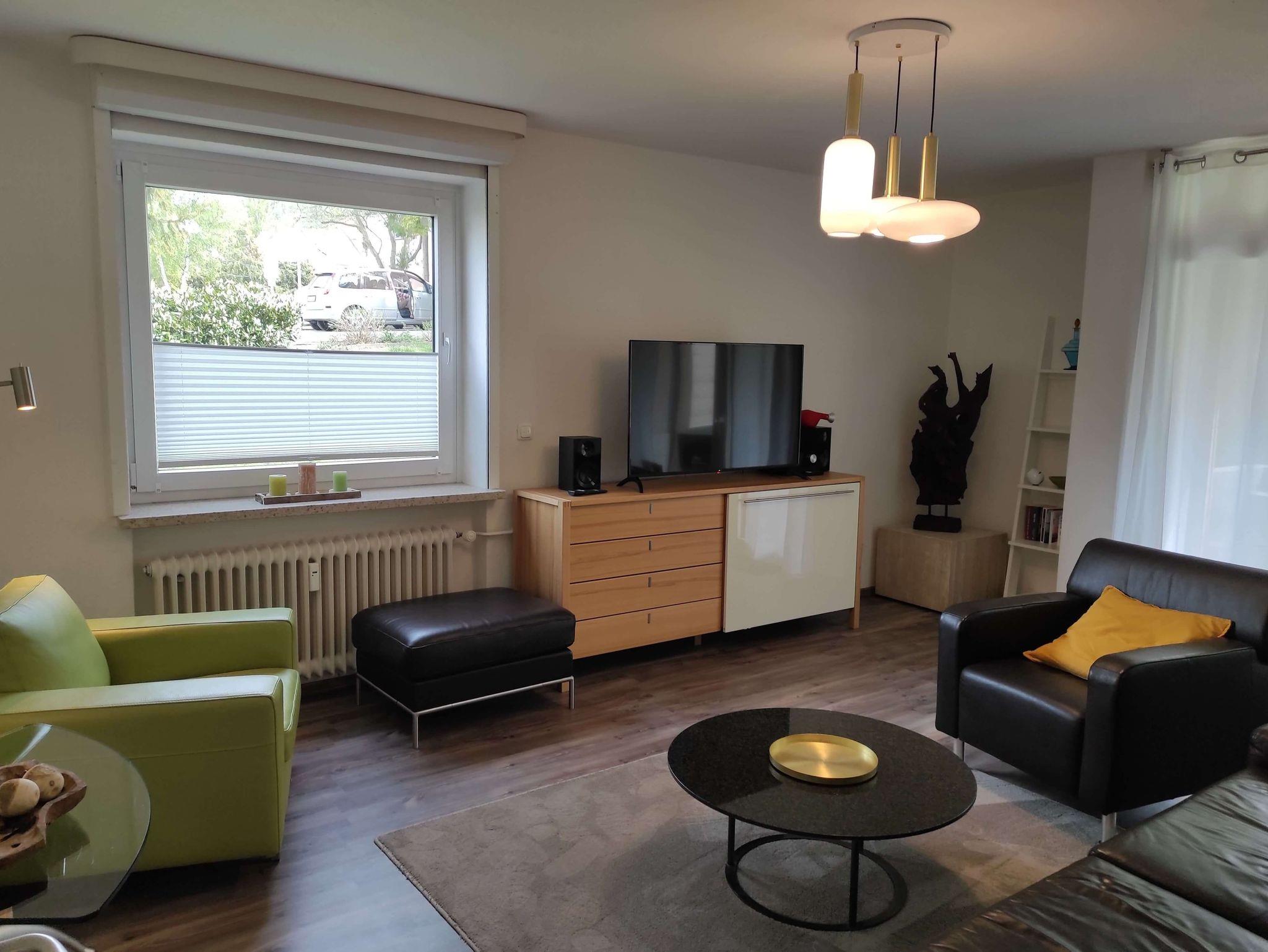 Das Wohnzimmer mit Laminatboden ist modern eingerichtet mit bequemen Sesseln und Sofa. Es verfügt über einen 40 Zoll Fernseher und eine Musikanlage mit Bluetooth. Das hochwertige Schlafsofa lässt sich leicht ausklappen und bietet mit einer Liegefläche von 1.60 x 2,00m genug Platz für 2 Personen.