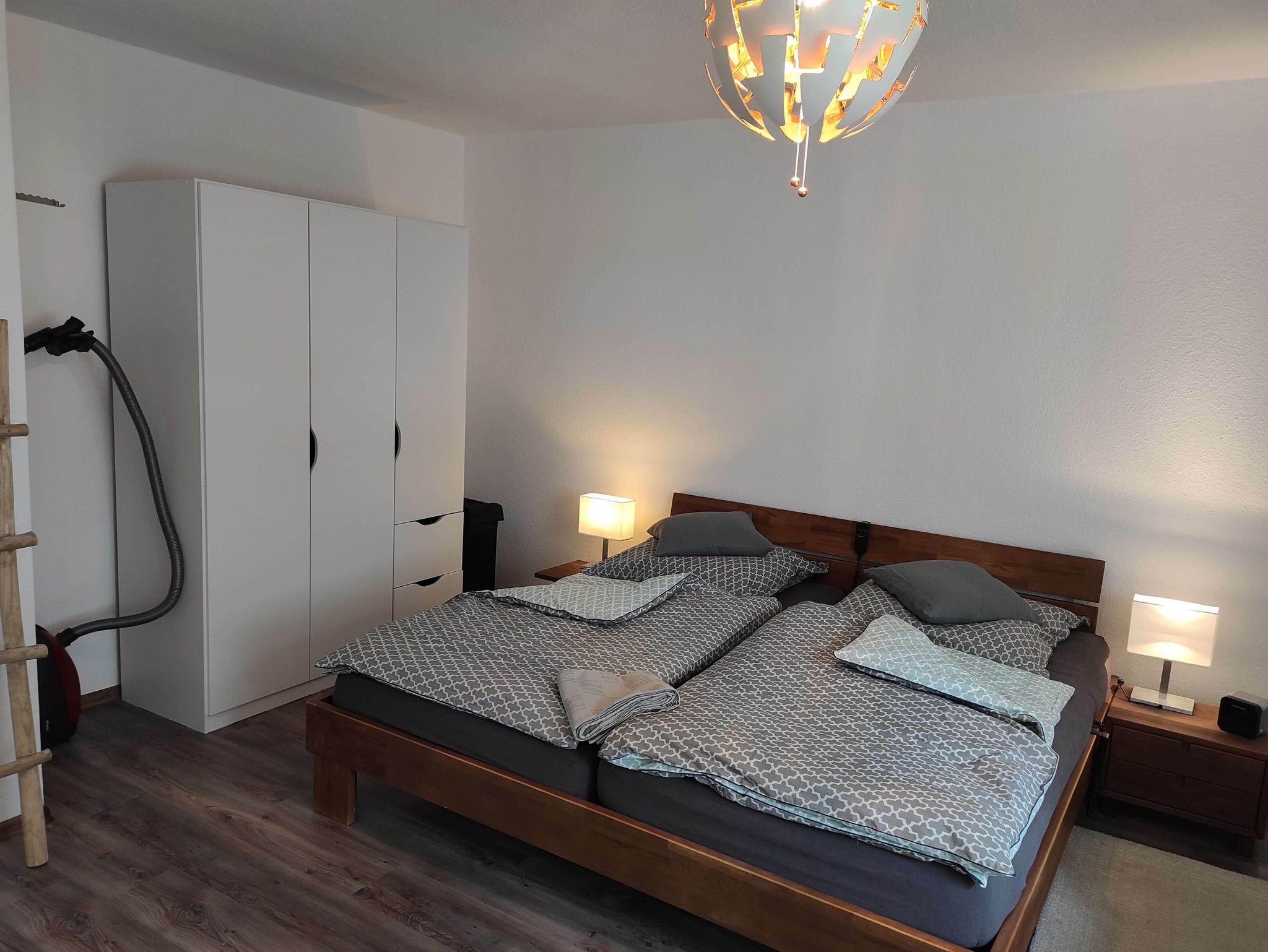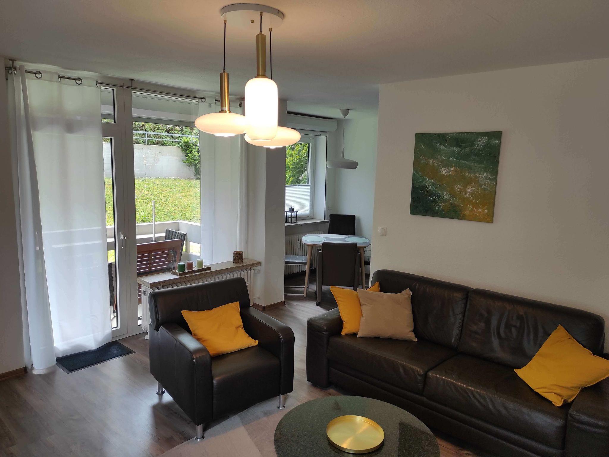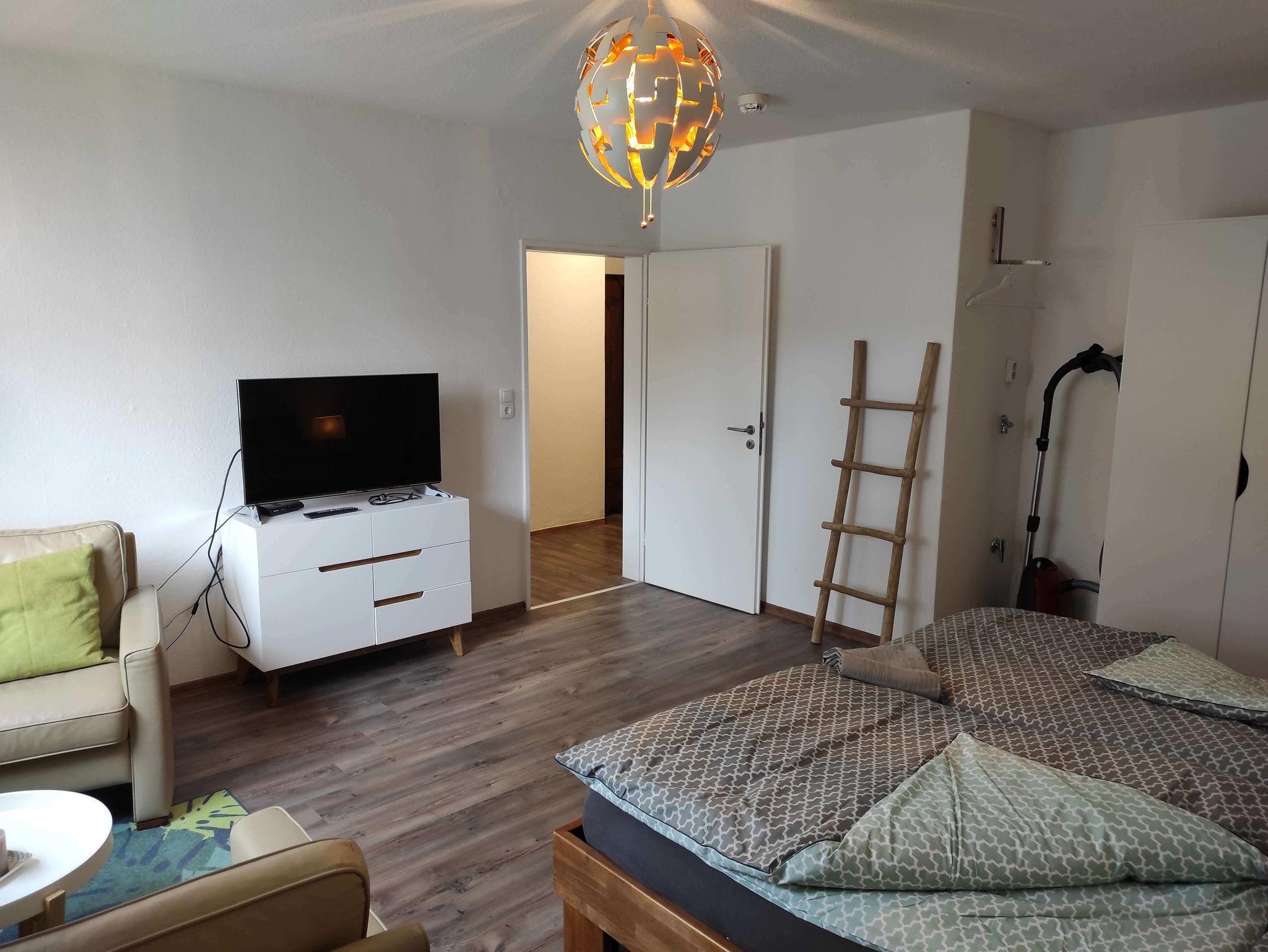 Das Wohnzimmer mit Laminatboden ist modern eingerichtet mit bequemen Sesseln und Sofa. Es verfügt über einen 40 Zoll Fernseher und eine Musikanlage mit Bluetooth. Das hochwertige Schlafsofa lässt sich leicht ausklappen und bietet mit einer Liegefläche von 1.60 x 2,00m genug Platz für 2 Personen.