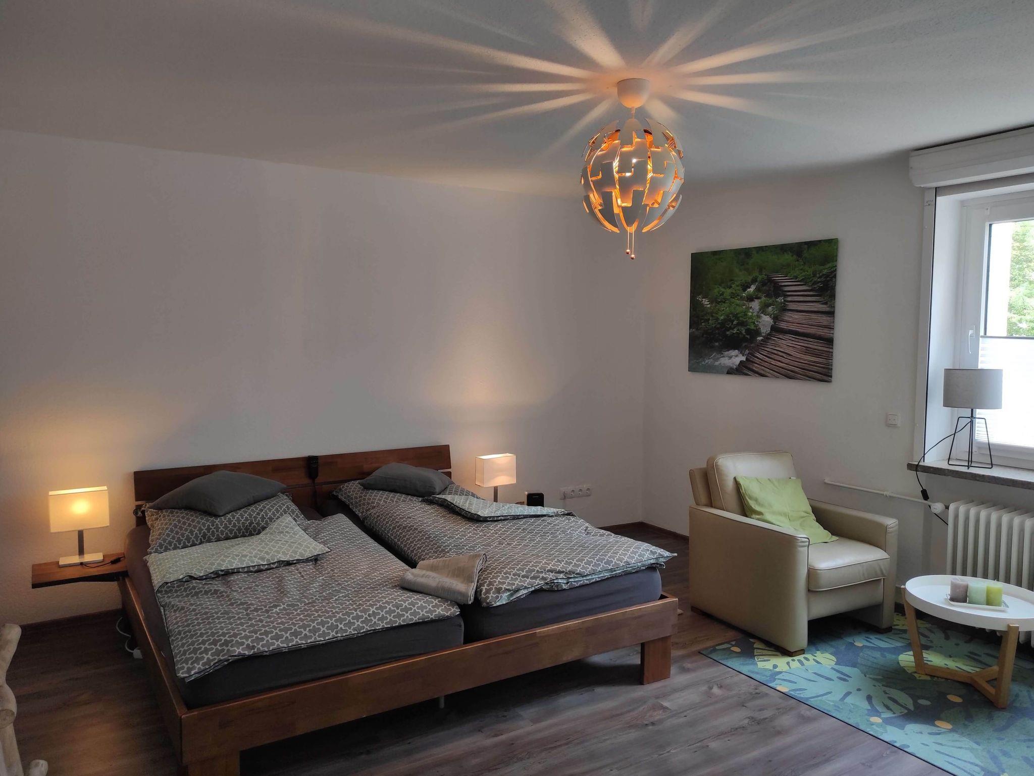 Das geräumige 21qm große Schlafzimmer verfügt über ein 2 x 2m großes Doppelbett mit elektrischen Lattenrosten. Ein Fernseher und eine bequeme Sitzecke mit zwei Sesseln bietet einen zusätzlichen Rückzugsraum zum Lesen, Fernsehen und Entspannen.