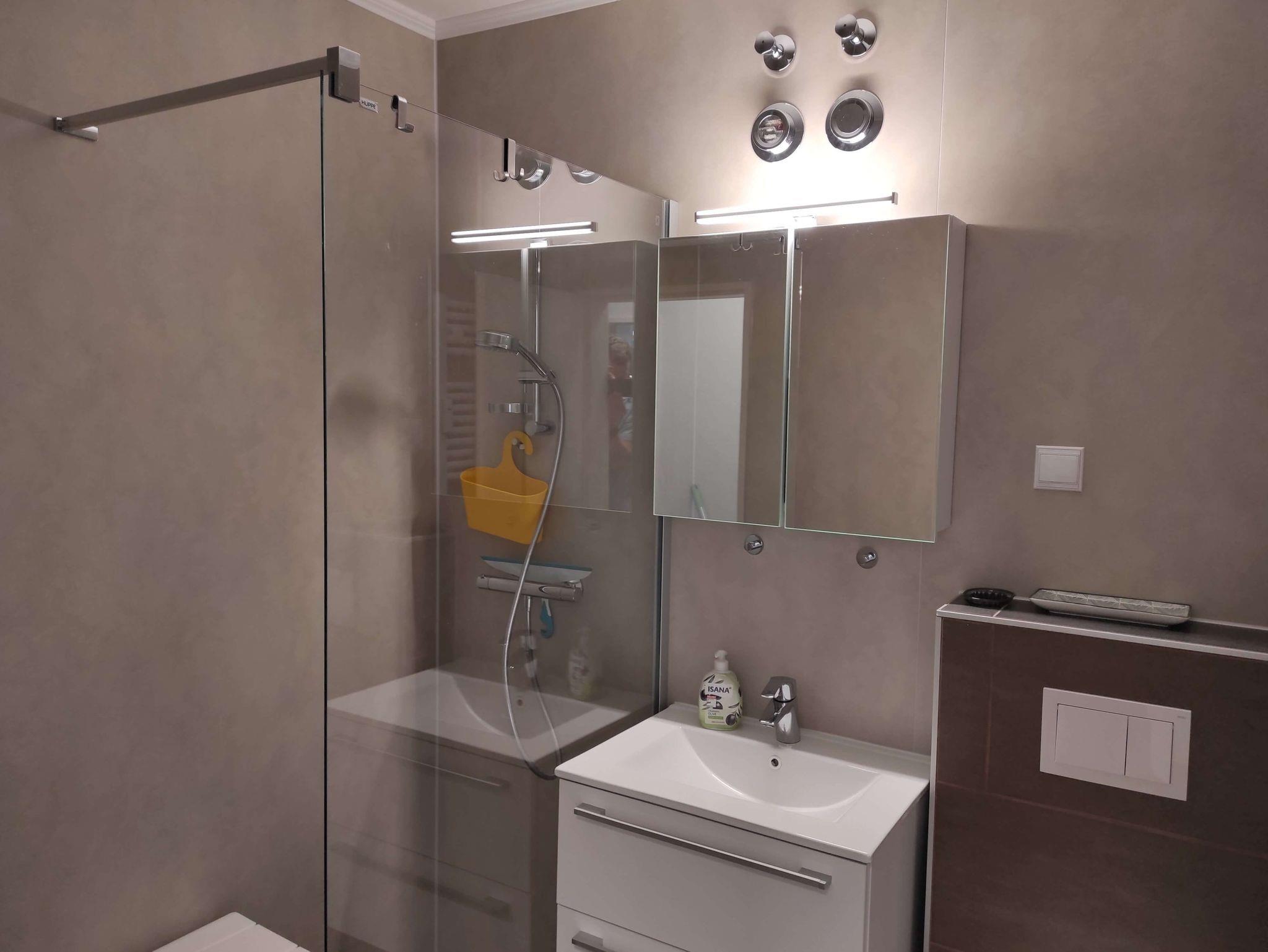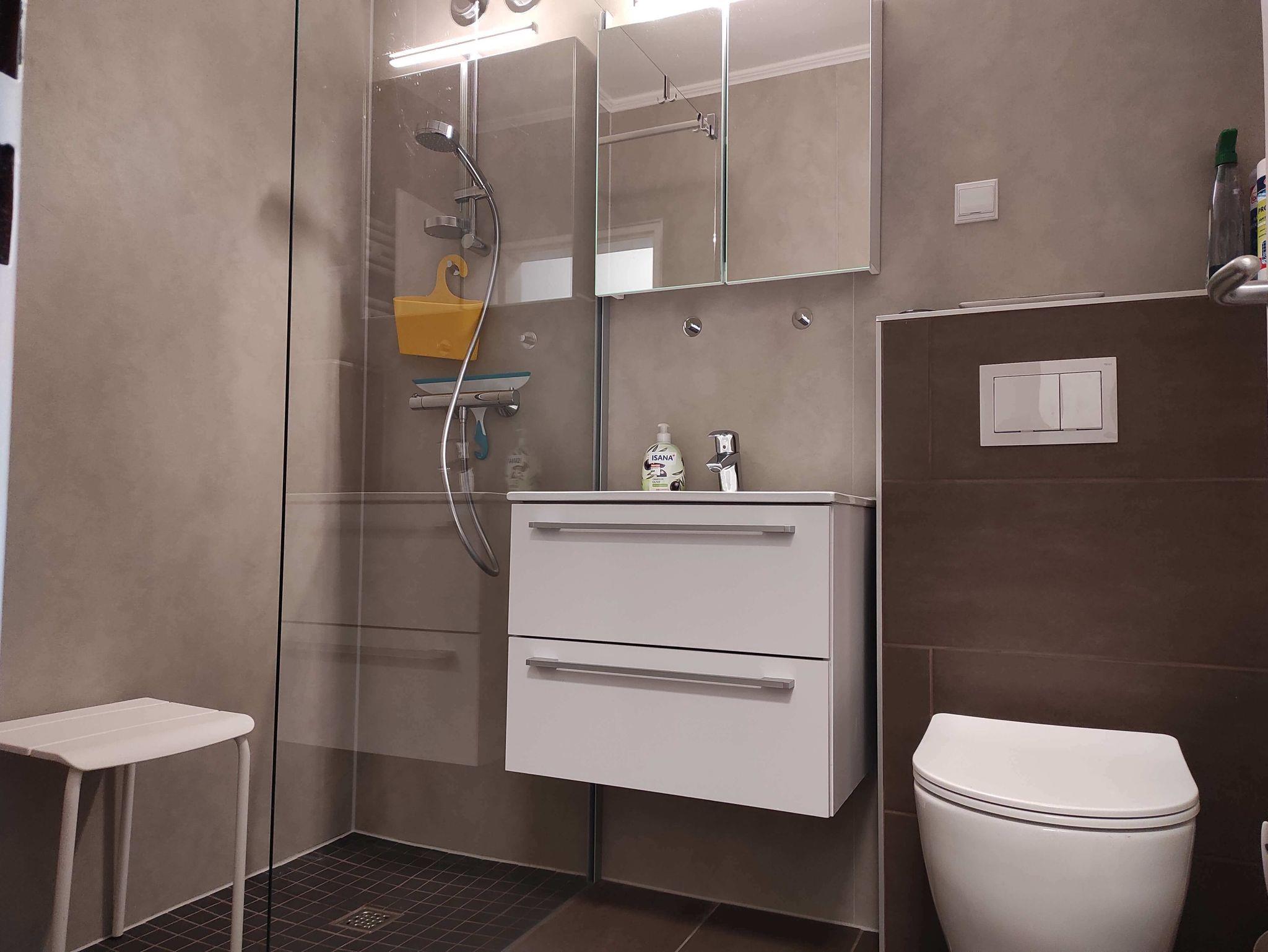 Das moderne Badezimmer ist mit einer bodentiefen Dusche und einer Handtuchheizung ausgestattet.