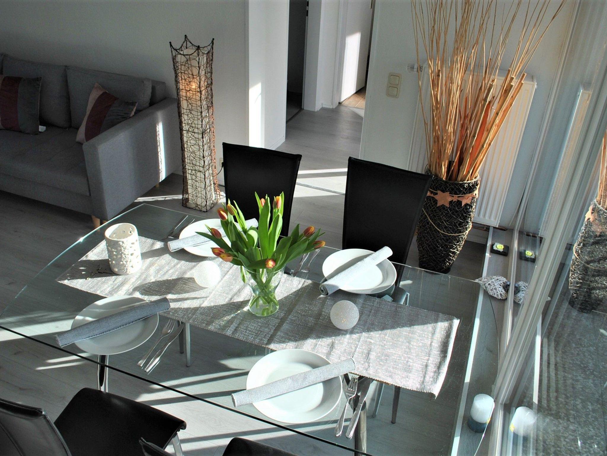 Beim Betreten der Fewo Penthouse am Wildpark sind Sie gleich im kombinierten Wohn-/Küchenbereich. Ein Esstisch an der riesigen Fensterfläche zur Dachterrasse lädt zum verweilen ein. Durch die großen Fenster können Sie selbst im Winter die Sonne genießen und sich entspannen. Für weitere 2 Personen steht ein Schlafsofa zur Verfügung.