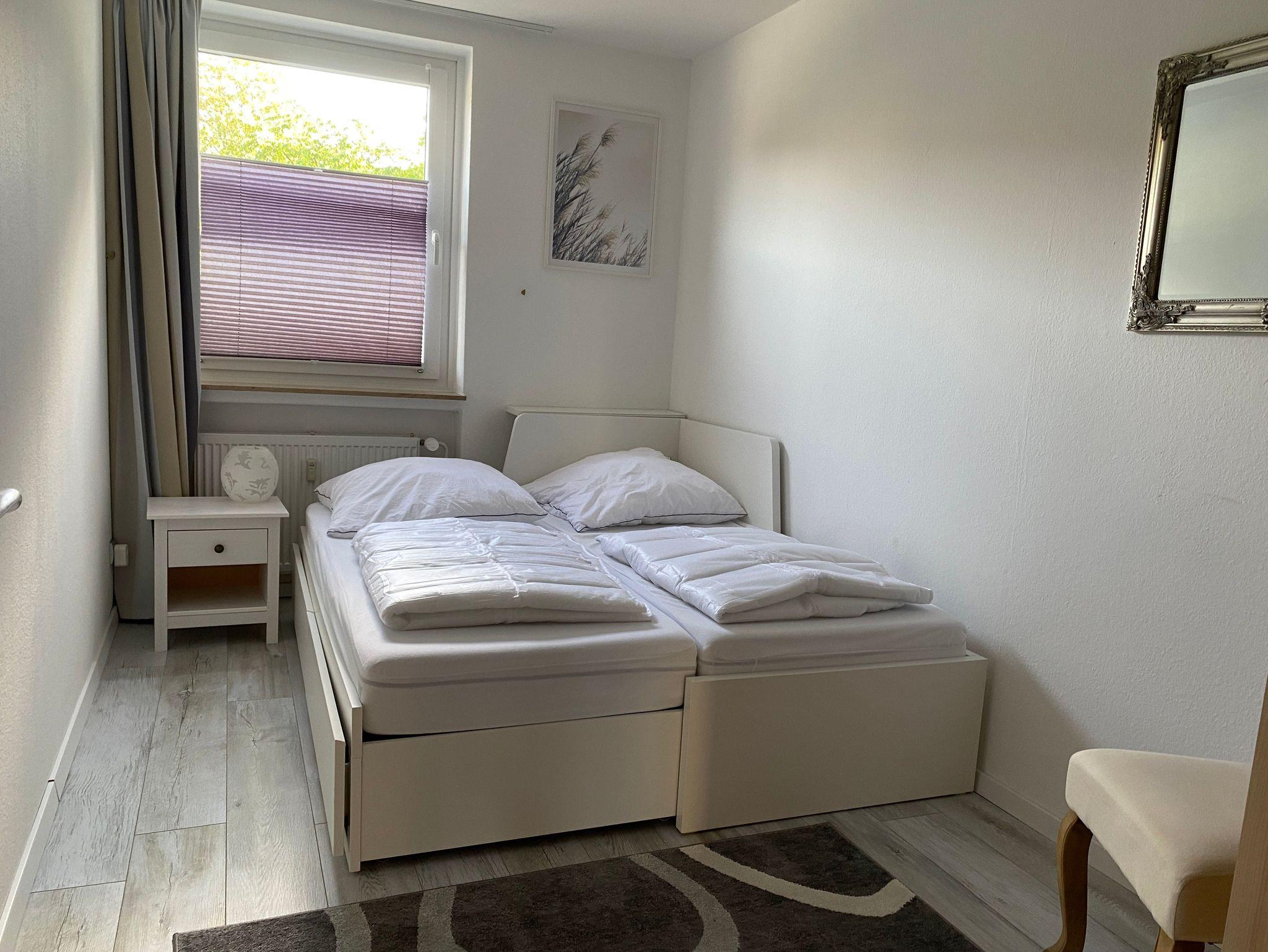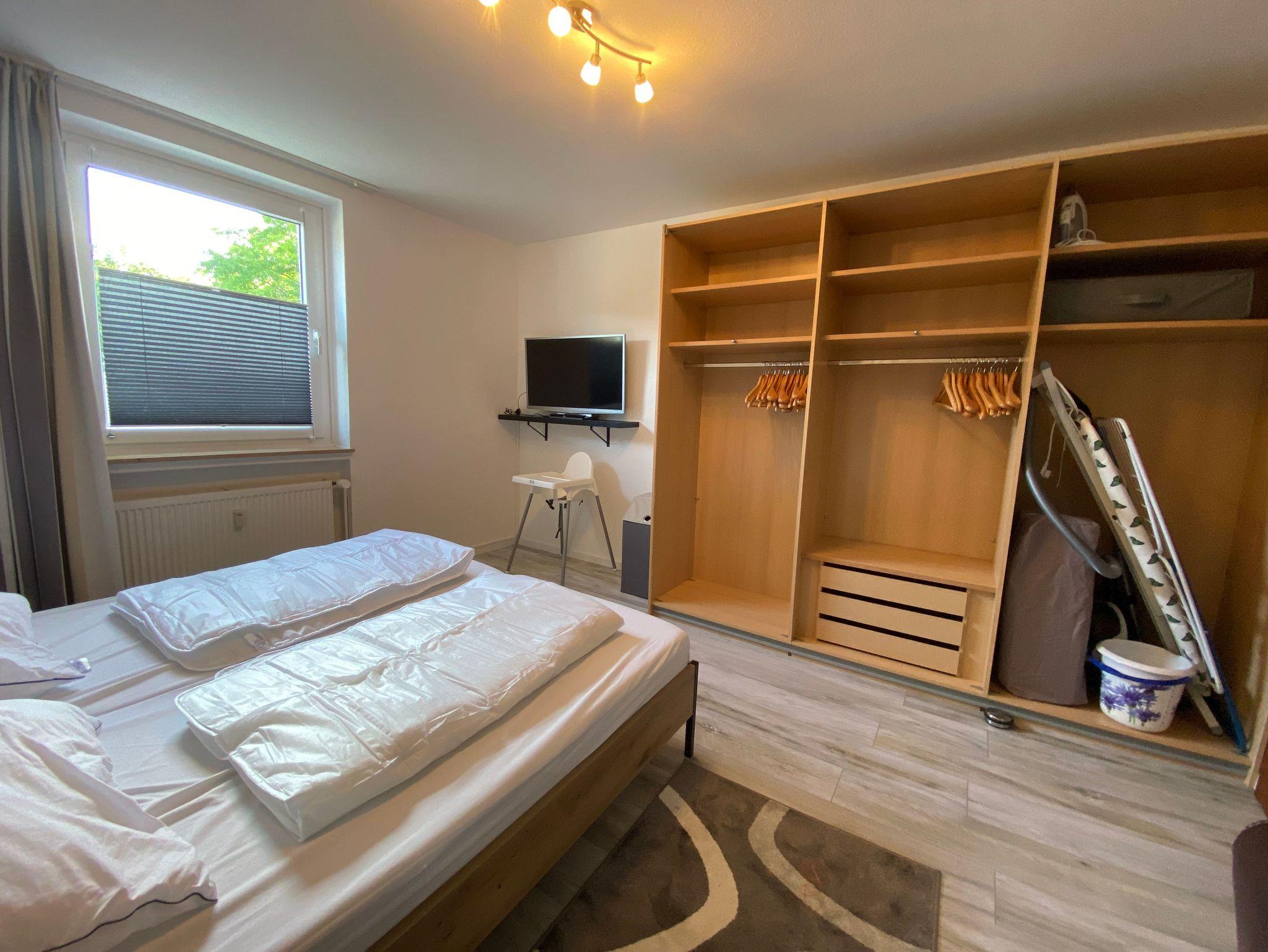 Das großzügige Schlafzimmer ist mit einem 180x200 cm Bett mit zwei hochwertigen Matratzen ausgestattet. In einem offenen Schranksystem mit viel Stauraum, steht den Gästen ausreichend Platz zur Verfügung, um den Inhalt ihres Reisegepäcks geordnet zu verteilen. Der Fernseher kann mit Smart TV über den Amazon Fire TV Stick genutzt werden (ARD, ZDF, Bildschirm Spieglung von Android Geräten über freie Apps, eigene Anmeldung bei Netflix, etc. erforderlich). An einem kleinen Schreibtisch/ Frisiertisch bietet sich die Möglichkeit mobil zu arbeiten.