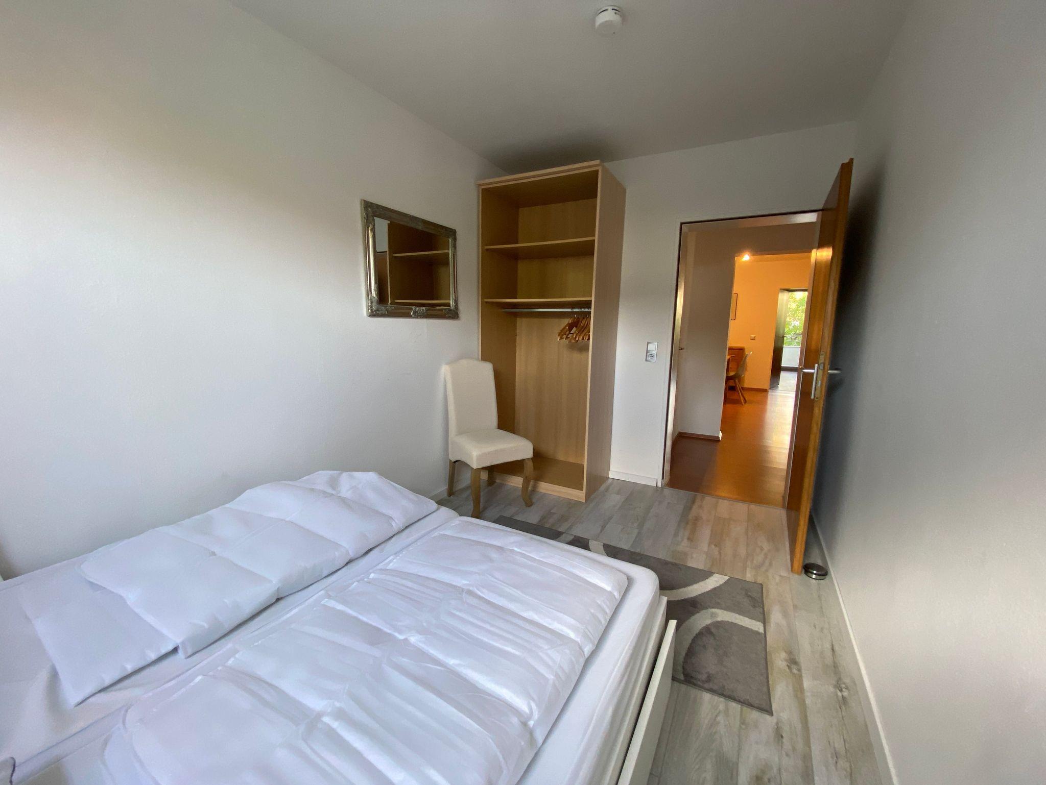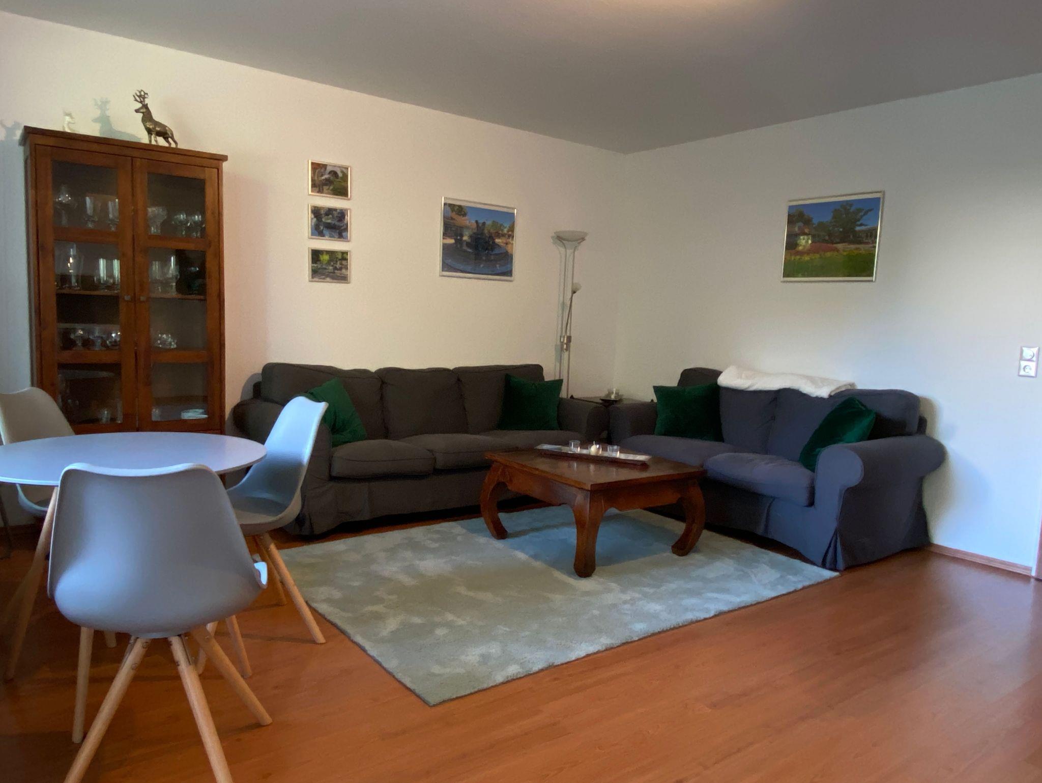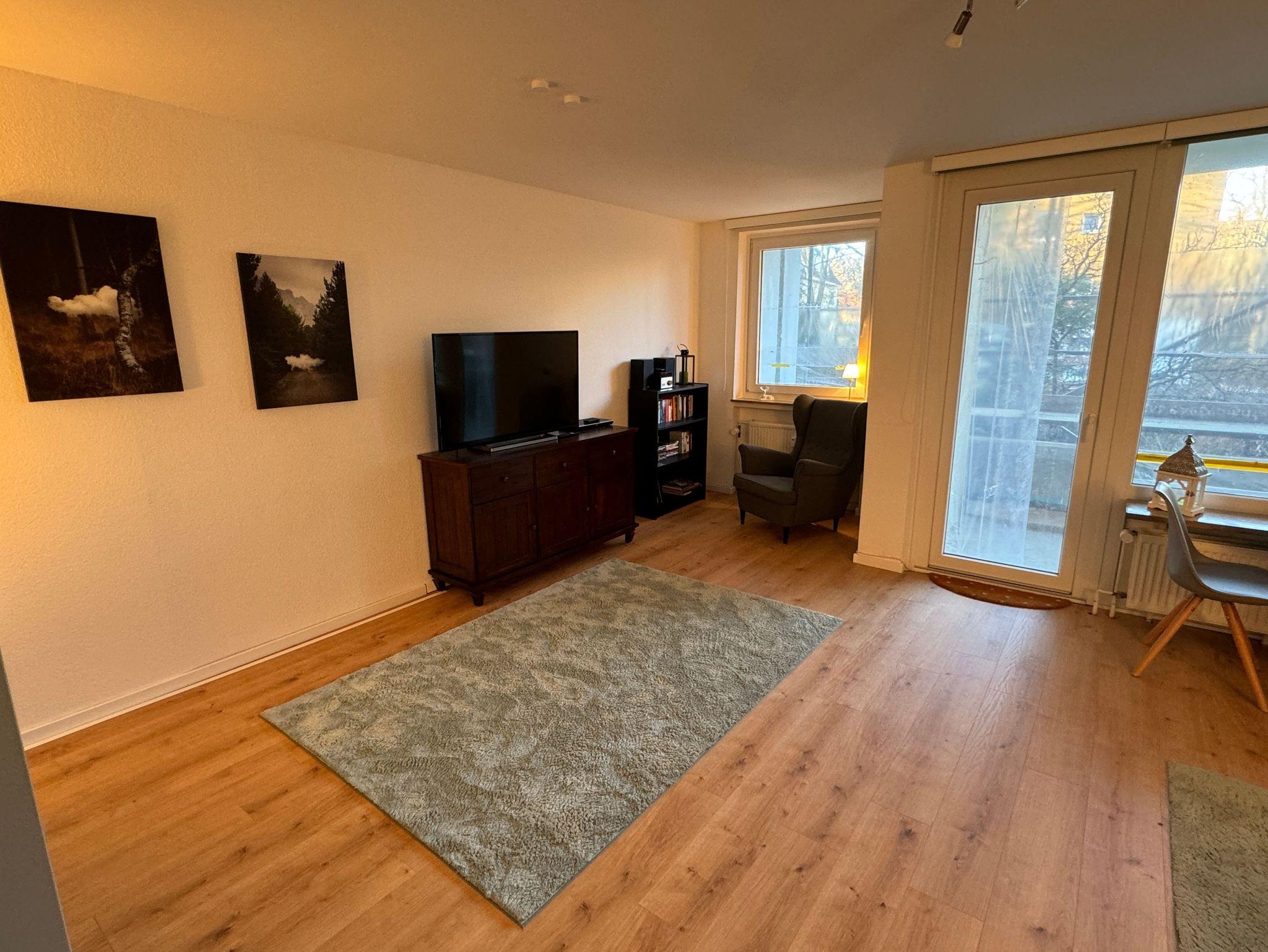 Die Wohnung verfügt über zwei Schlafzimmer, eine Essdiele, eine offene Küche, ein großes Wohnzimmer mit einem Schrankbett, ein Hauptbad, ein weiteres WC und einen Balkon. Die Wohnung befindet sich im Hochparterre und ist barrierearm.