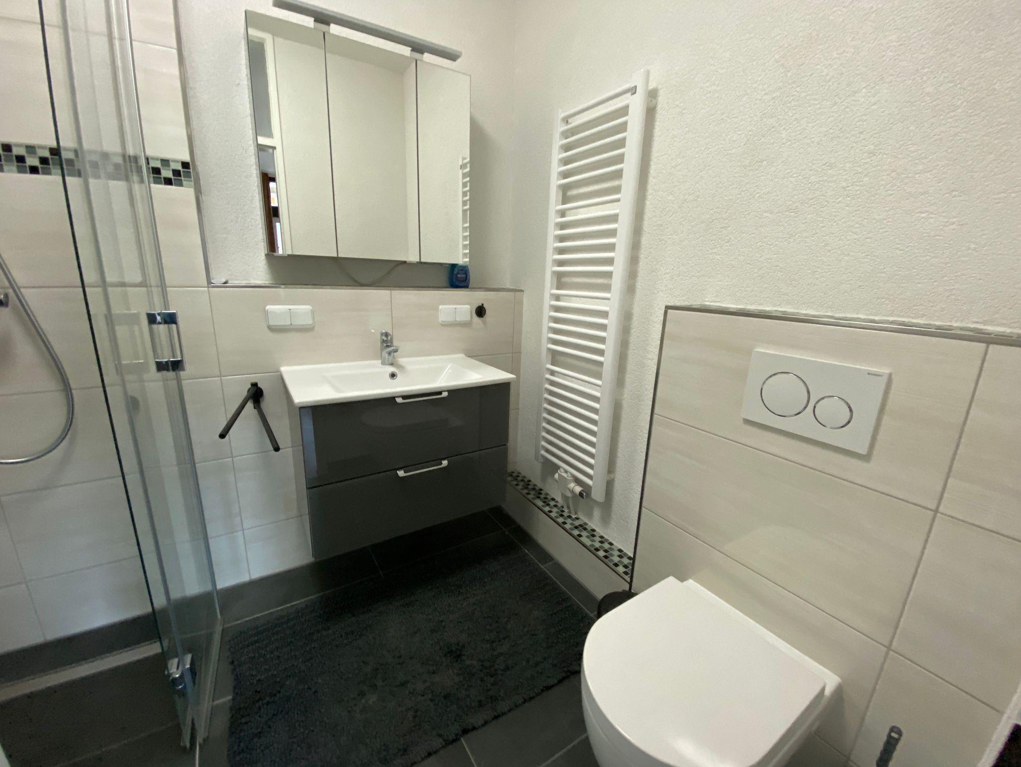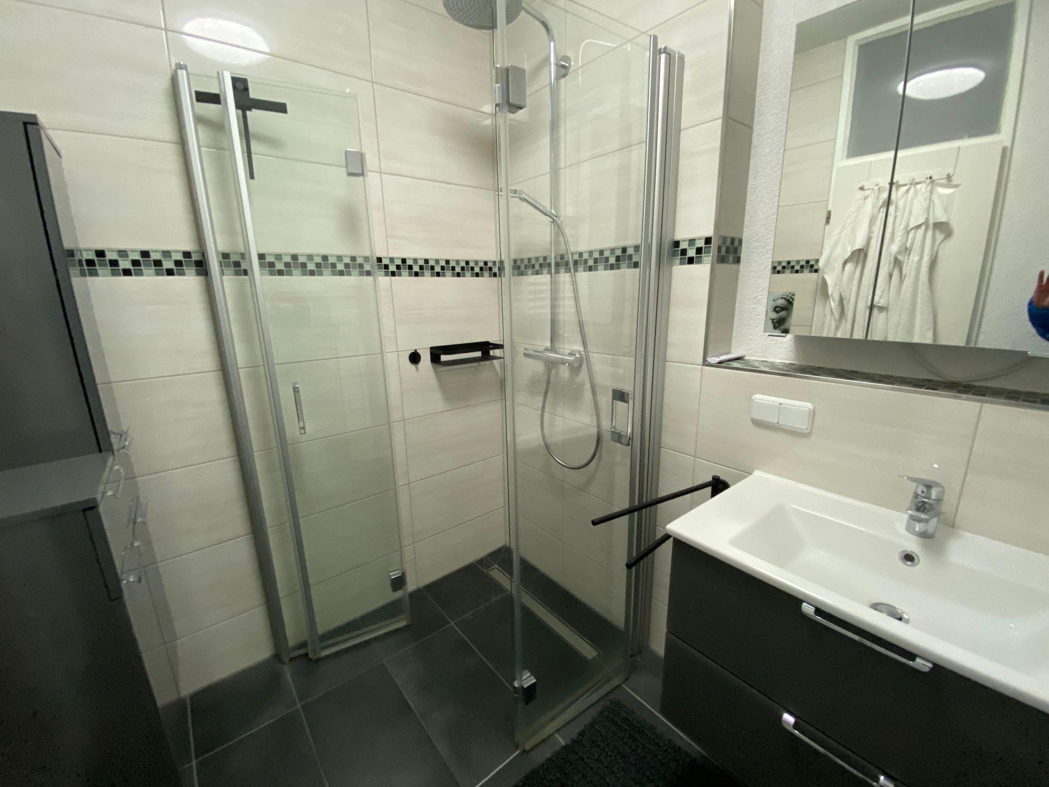 Aus dem Wohnbereich kommt man zum Haupt-Bad, welches für Wellness und Wohlfühlen stehen soll. Eine geräumige, Bodenebene Dusche bietet eine Regendusche, als auch eine normale Brause an. WC, Waschbecken und Möbel vermitteln hier unauffällige Eleganz. Alle Bäder sind in warmen Anthrazit und Weiß gehalten und stehen für Qualität.
