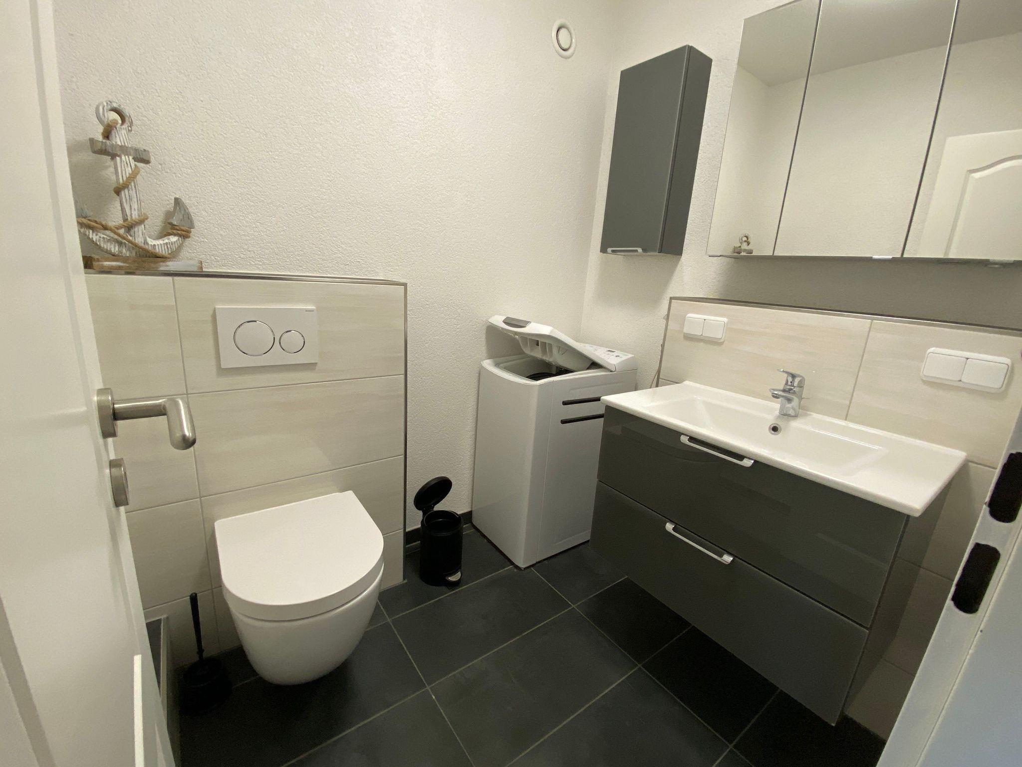 Direkt von der Küche und dem Flur geht das Gästebad mit WC, Waschbecken und Badmöbel ab, ebenfalls ist hier eine Waschmaschine untergebracht.