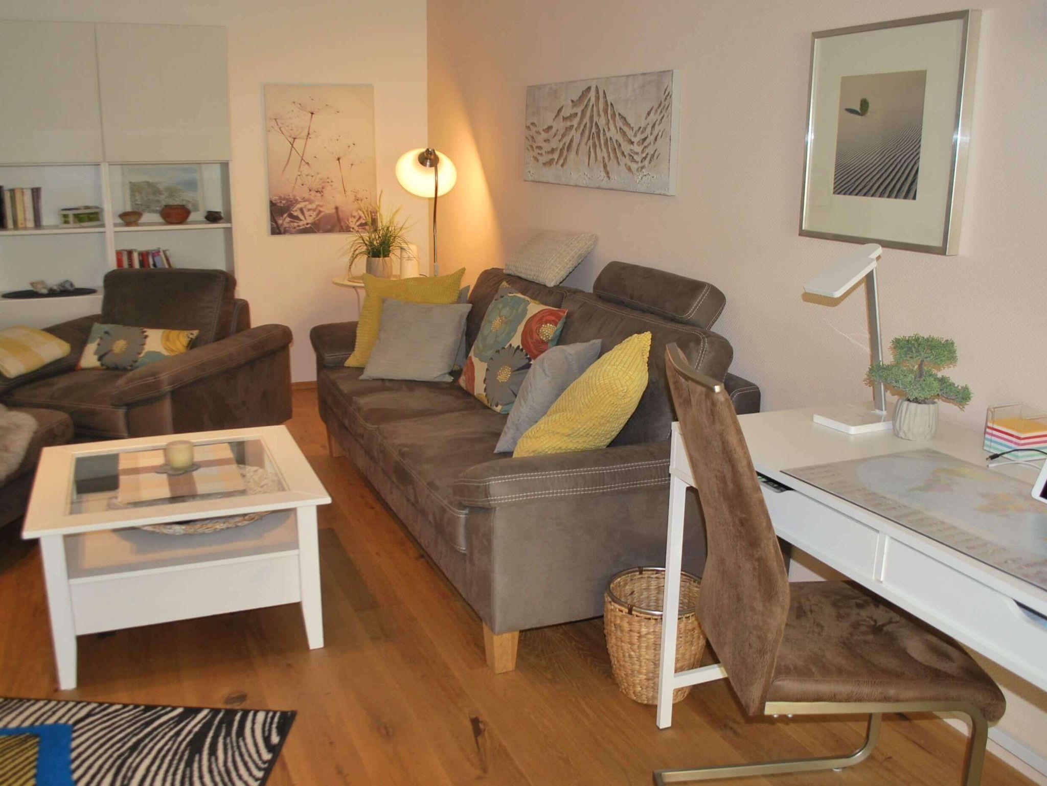 Im Wohnzimmer wartet eine moderne Couch und ein Sessel mit Fußhocker, ein Esstisch mit 4 Stühlen vor dem Balkonfenster, einen Schreibtisch, einen Flachbild-TV und eine Stereoanlage auf Sie.
