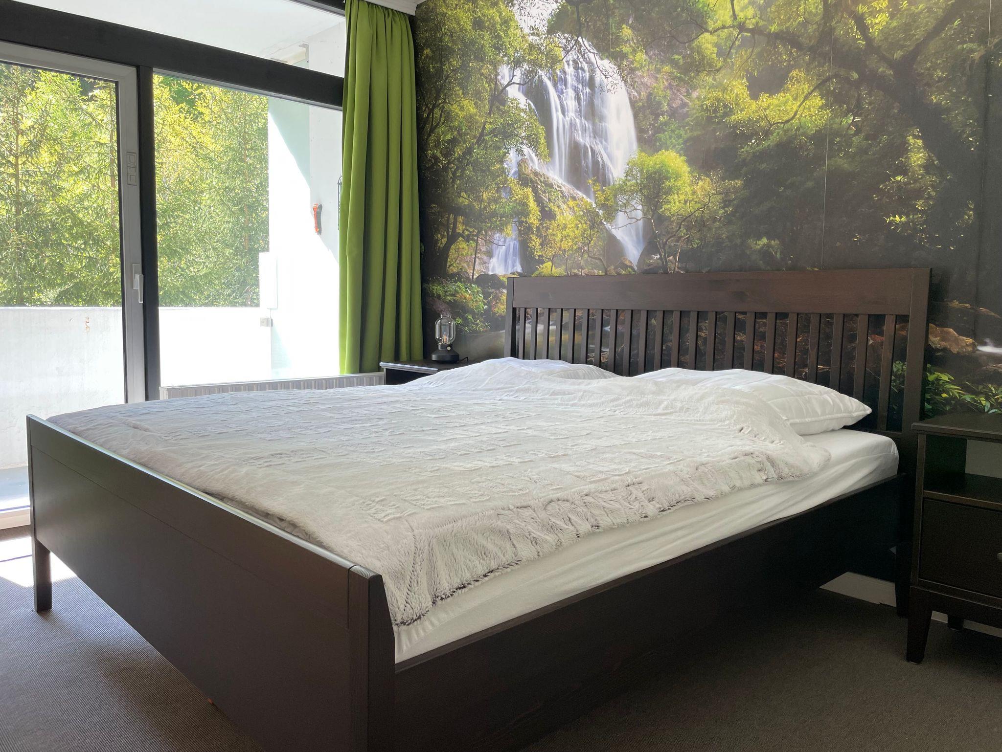 Das helle, gemütliche Wohnzimmer verfügt über ein Tagesbett (Einzel oder Doppelbett 2x80x200), Küchenzeile, Essbereich und einen schönen Blick ins Grüne. Die neue Einbauküche ist mit Geschirrspüler, Backofen, 2 Platten-Kochfeld, Gefrierfach und Kochutensilien ausgestattet. Vom Schlafzimmer mit dem großen Doppelbett (180x200), TV und Kleiderschrank gelangen Sie auch auf den Balkon.