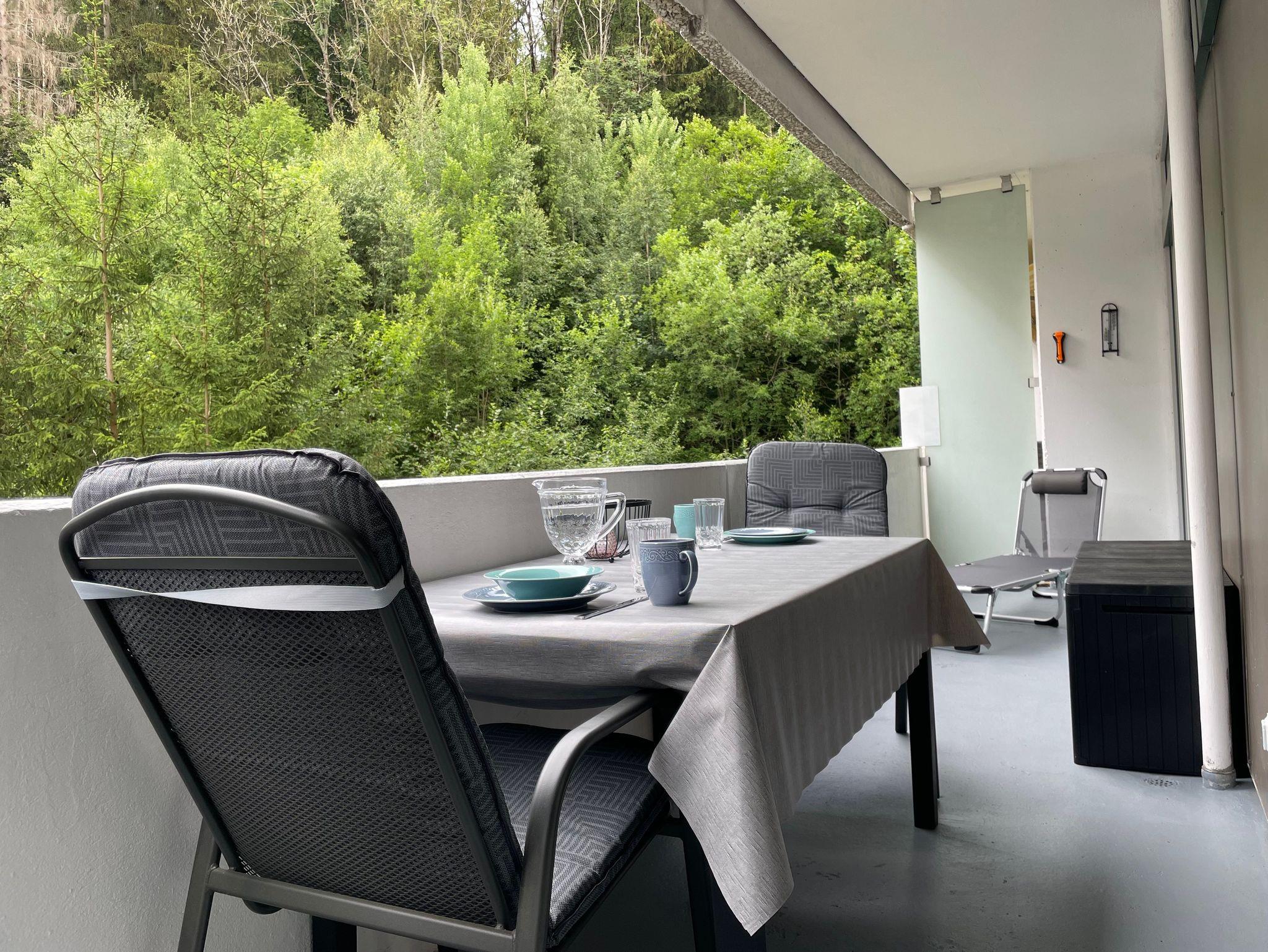 Der sonnige Balkon ist mit Gartenmöbel ausgestattet.
