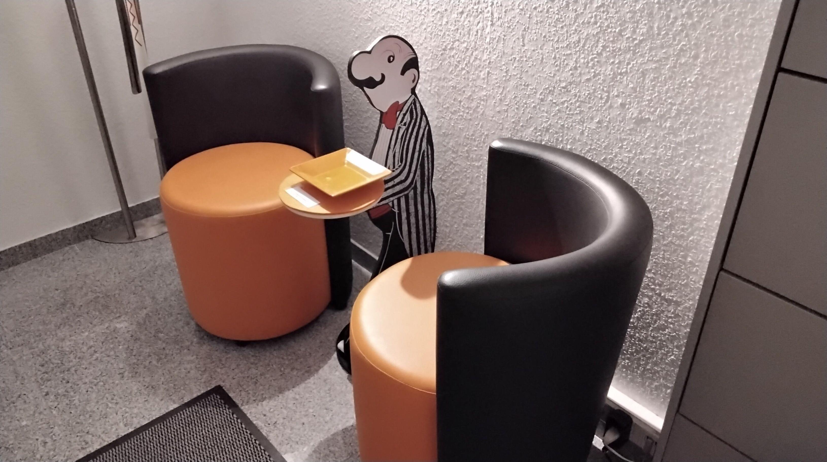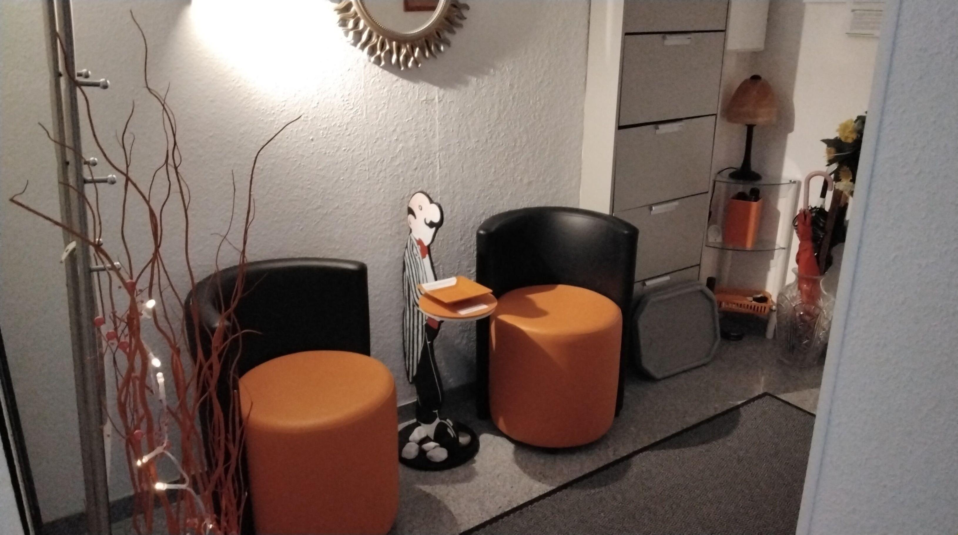 Flur mit Schuhschrank , großem Spiegel und Garderobenständer, zwei schöne Sessel sowie WLAN und Schuhputzmittel sowie Gästepantoffeln und Schuhschalen zum ablegen von getragene Schuhe.