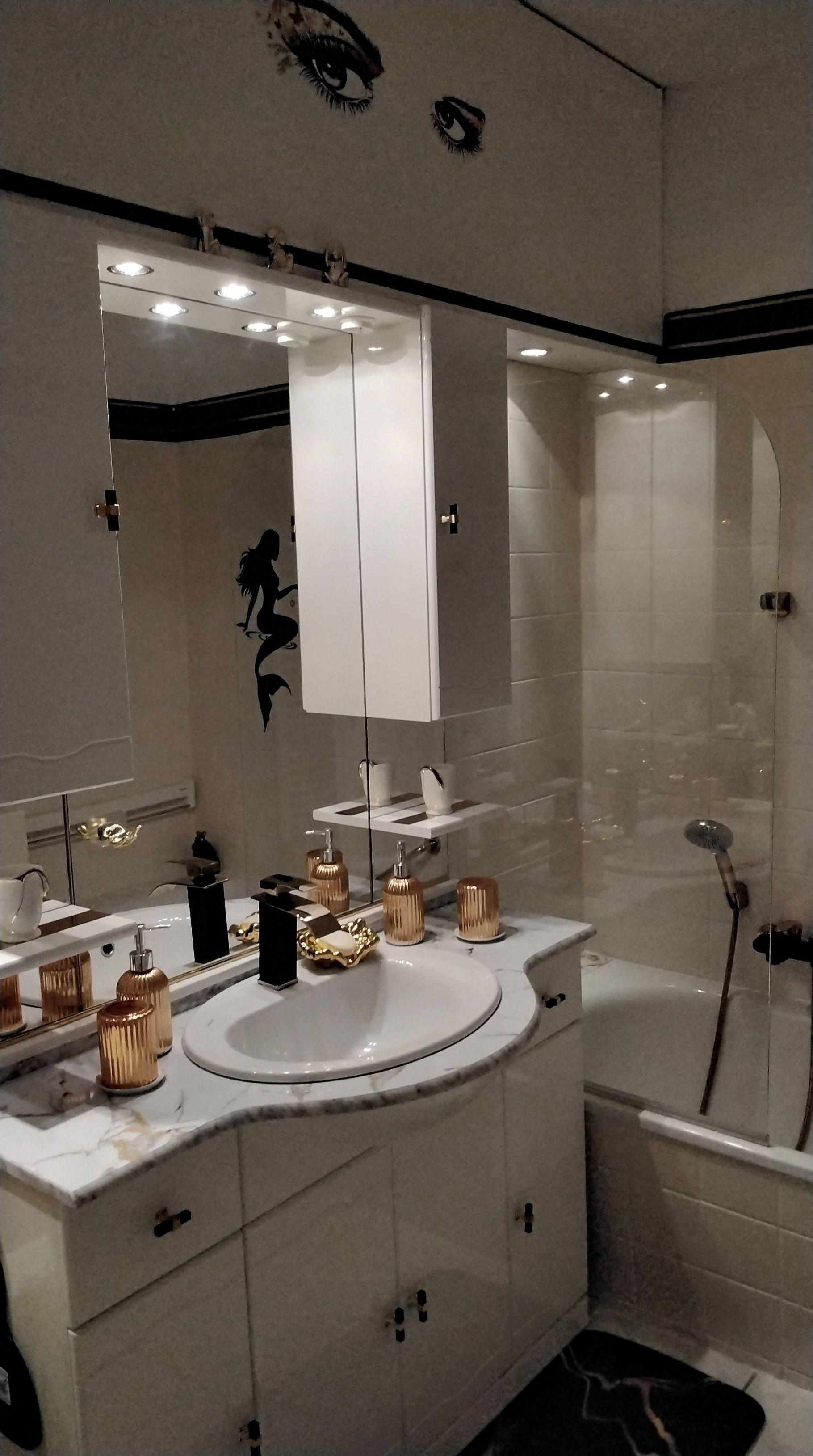 Bad mit Badmöbel und Spiegel ,Waschtisch mit Marmor ,Handtuchheizkörper ,Glas - Duschwand eine Badewanne sowie ein Hänge - WZ und Glasregal zur Ablage für kosmetische Artikel.