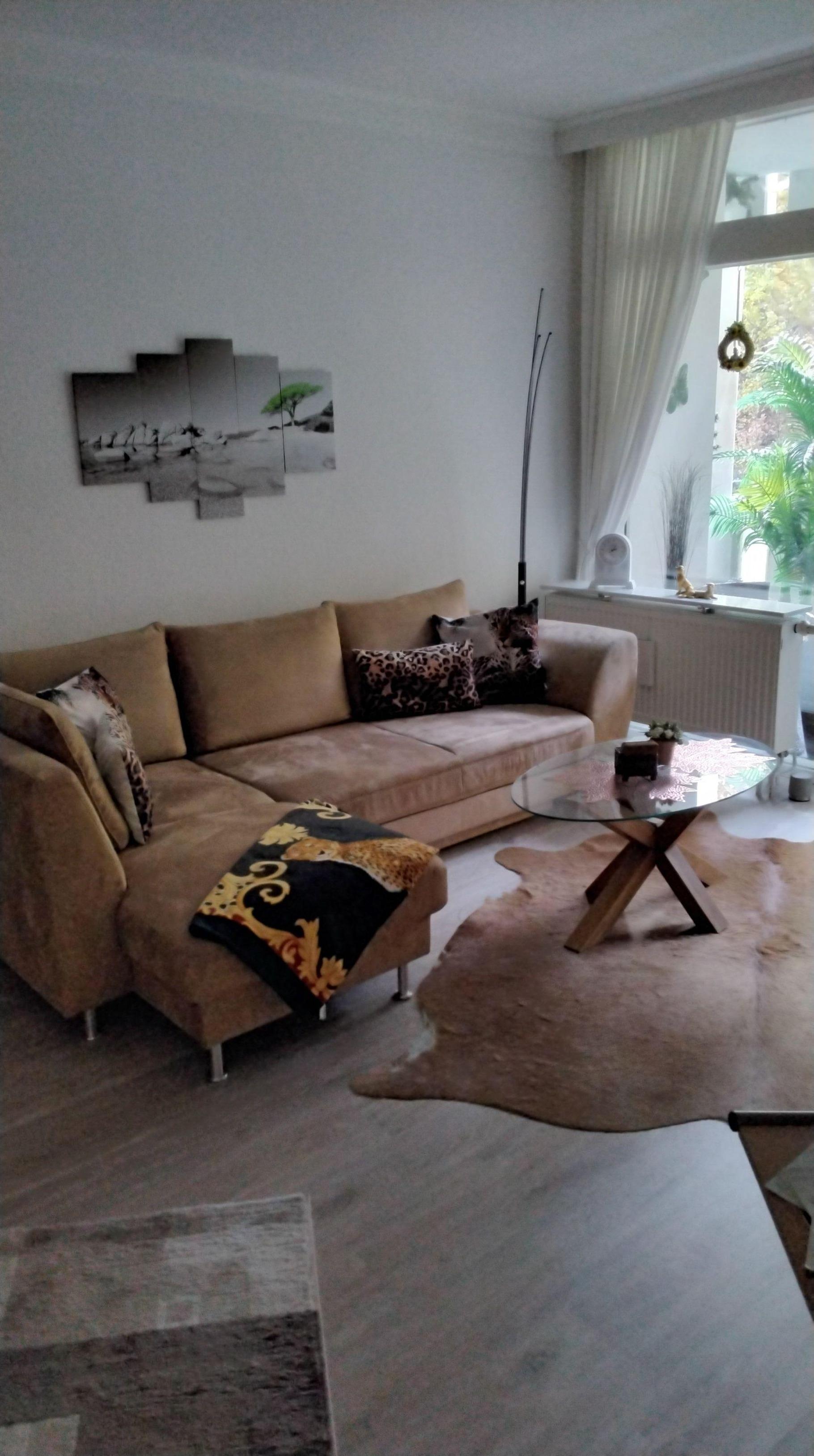 Das Wohnzimmer ist mit einer Couch und einem Glastisch versehen ,der auf einem Fell platziert ist.