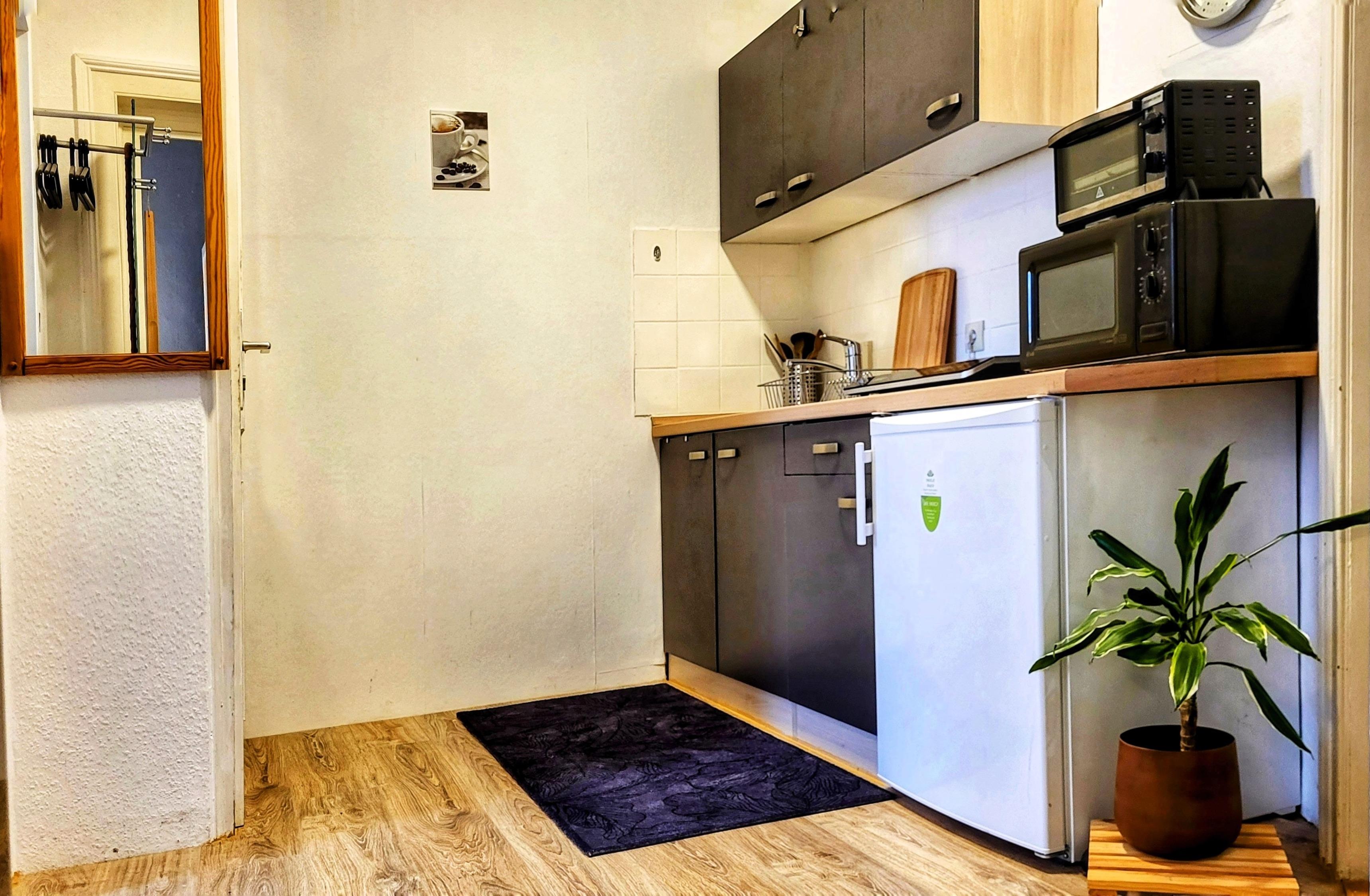 In der Wohnung eingetreten, erwartet Sie ein Flur mit integrierter Küchenzeile. Wohnzimmer, Schlafraum und Badezimmer gehen vom Flur aus ab. Alle Räume bieten reichlich Platz und sind jeweils mit großzügigen Fenstern ausgestattet, wodurch diese sehr hell und freundlich wirken.