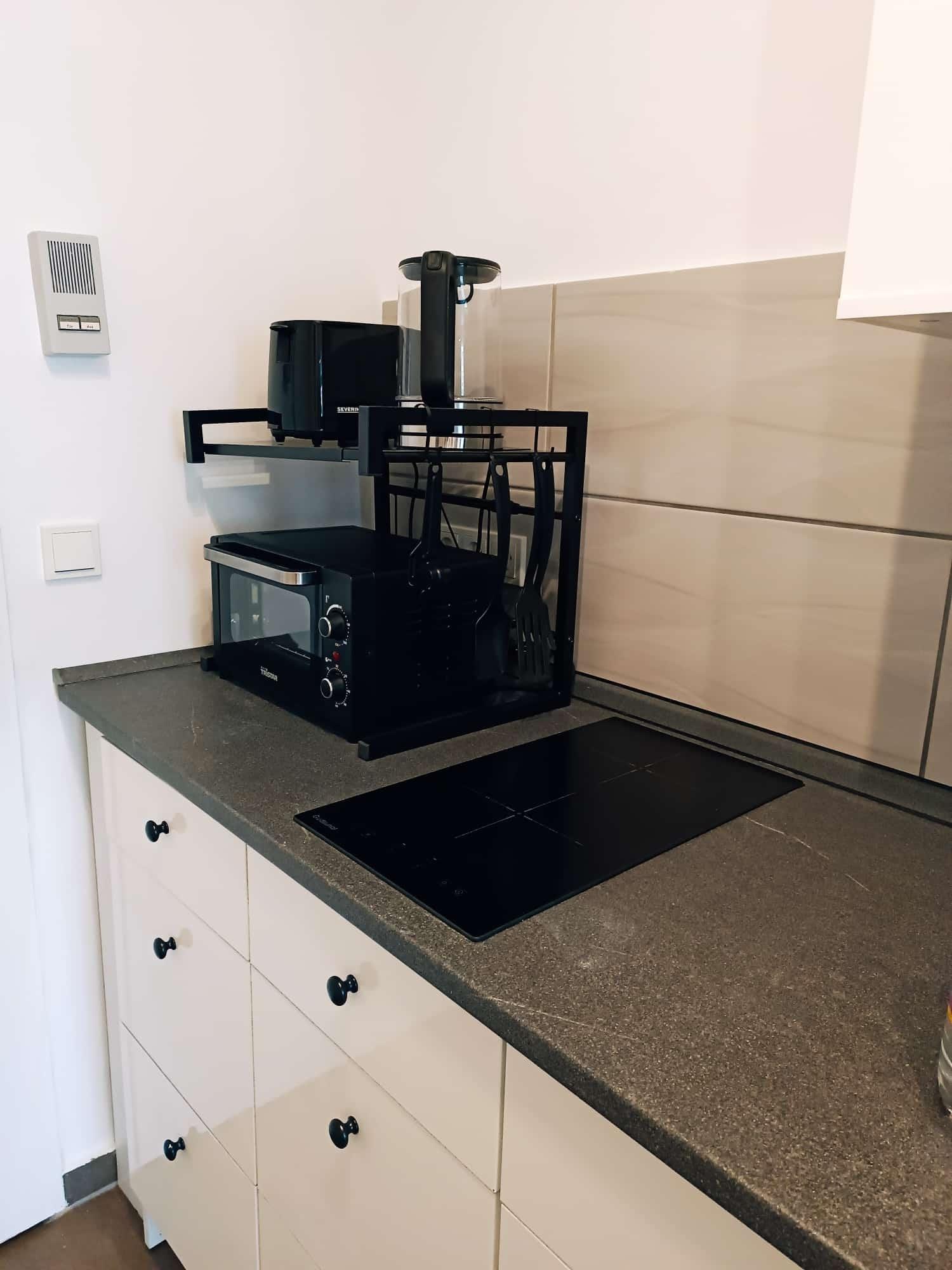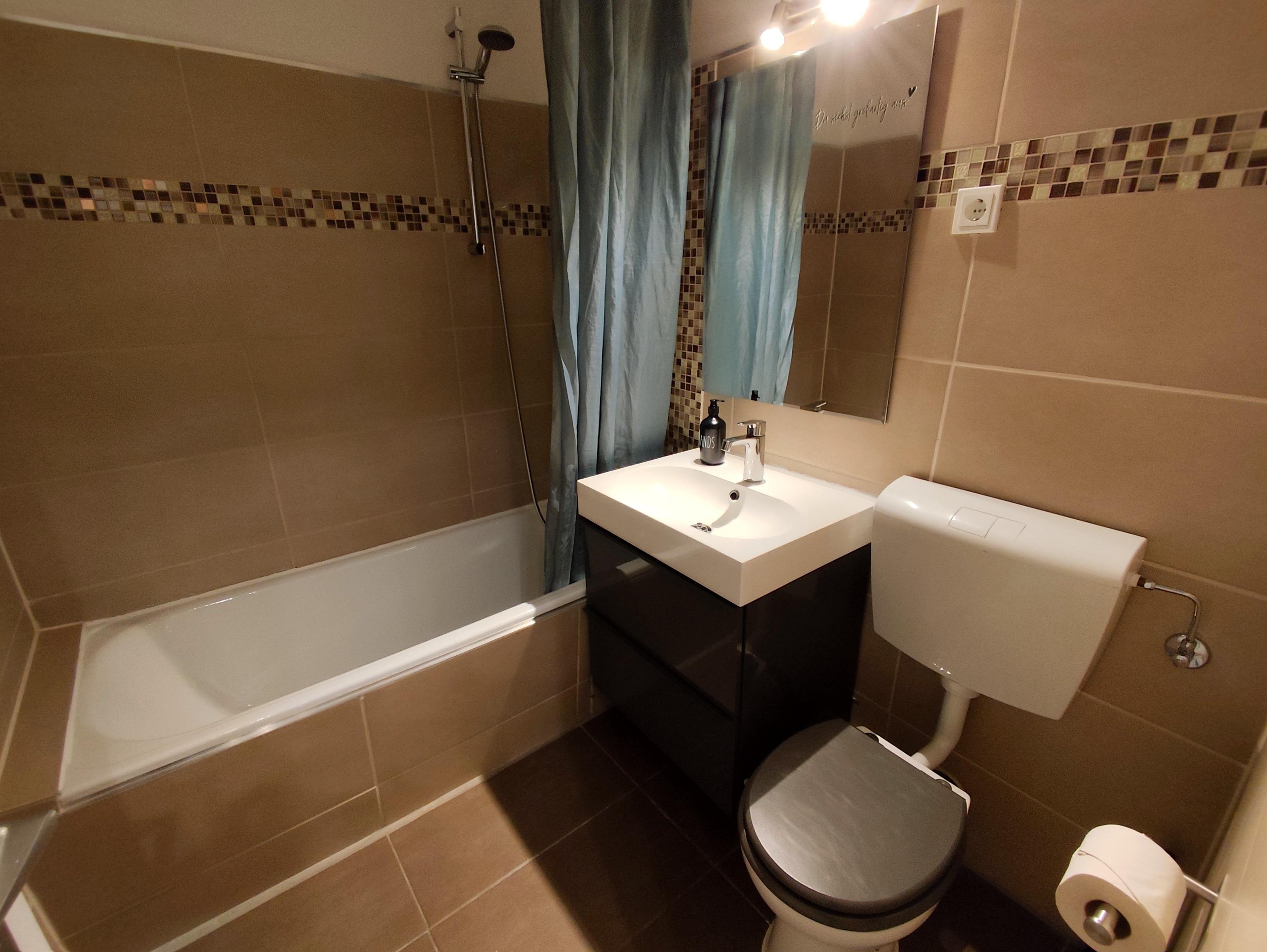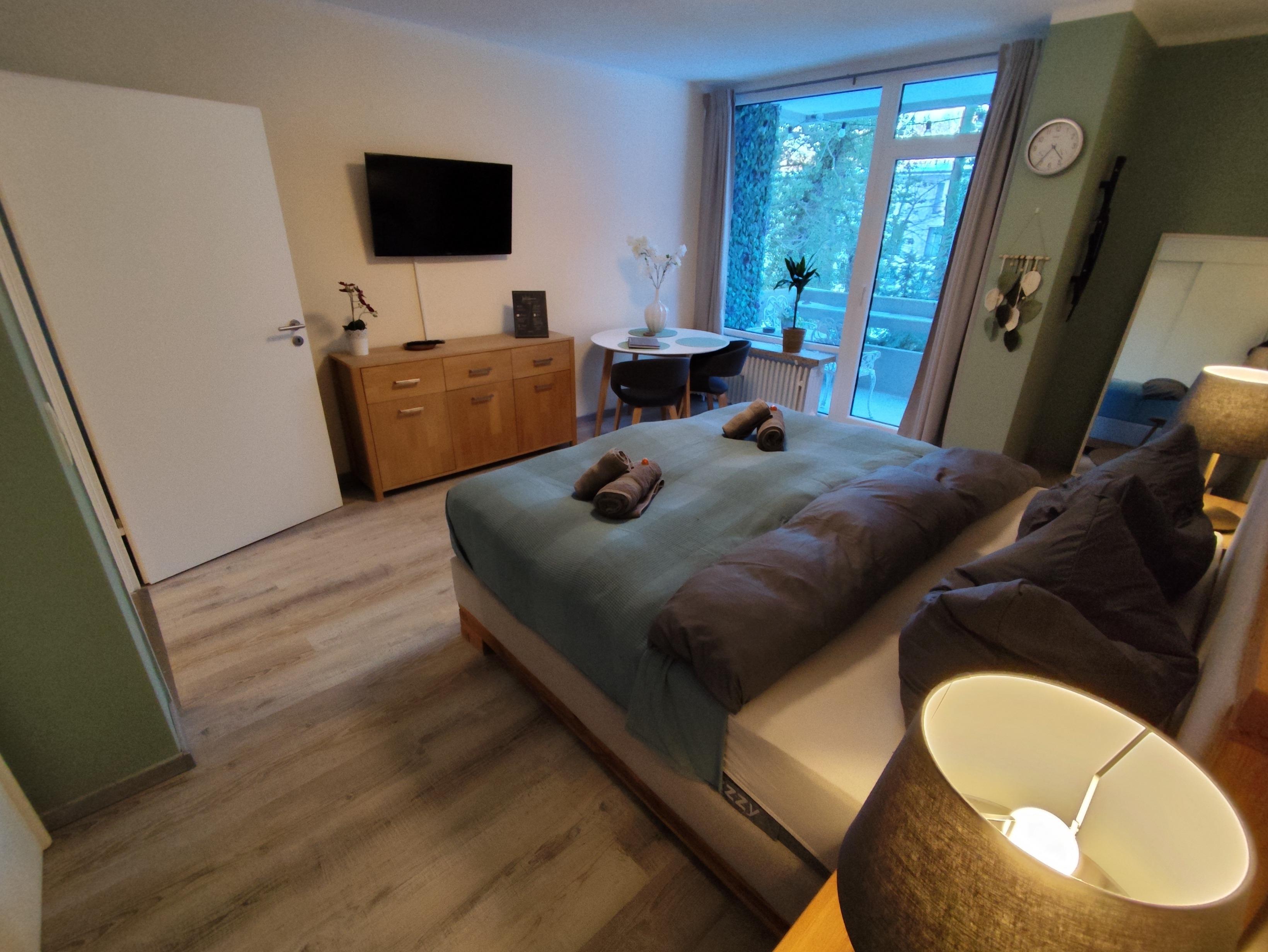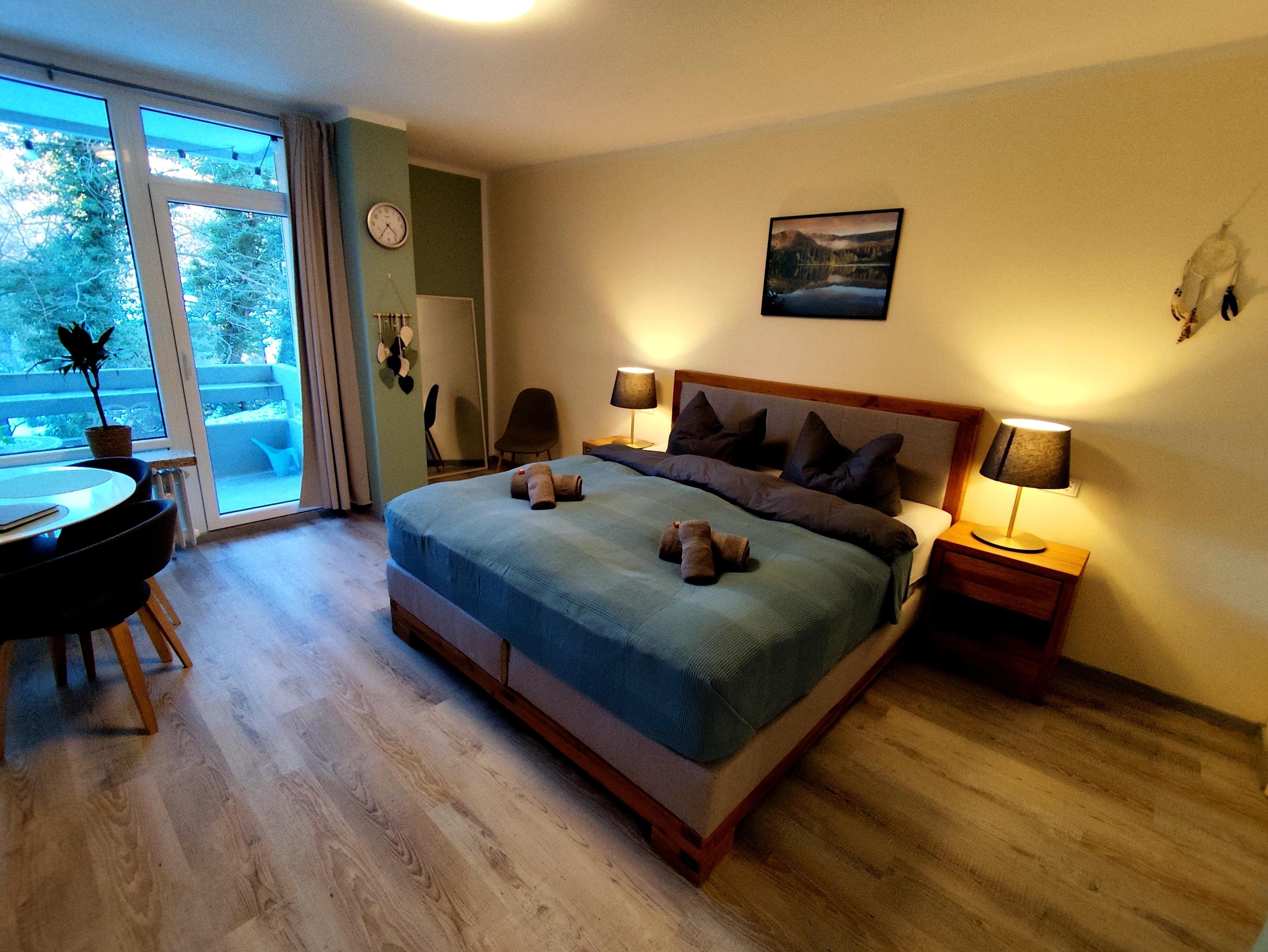 Die Einraumwohnung bietet ein modernes Boxspringbett für erholsamen Schlaf sowie einen Balkon mit einem herrlichen Blick auf die umliegenden Bäume und Berge. Eine voll ausgestattete Küche mit Kochplatten, Kühlschrank, Mikrowelle, Toaster, Wasserkocher und Minibackofen steht Ihnen zur Verfügung. Außerdem sind Bettwäsche und Handtücher im Preis inbegriffen. Für zusätzlichen Komfort gibt es einen eigenen Parkplatz, einen Fahrradraum sowie eine gebührenpflichtige Waschmaschine im Keller.