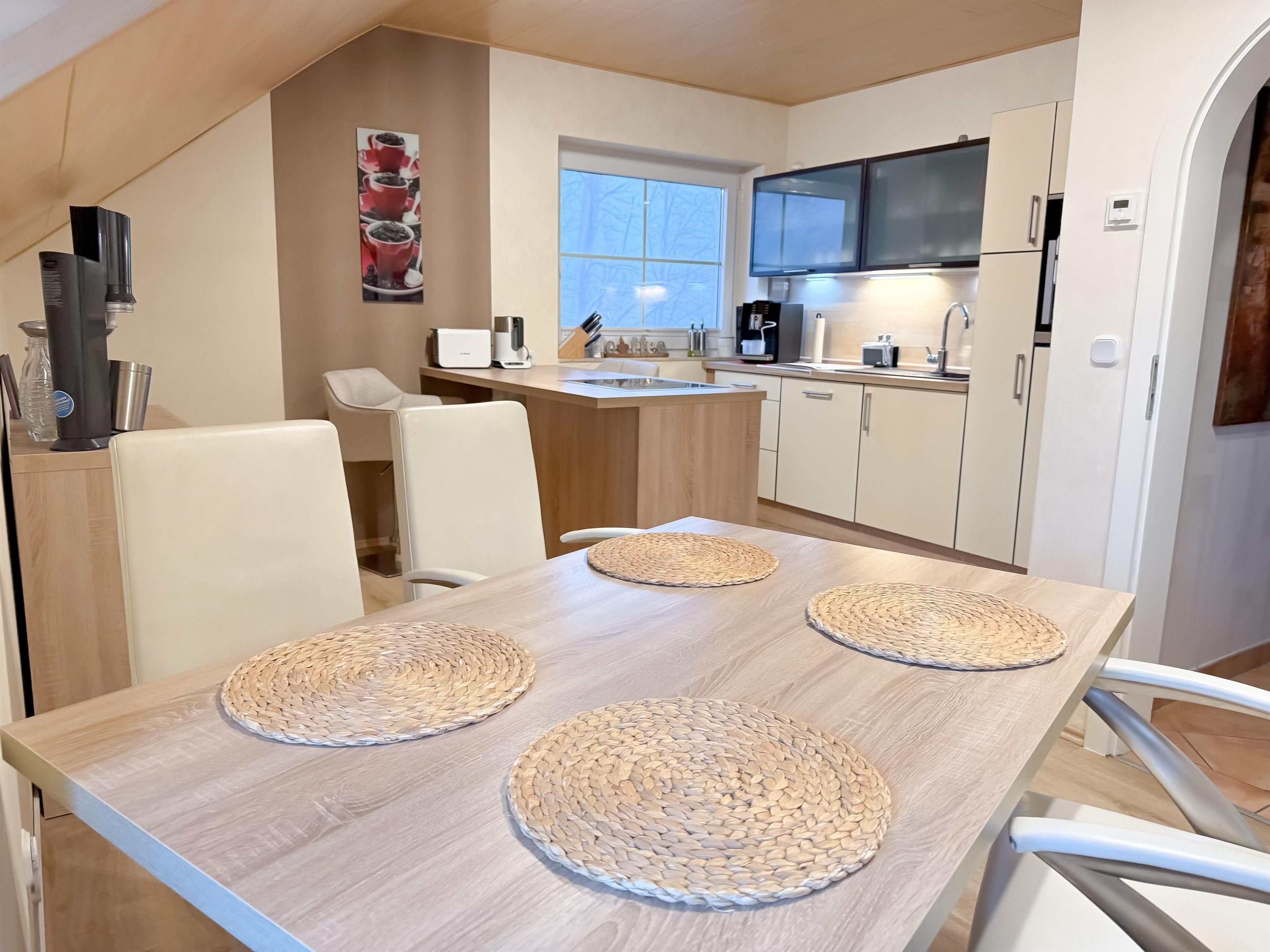 Die voll ausgestattete Küche mit Kochinsel und Jura Kaffeevollautomat verleiht Ihrem Aufenthalt eine genussvolle Note und macht das Frühstück zu einem kleinen Urlaubsmoment.