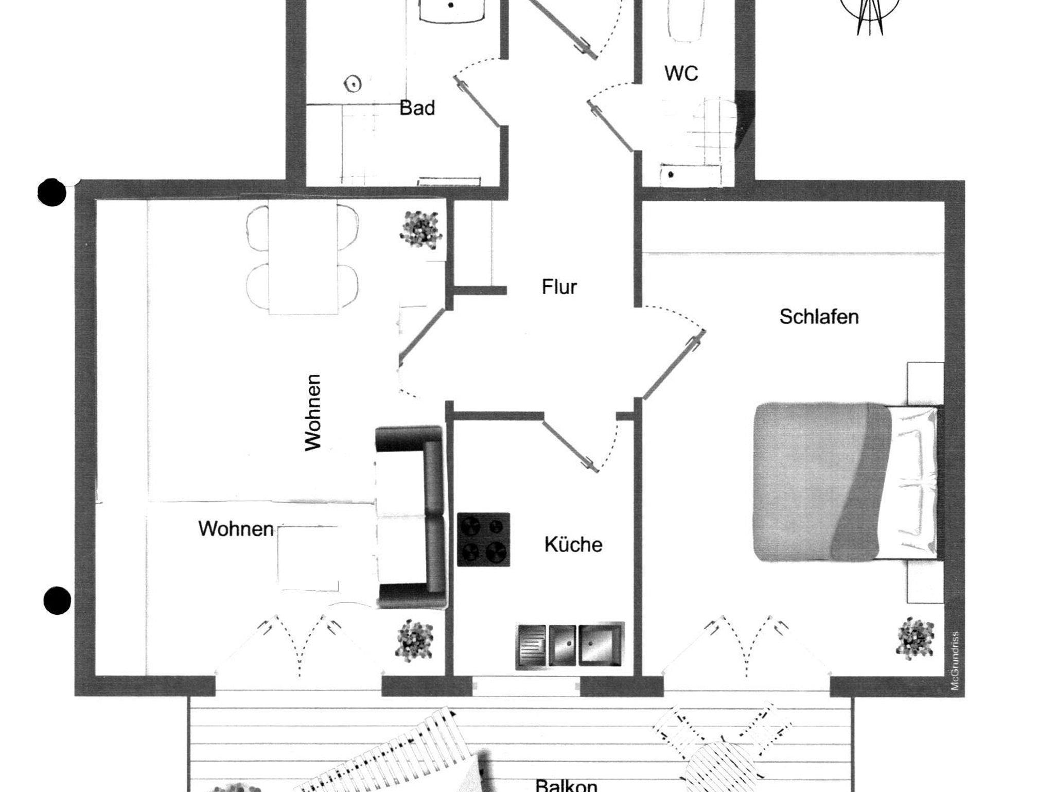 Im gemütlichen Wohn-/Eßzimmer finden Sie einen Flachbildfernseher+Kabel+WLAN-Anschluss,DVD-Player,Stereo-Radioanlage mit CD Player+ Kassettenrecorder,Bücher und Gesellschaftsspiele+Multi-Funktionscouch.Die Küche ist mit Spülmaschine,Backofen nebst Grill,Kaffeemaschine, Wasser- und Eierkocher sowie Toaster und ausreichend Besteck+Töpfen bestückt. Im Schlafzimmer können Sie gerne bei Bedarf unser Babybett dazustellen. Das Bad ist saniert und modern.Das WC ist in einem separater Raum.