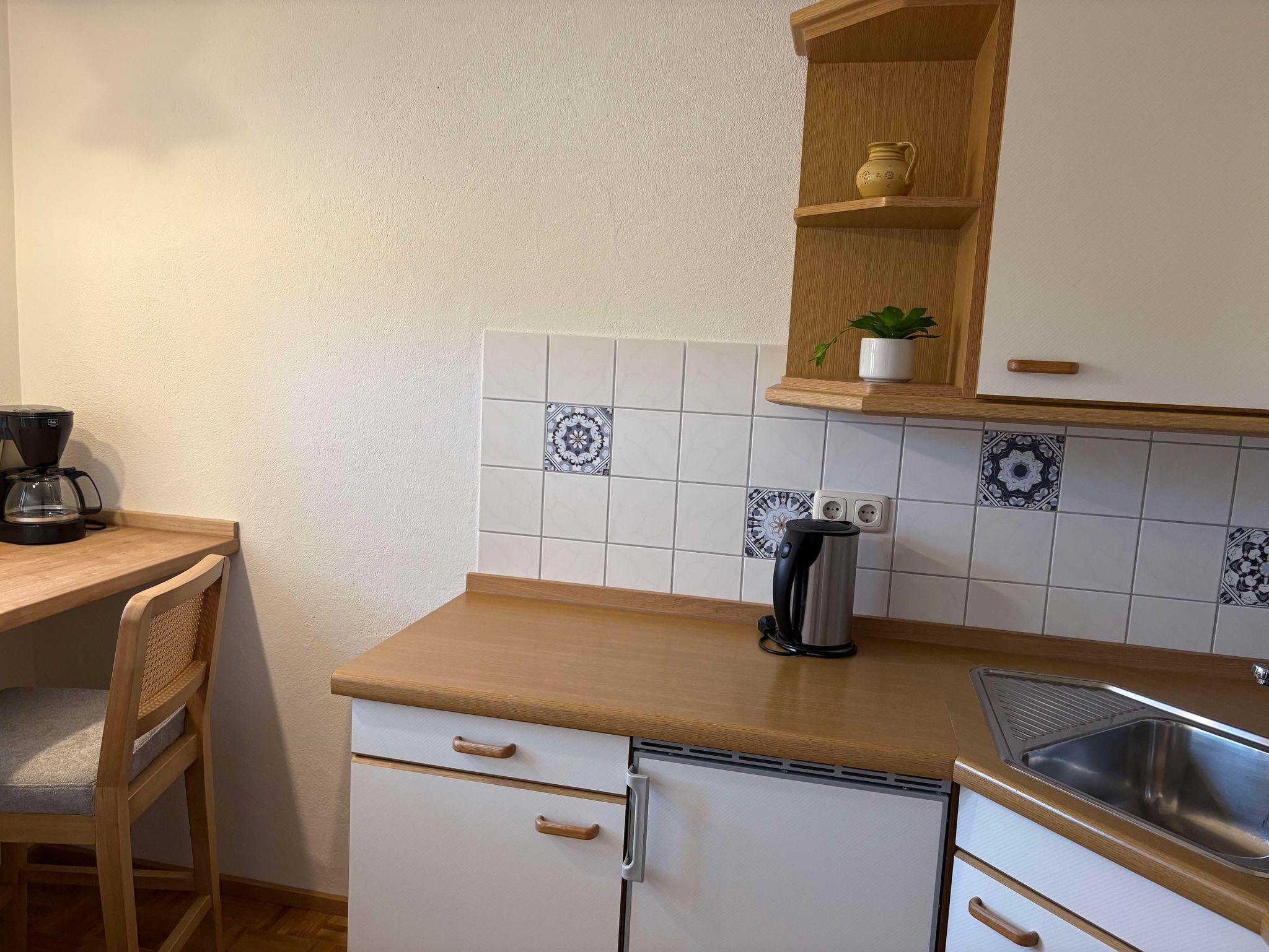 Die Küche ist mit einen 3-Platten-Herd, Backofen, Kühlschrank mit Eisfach, Kaffeemaschine, Wasserkocher, Eierkocher, Toaster und komplett mit Geschirr ausgestattet.