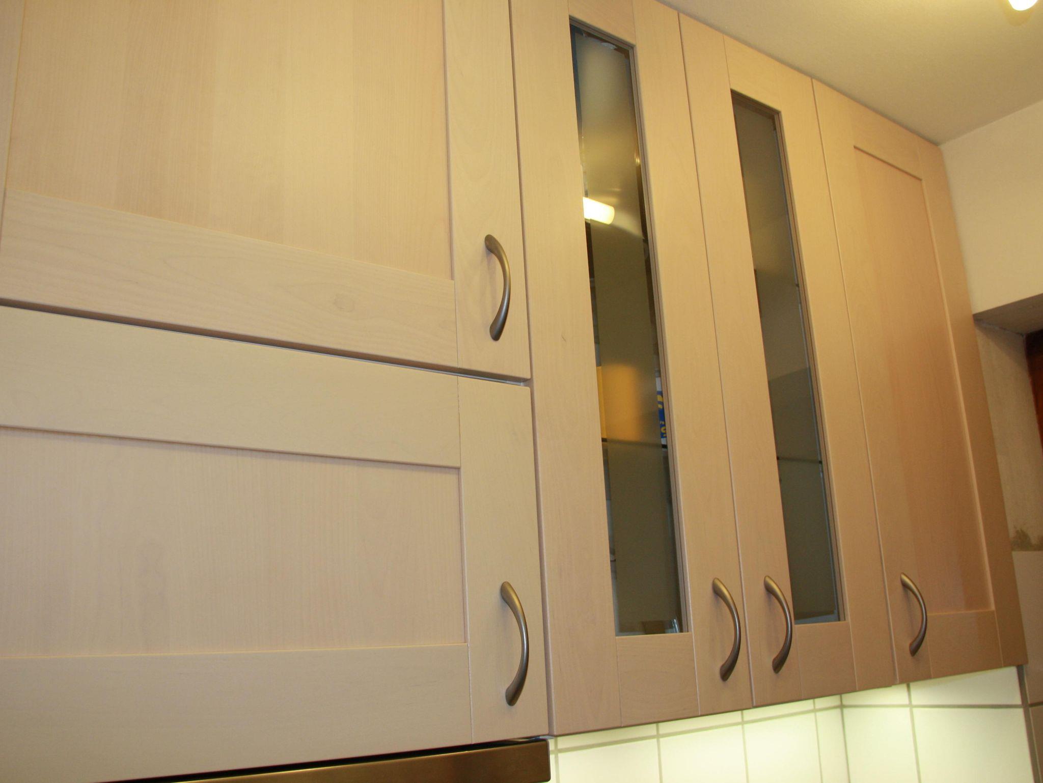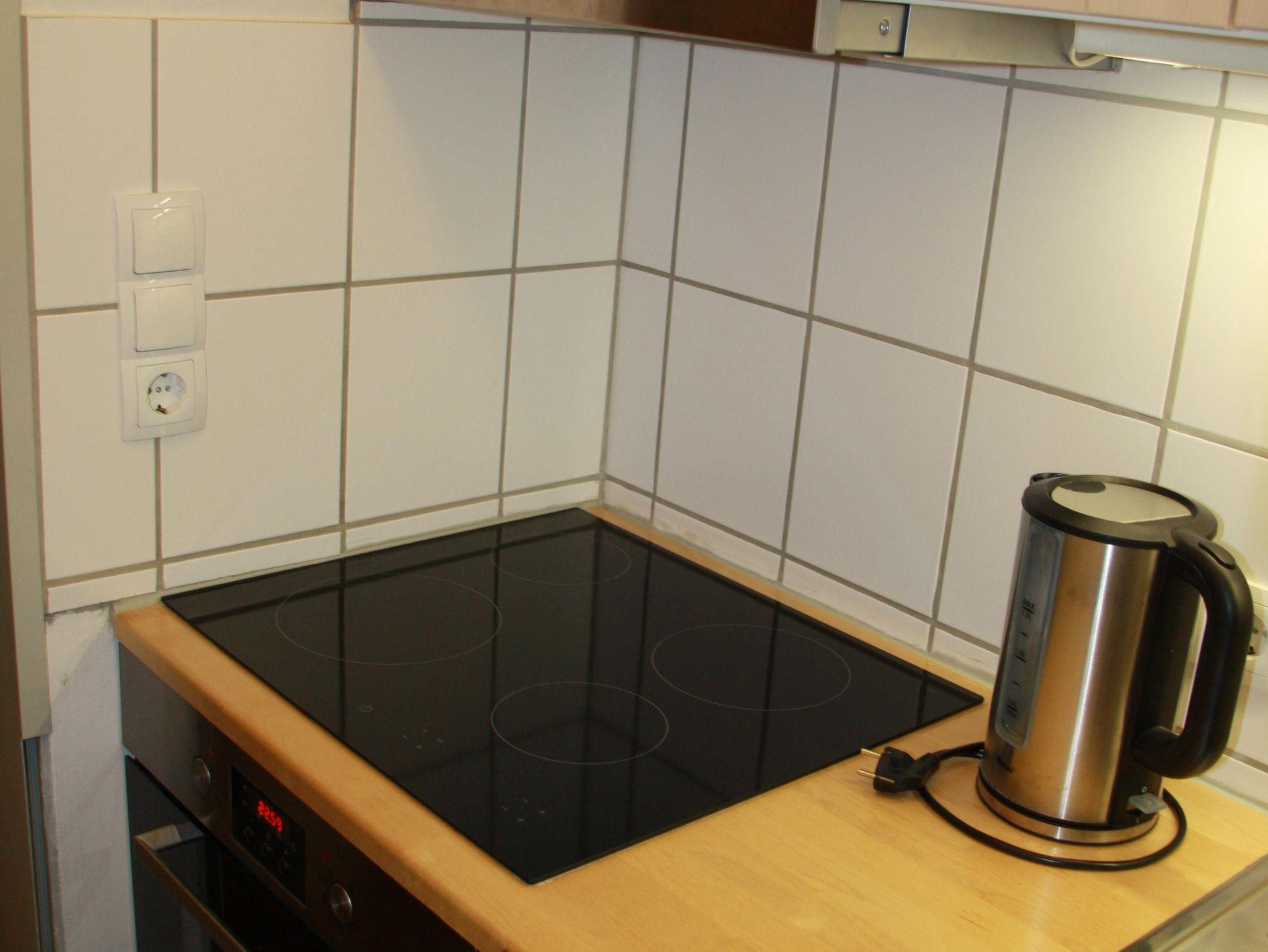 * Küche: Herd mit vier Kochplatten, Backofen, Dunstabzugshaube, Spüle, Kühlschrank mit Eisfach, Wasserkocher, Toaster, Eierkocher, Frenchpress, Geschirr, Kochutensilien