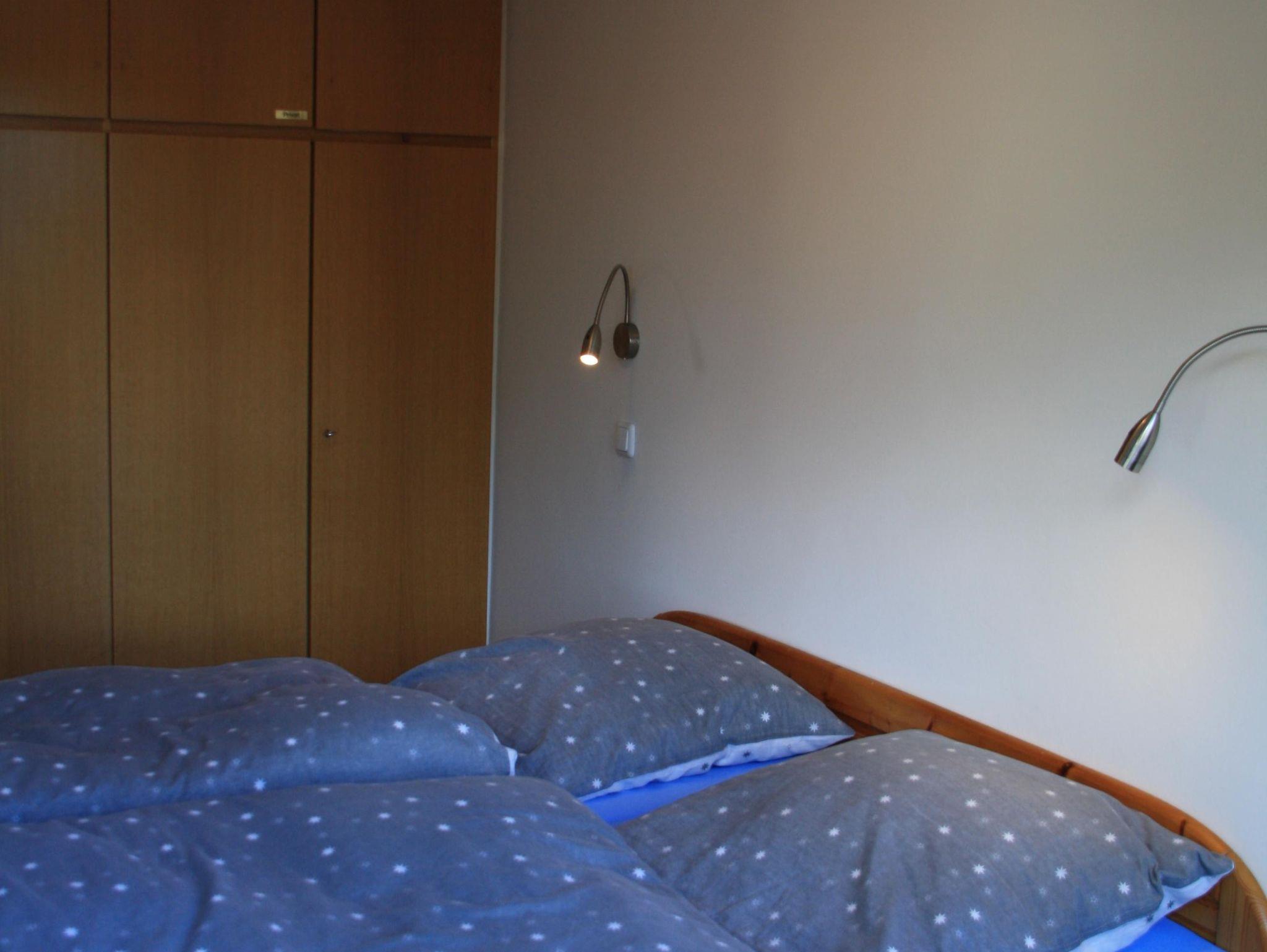 * Schlafzimmer (Parkett), abgetrennt durch Wand mit Durchgängen, Doppelbett, dimmbare Leselampen, deckenhoher Schrank