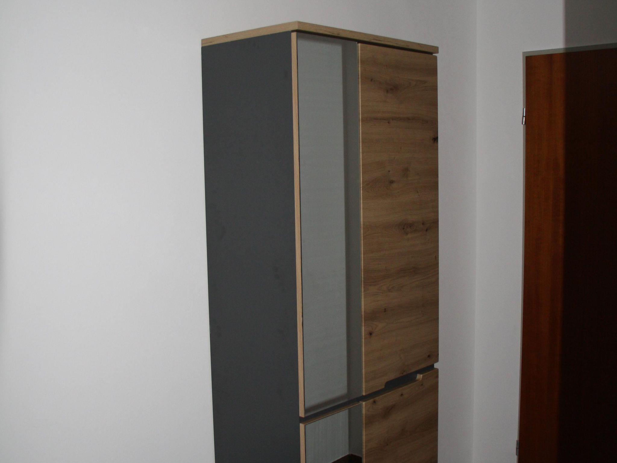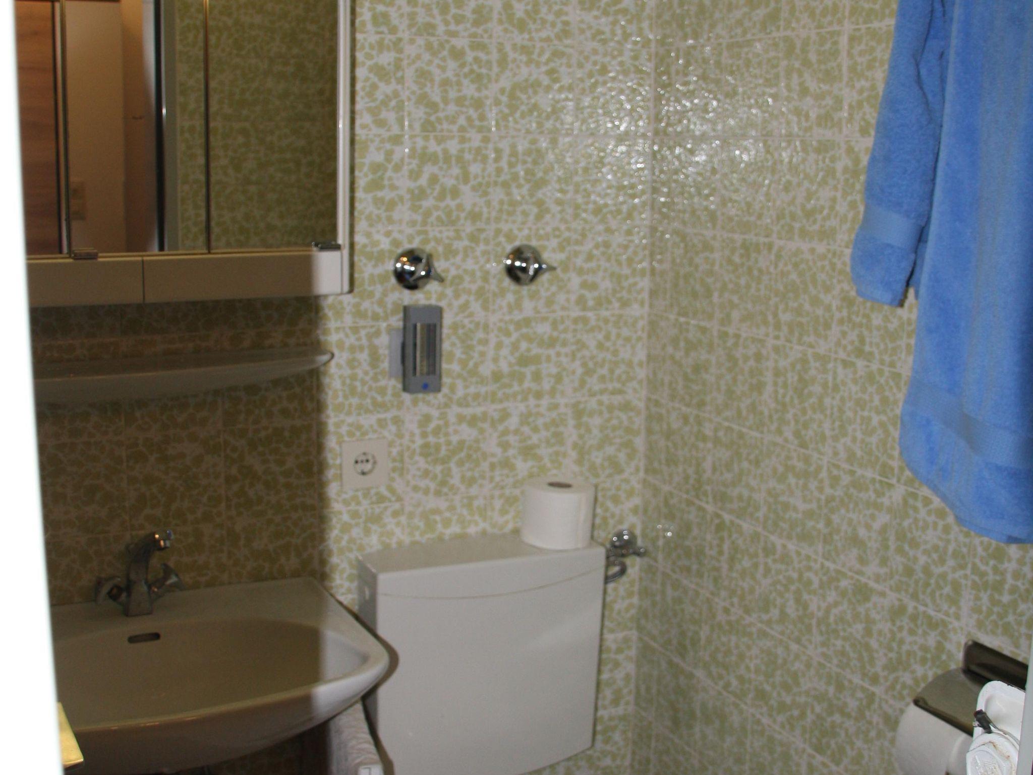 * Bad mit Charme der Siebzigerjahre: Badewanne mit Regendusche, Waschbecken, Badschrank, Toilette