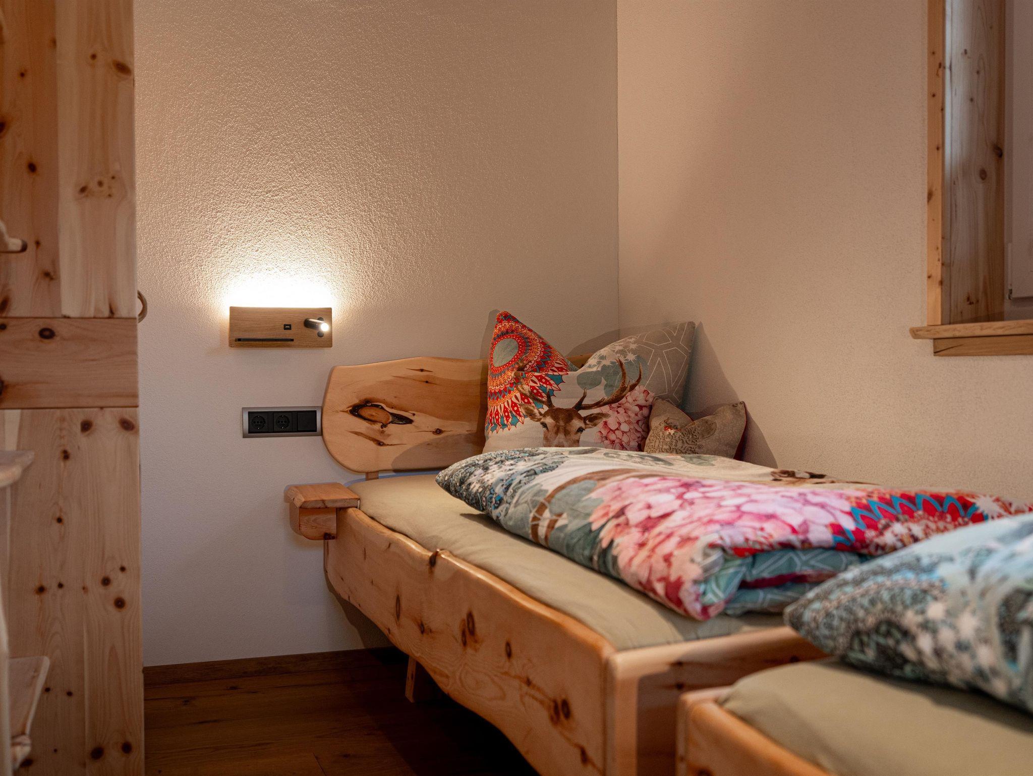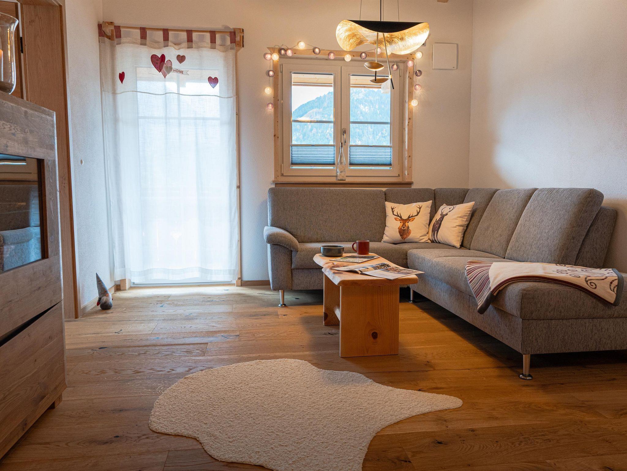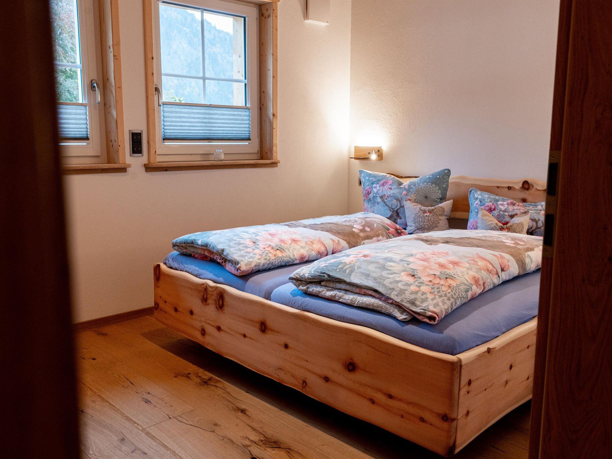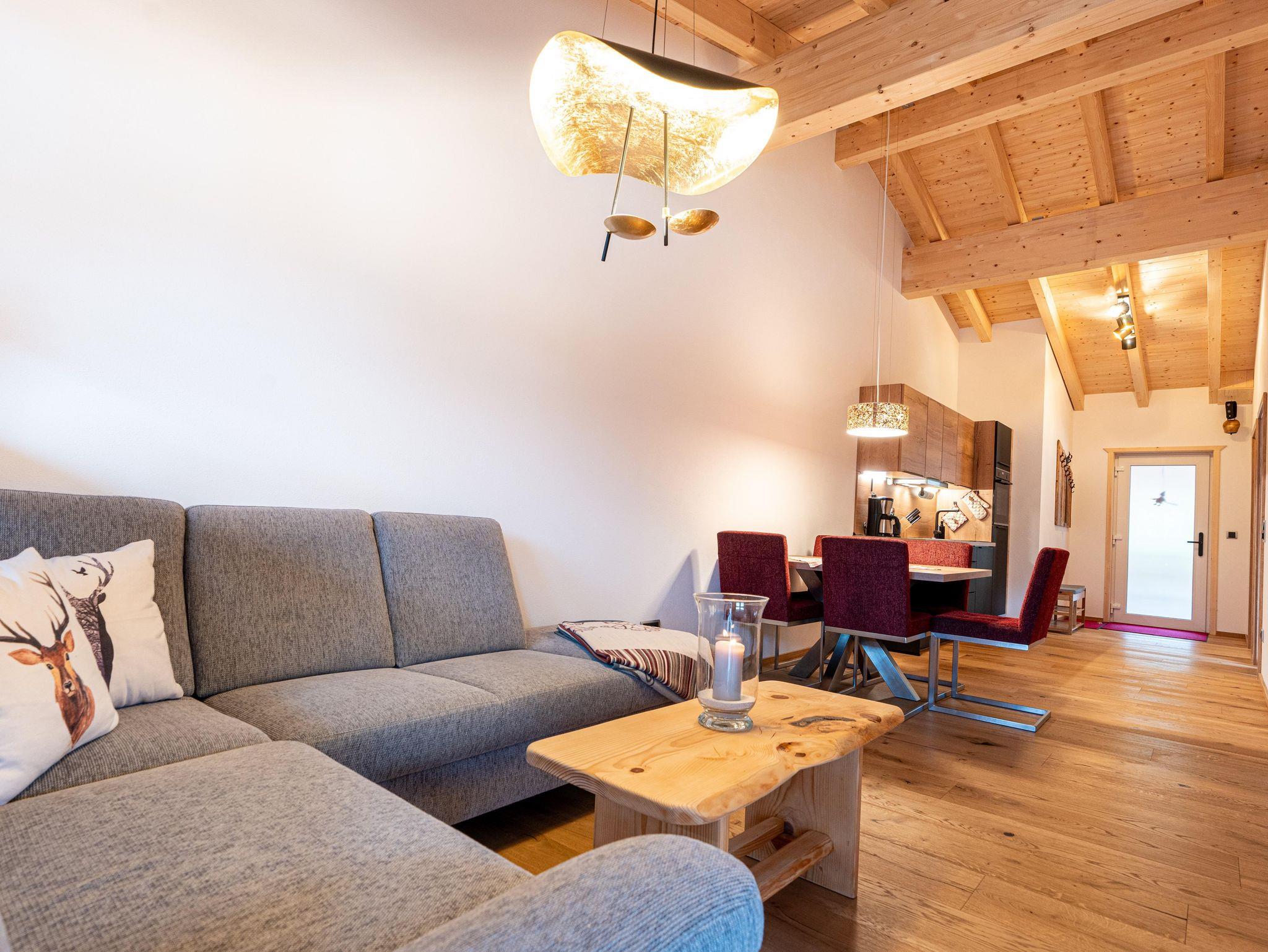 Großzügiges Apartment für 4 Personen mit offenem Wohnbereich, 2 Schlafzimmern mit Doppelbetten aus Zirbenholz und 180-Grad-Balkon für Sonnengenuss pur.