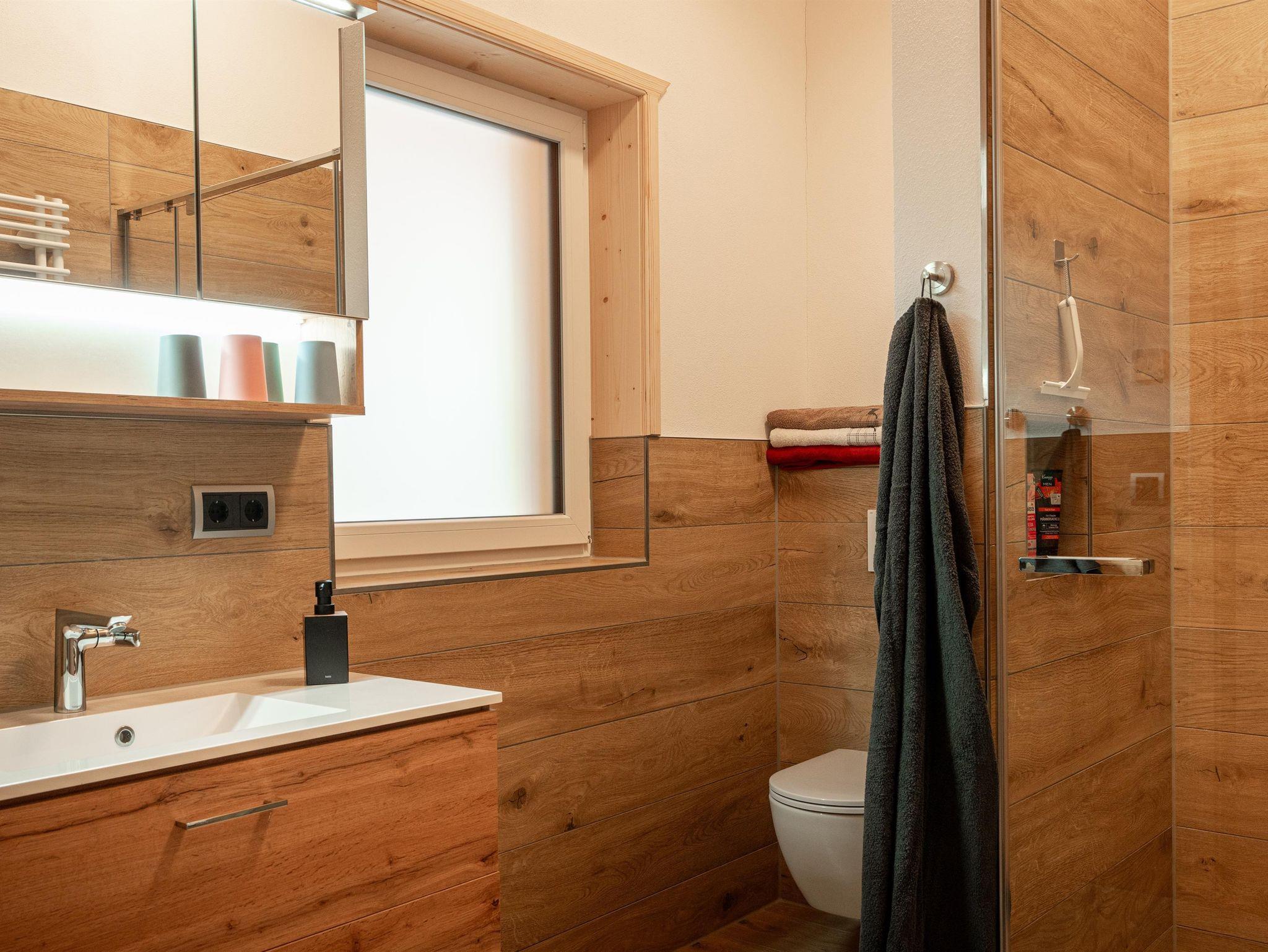 Das Bad wartet auf euch, mit einer erfrischender Regendusche, Fußbodenheizung, Handtuchwärmer und viel Staufläche.