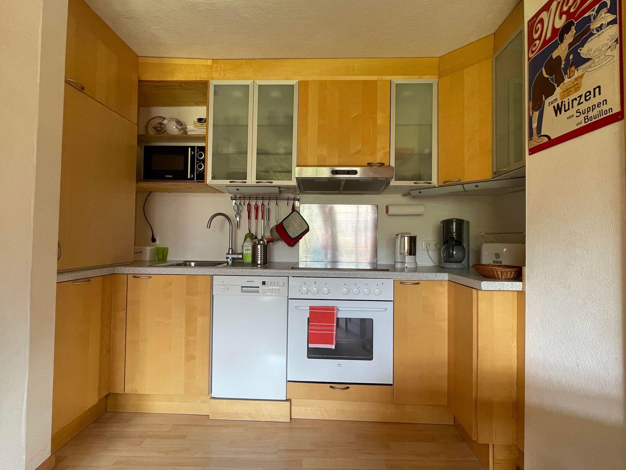 Der Wohnbereich ist vom Flur offen zugänglich, hell und freundlich mit Blick in die Berge.
