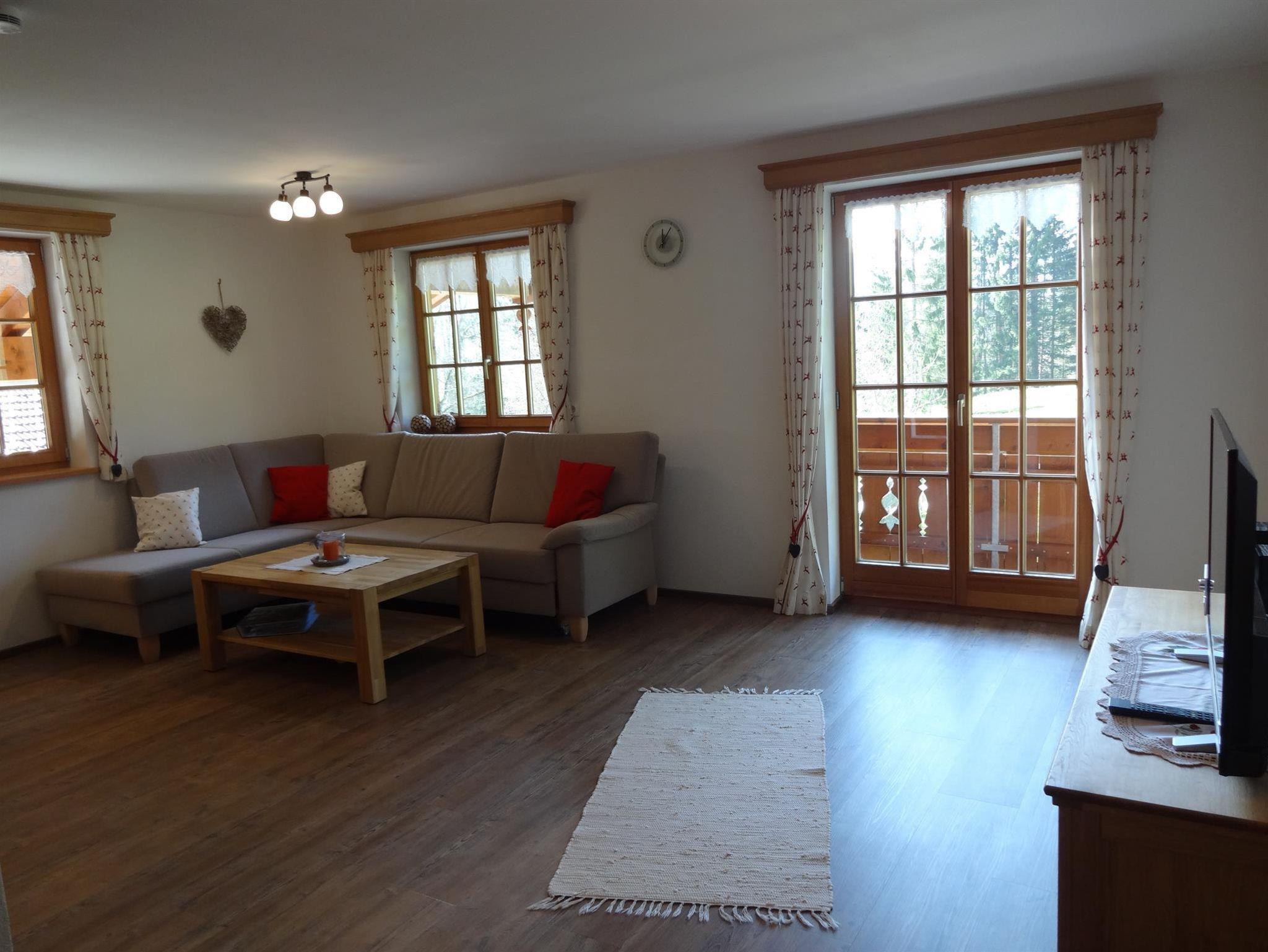 Ferienwohnung mit viel Platz. Große, komplett ausgestattete Wohnküche mit Sitzgruppe und gemütlicher Couch zum entspannen. Zwei in Vollholz gefertigte Schlafzimmer. Großes Bad mit begehbarer Dusche, WC. Vom Südbalkon haben Sie einen wunderbaren Blick auf die umliegenden Wiesen und Berge.