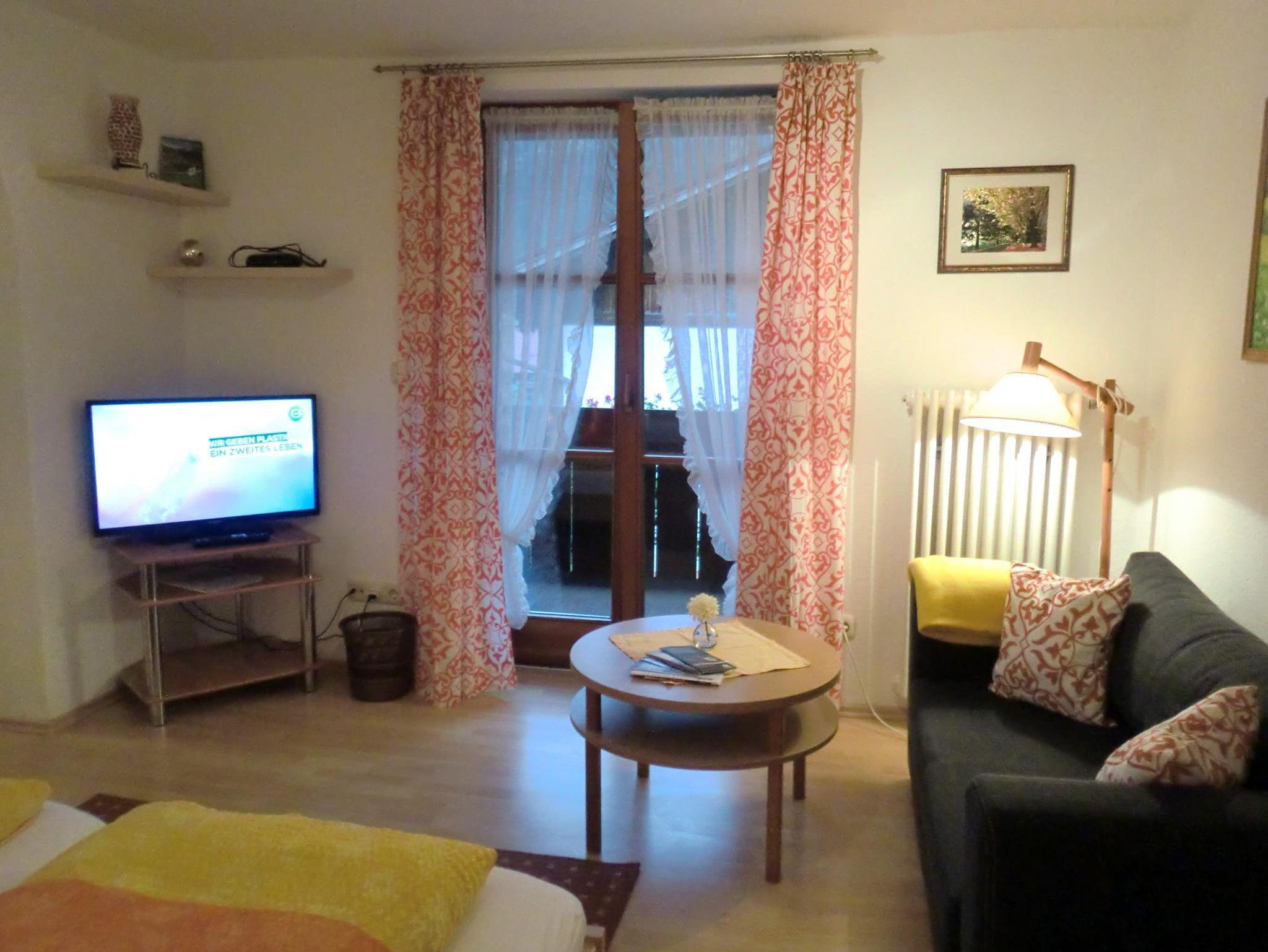 Couch, TV mit DVD player, Wohn-Küche mit Essecke, Dusche und WC und großer Südbalkon.