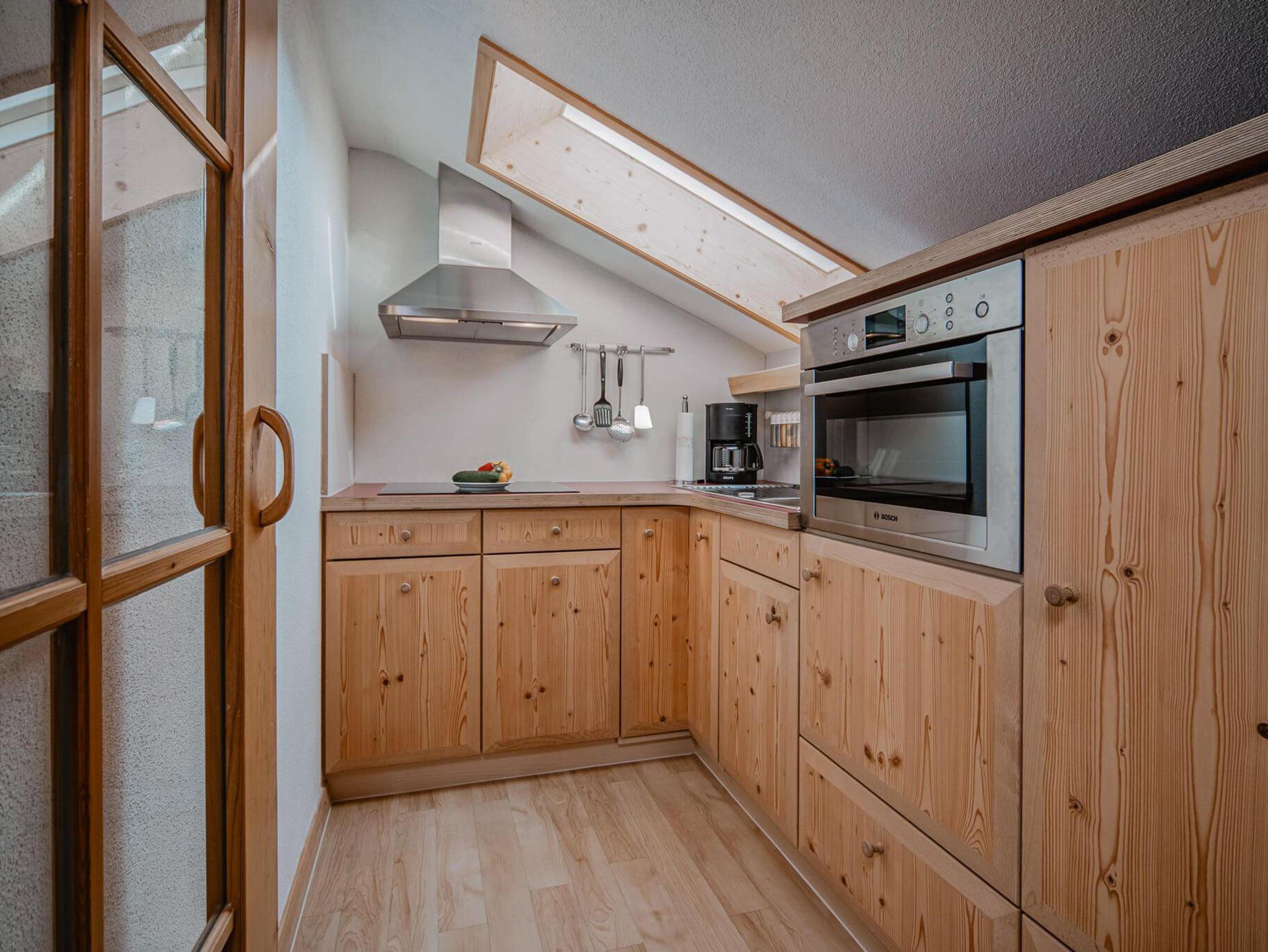 Küche mit 4 Kochplatten, Backofen, Spülmaschine, Kaffeemaschine, Espressokocher, Wasserkocher, Toaster, Eierkocher, diverse Arbeitsgeräte, Kochtöpfe, Gläser und Geschirr.