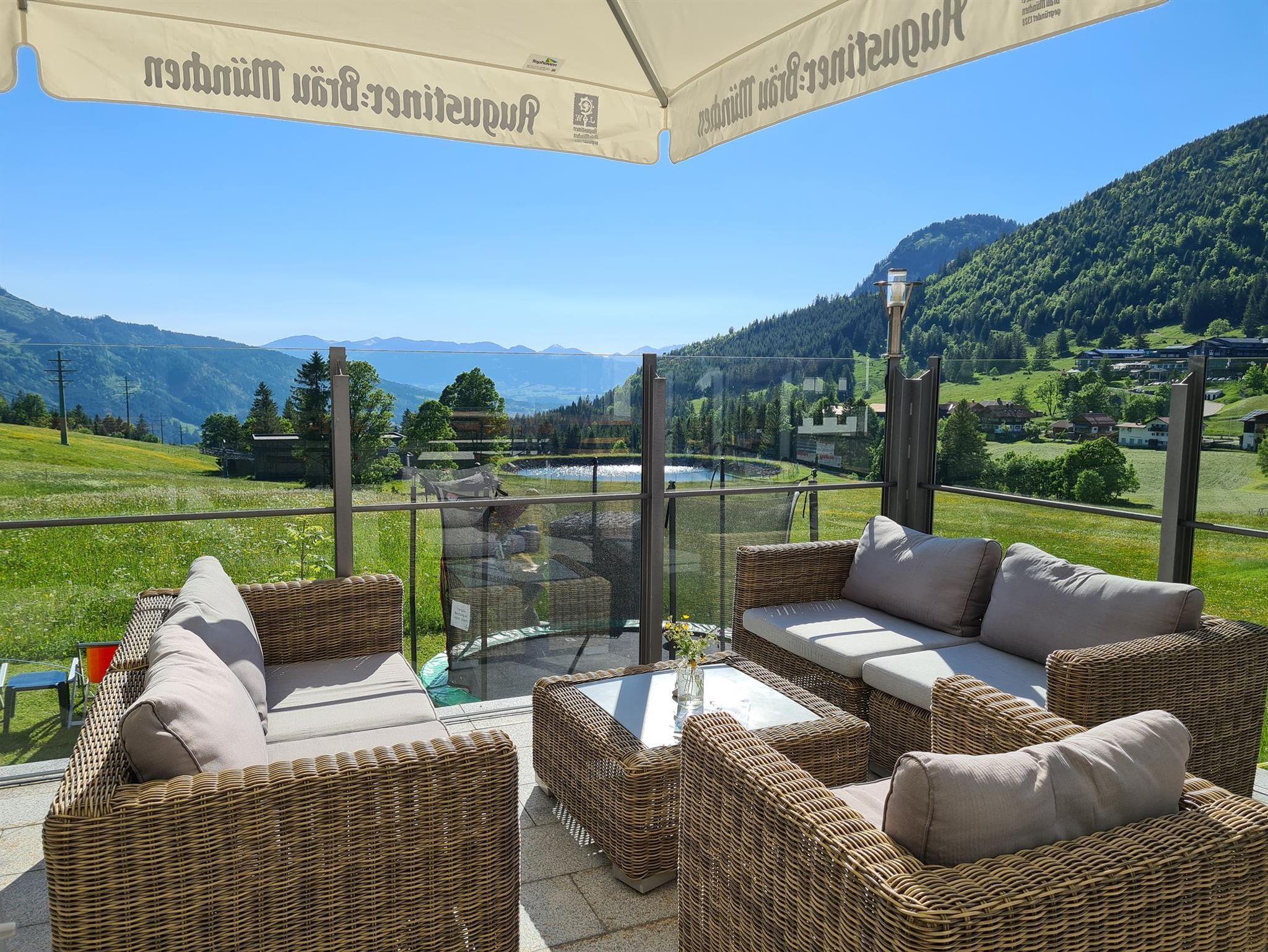 Im Sommer bietet sich ein traumhafter Panoramablick aus allen Zimmern & Ferienwohnungen. Nach der Wanderung oder einem Ausflug lässt du den Tag auf der Sonnenterrasse ausklingen.