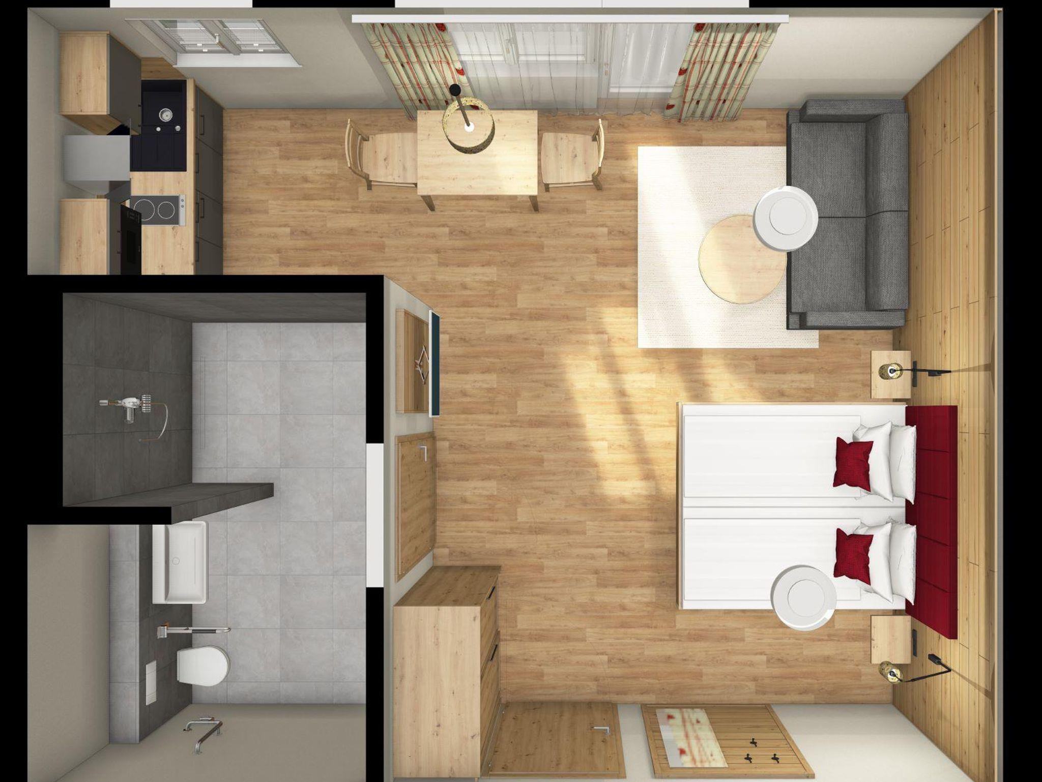 Kleines Appartement (40m²) für 2 Personen mit Wohnküche und offenem Schlafraum sowie Südbalkon mit Bergblick.