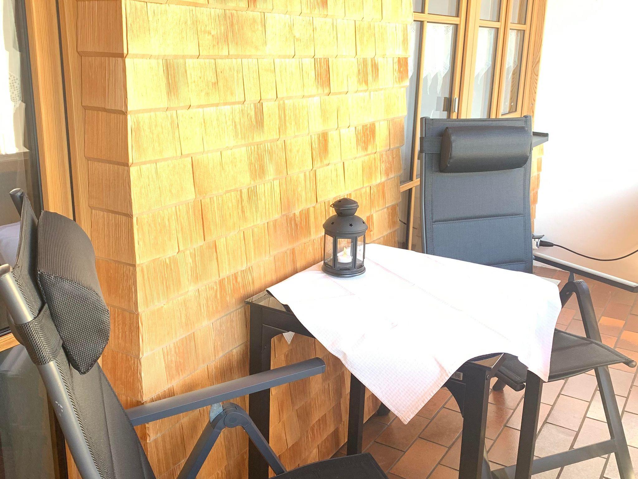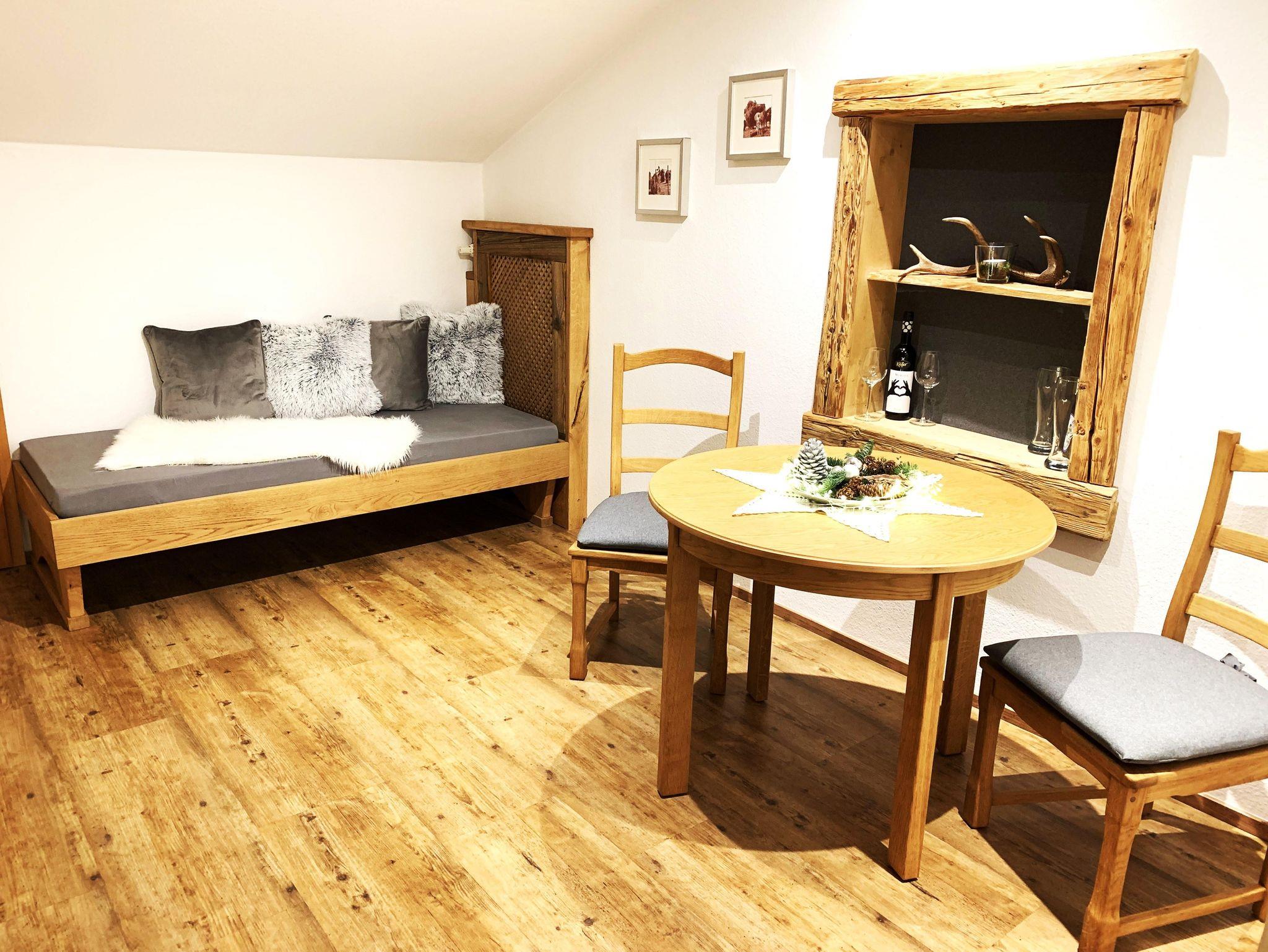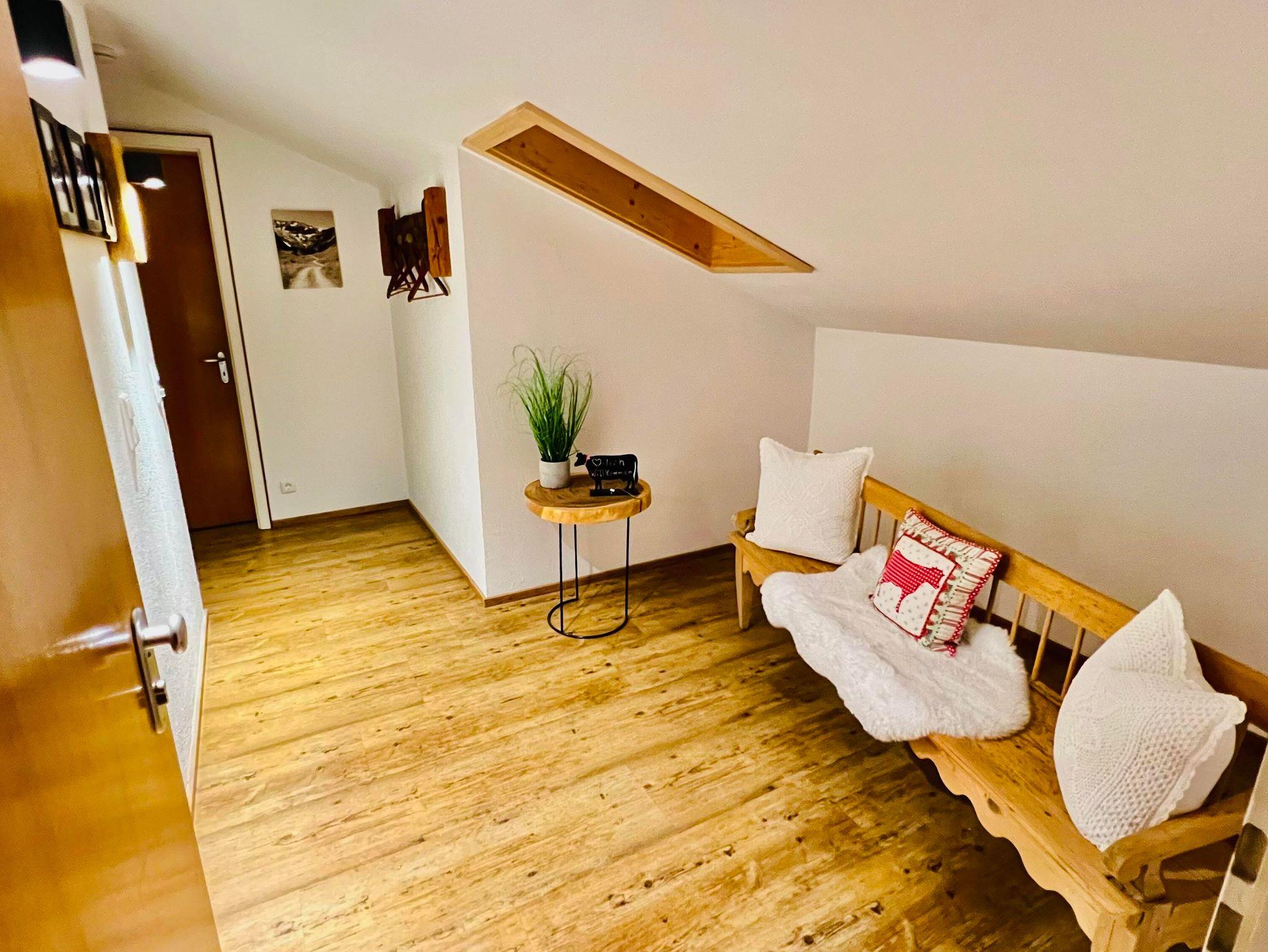 Gemütliche u. liebevoll eingerichtete Nichtraucher F4-Sterne-Dachwohnung (65 qm, 2 Pers.) mit Wohnküche (Kabel-TV u. Stereoanlage), Spülmaschine, Mikro, Wasserkocher, Kaffeemaschine und Sitzecke. Separates Eicheschlafzimmer mit Allergiebetten sowie Ostbalkon zur Alleinbenutzung (Bergblick). Bad (Dusche/WC). Handtücher, Wäsche und Endreinigung inklusive. W-LAN kostenlos (Keine Haustiere).