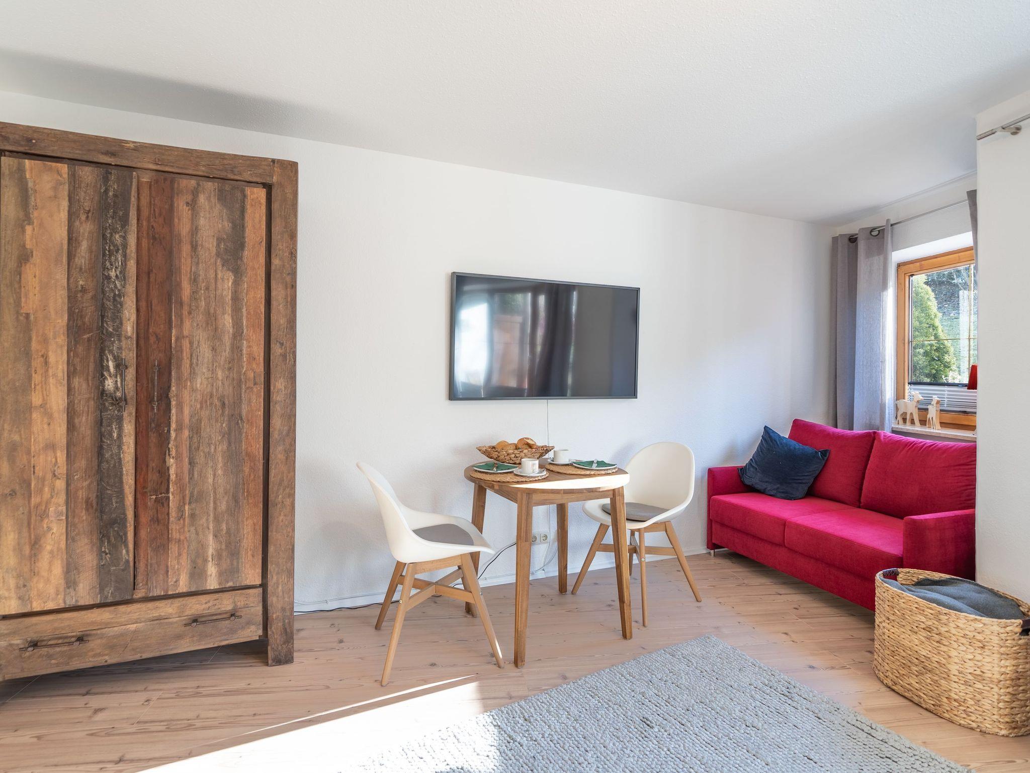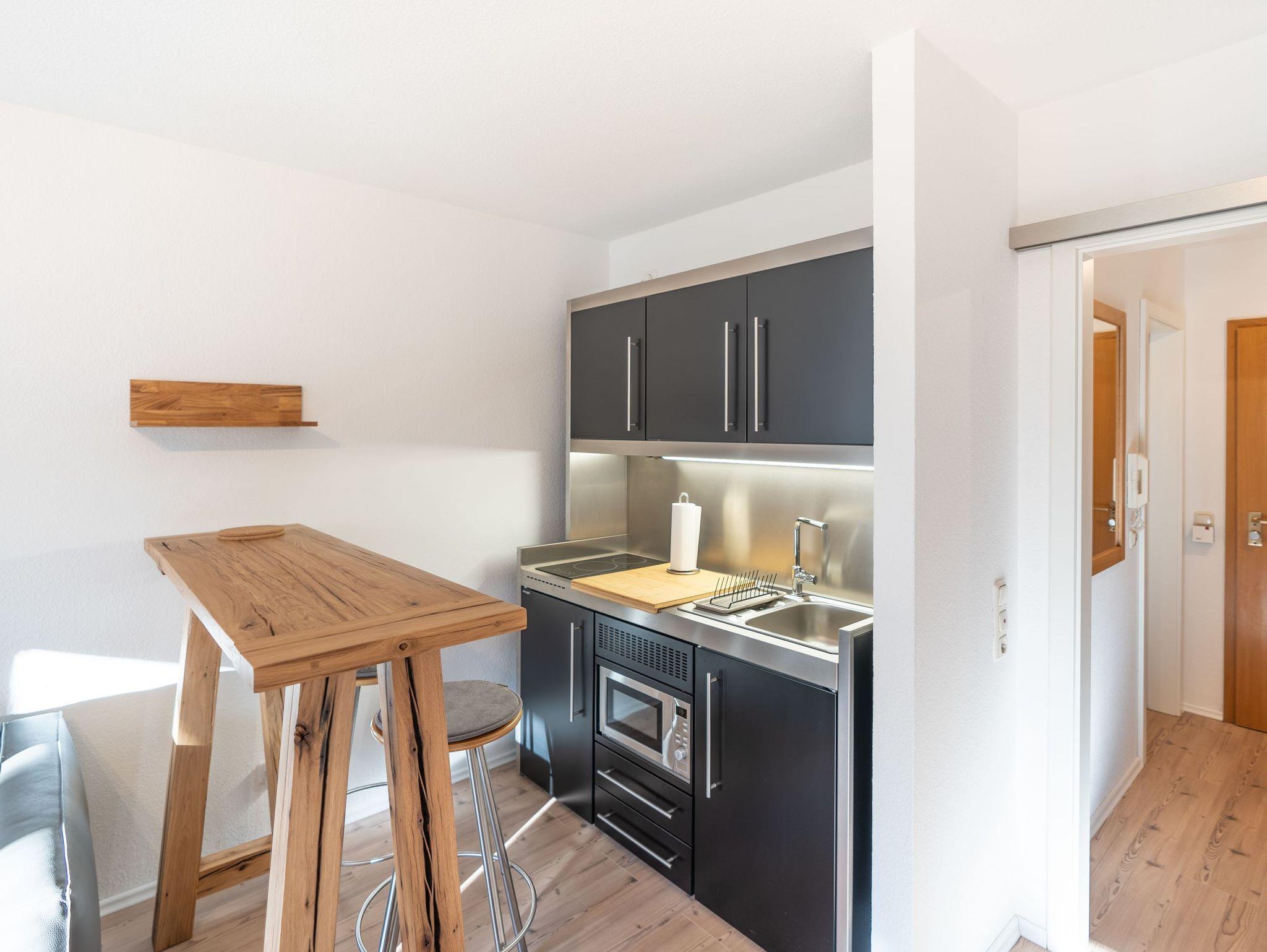 Die Wohnung bietet Ihnen den perfekten Rückzugsort für einen entspannten Urlaub zu zweit oder alleine. Das Einzimmerappartement verfügt über einen kombinierten Wohn-/Schlafraum mit einem bequemen Dauerschläfersofa und eine kleine offene Küche, die mit allem Wichtigen ausgestattet ist. Das moderne Badezimmer bietet Ihnen eine Badewanne mit Dusche, ein Waschbecken und ein WC. Genießen Sie den herrlichen Bergblick auf der Terrasse und verbringen Sie angenehme Stunden im Freien.