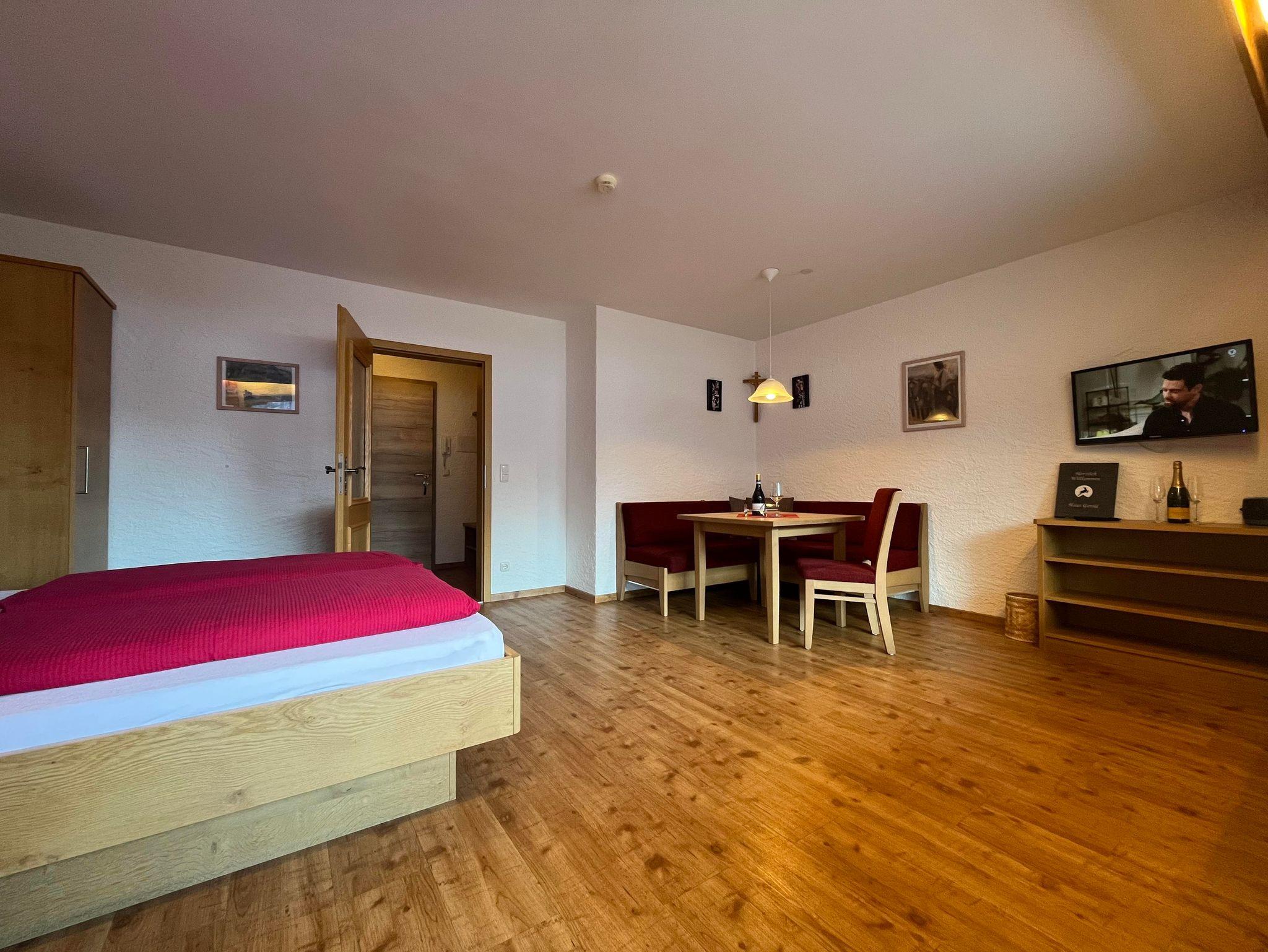 Alles neu renoviert ! Geeignet für 2-3 Personen (3 Person in Zustellbett). Lage: Südseitig, Hausmitte m.grossem überdachtem Balkon, grosses Wohn-/Schlafzimmer mit Doppelbett, Eckbank mit Tisch, komplette Küche mit Dunstabzug, Spülmasch. und Kühlschrank mit Gefriermöglichkeit, Bad-Dusche u. WC. Radio und Flachbildschirm-Sat-TV. Kinderbett auf Anfrage. Gesamt ca. 37 qm.