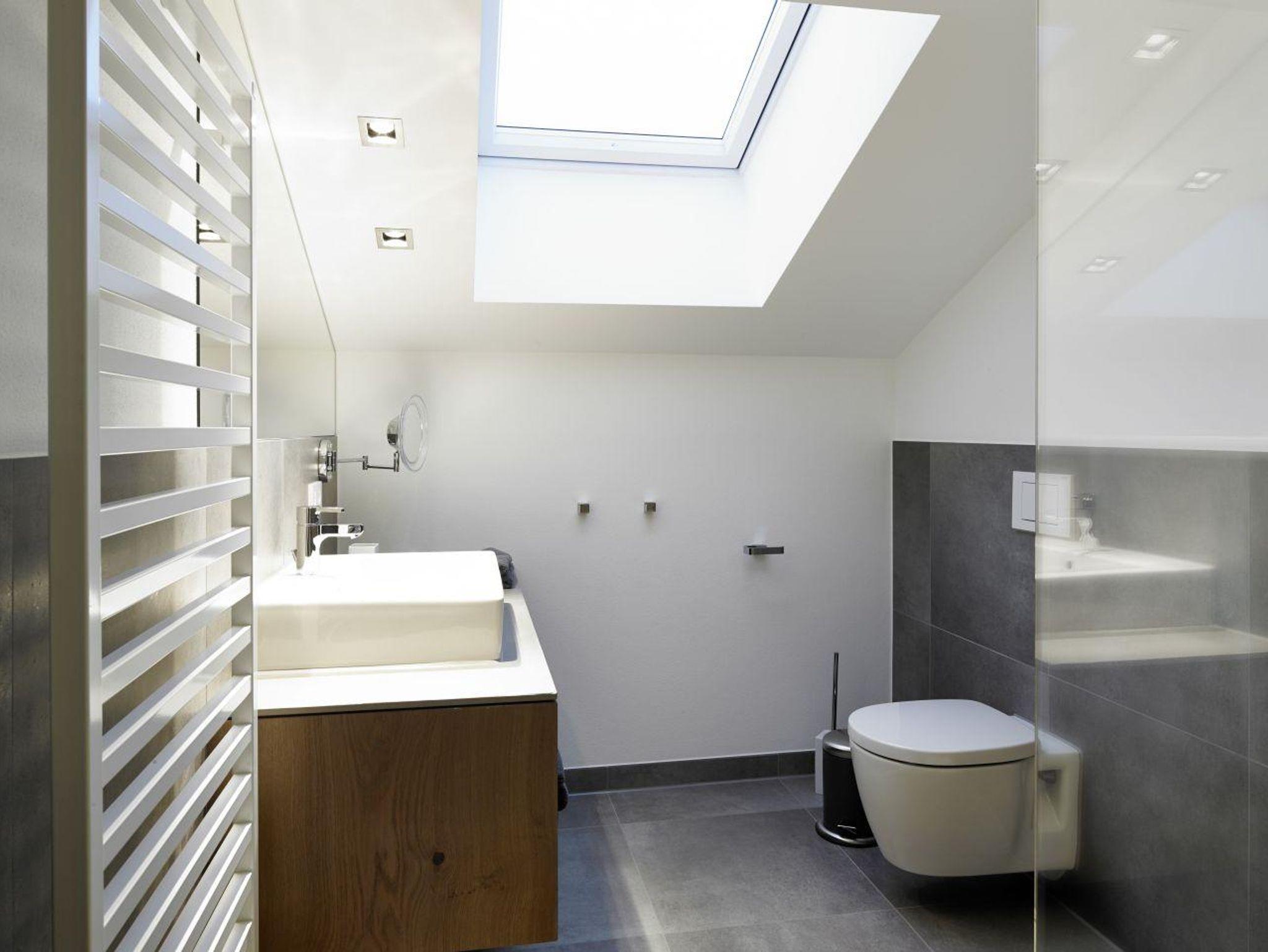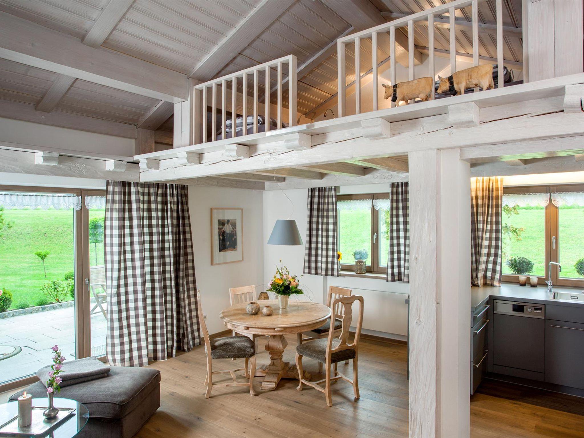 Ferienwohnung 2- Wohnraum mit Küche und Maisonette mit zwei zusätzlichen kuscheligen Schlafplätzen direkt unter dem Dachgiebel, Kochbereich mit Nespresso Kaffeemaschine, Ceran-Kochfeld, Geschirrspüler und Backofen, Schlafzimmer mit komfortablem Doppelbett, Tageslicht-Badezimmer mit bodenebener Dusche, WC und Kosmetikspiegel. Heller Wohnbereich mit Terrasse nach Westen herrlichem Blick ins Grüne und auf die Berge.