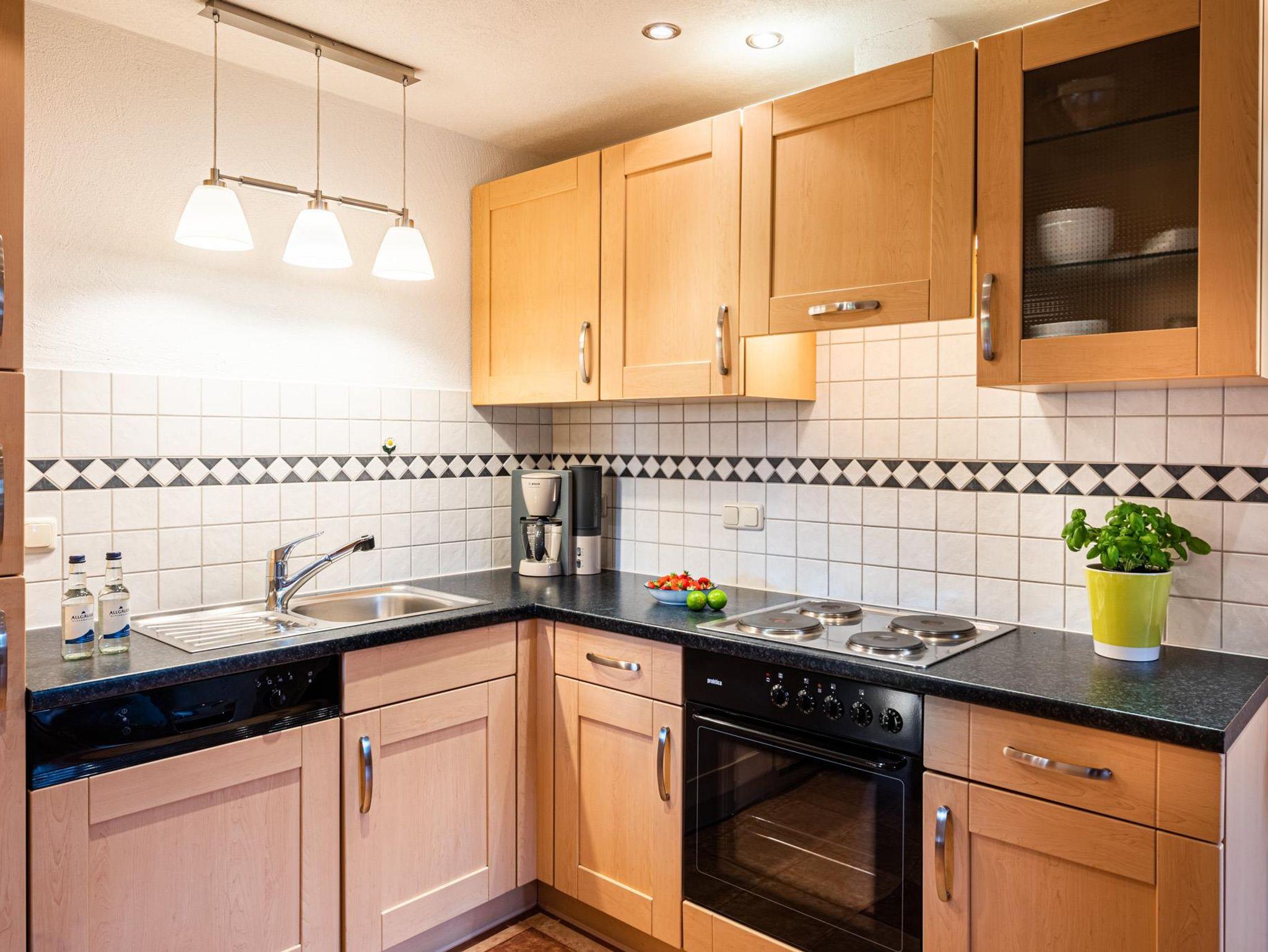 . eine gut ausgestattete Küche mit Esstisch und Frühstücksbalkon