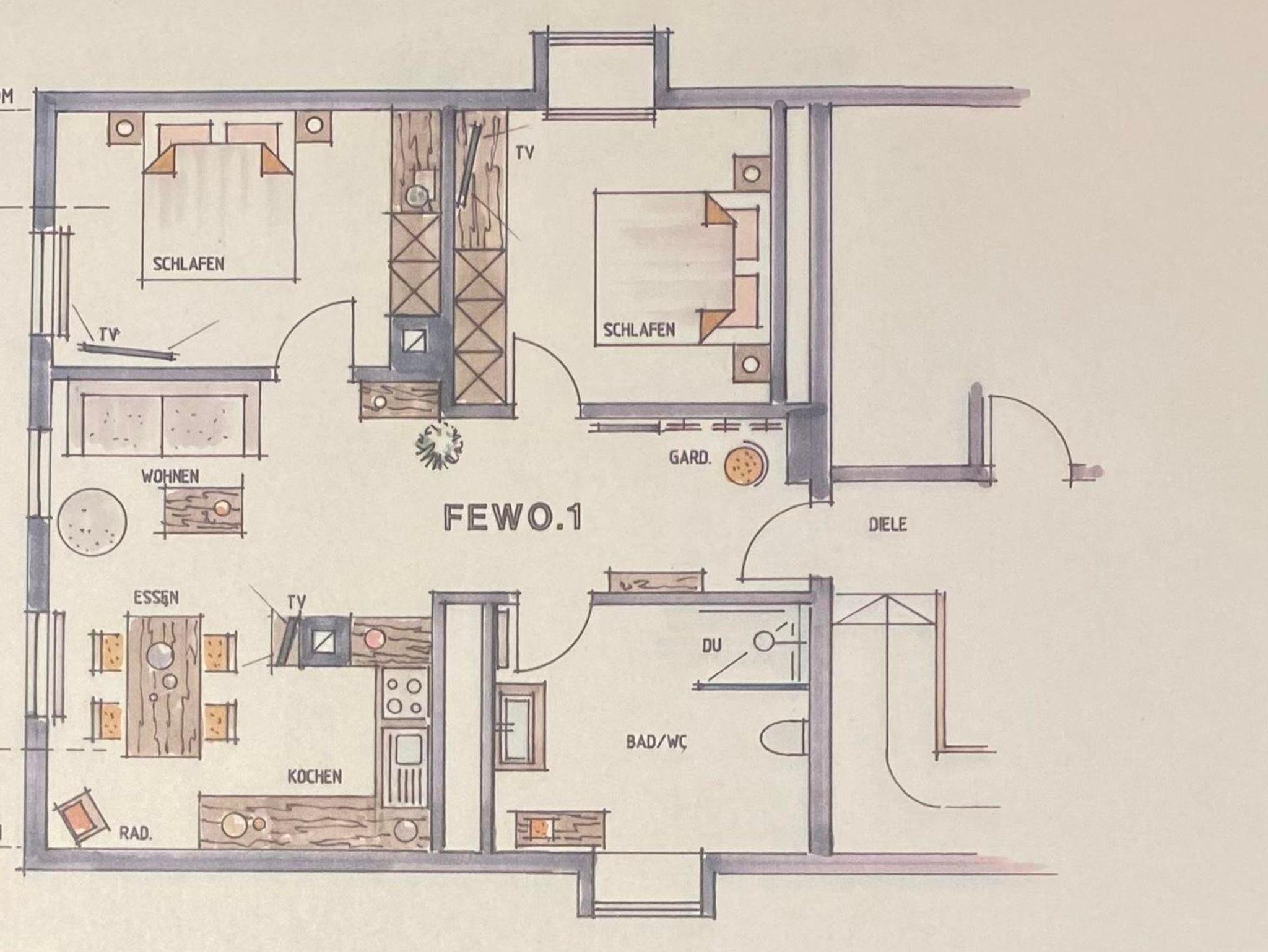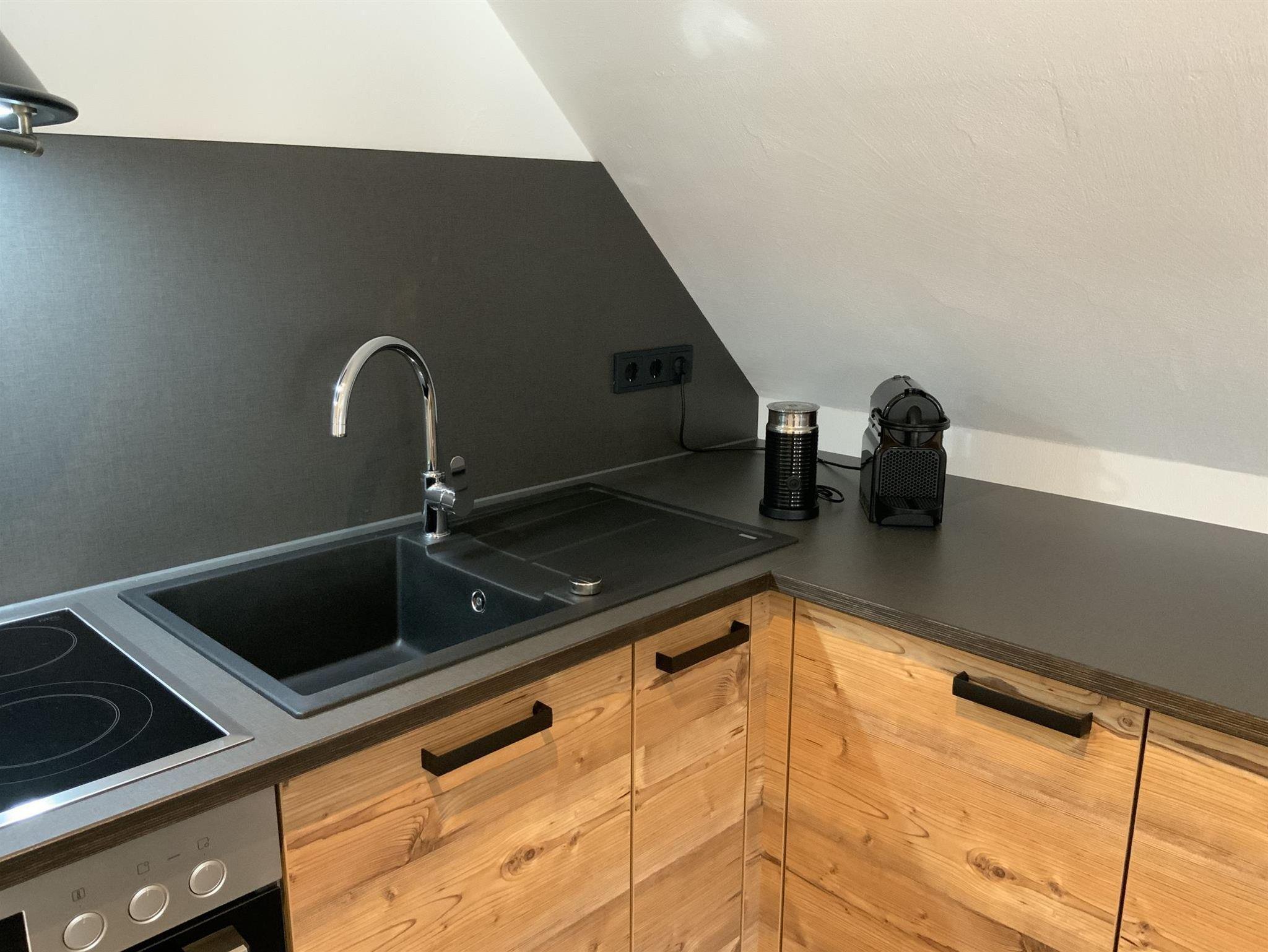 - einer Wohnküche (große Küchenzeile, Ceranherd, Backofen, Spülmaschine, Kühlschrank mit Eisfach, Dunstabzug, Nespressomaschine, Milchaufschäumer, Wasserkocher etc.), Sofa, Esstisch, Flachbild TV