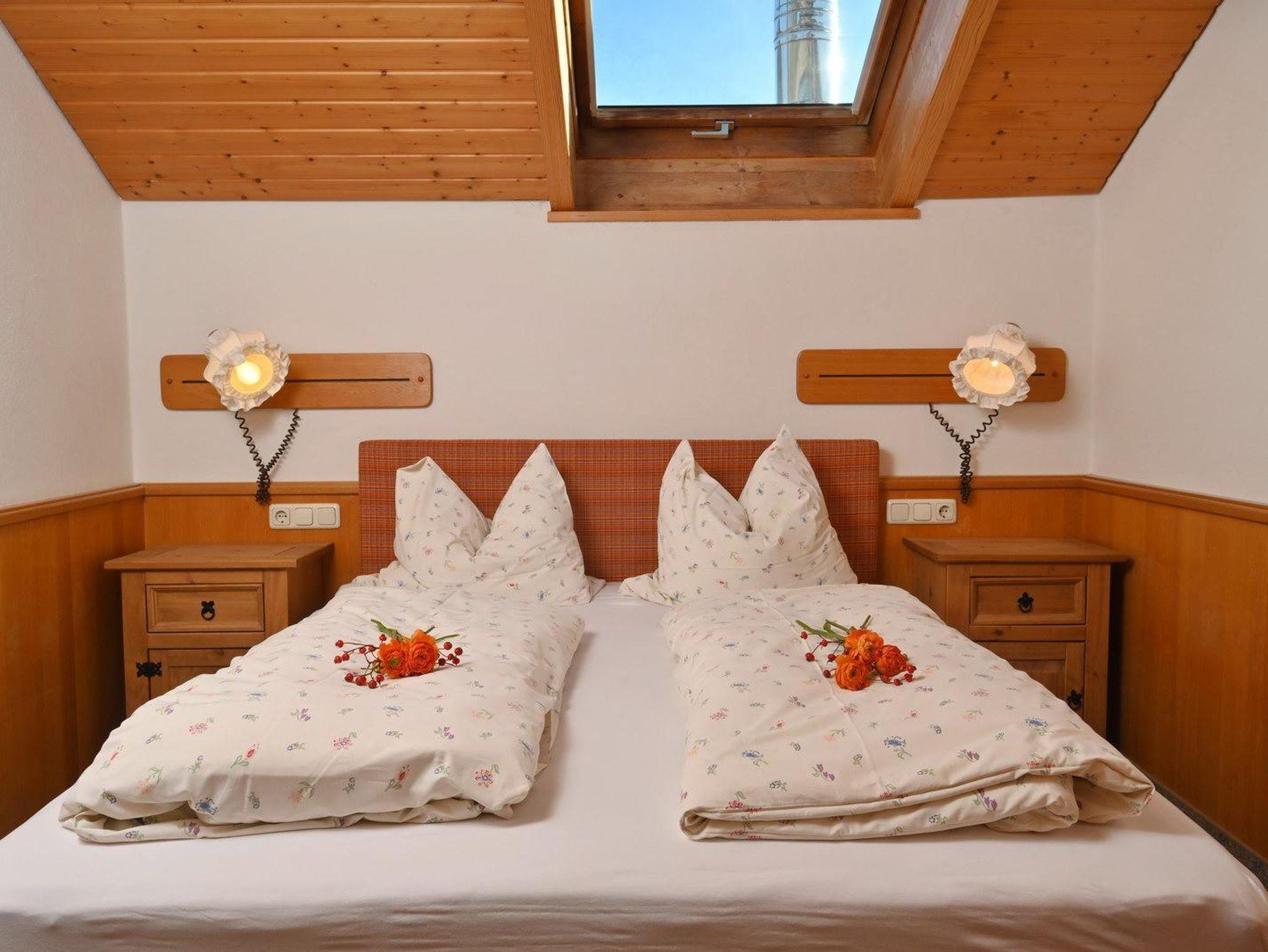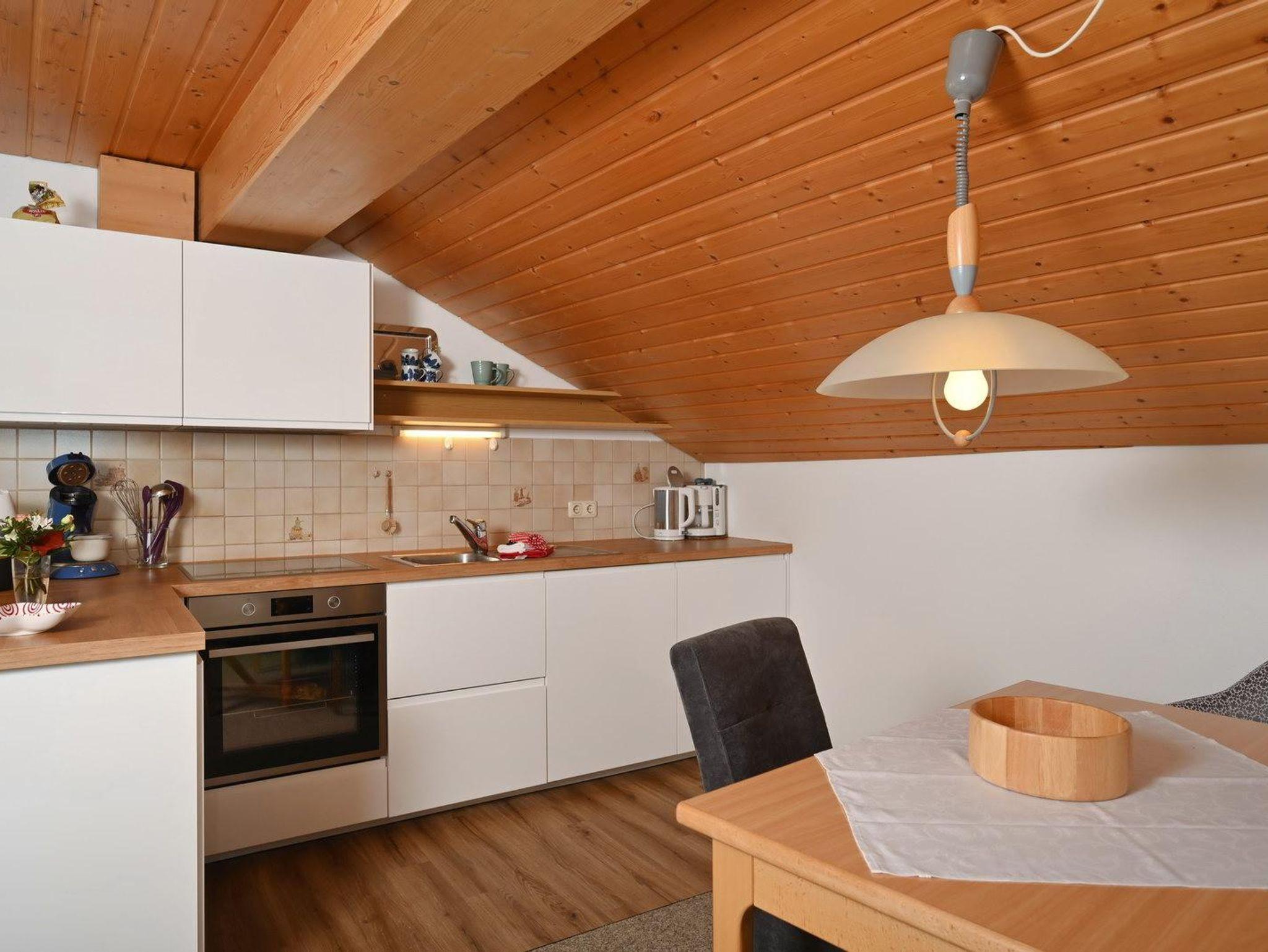 Gemütliche Ferienwohnung im Dachgeschoss für 1-2 Personen. Westbalkon mit herrlichem Bergblick, Badewanne und WC, Couchgarnitur zum entspannen, komplett eingerichtete Küche mit Eckbank im Wohnbereich (zusätzliche Schlafmöglichkeit), separates Schlafzimmer mit Boxspringbetten.