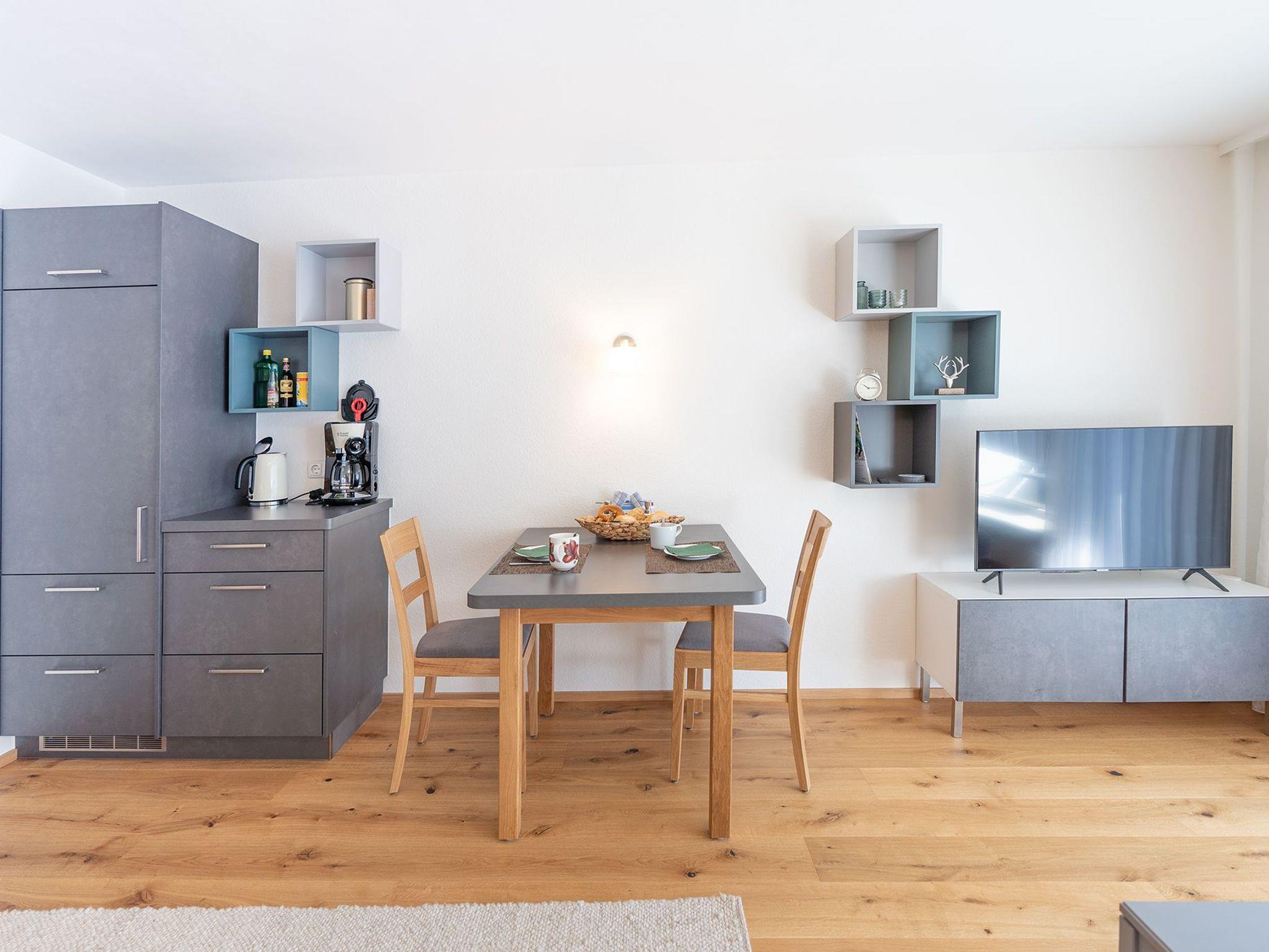 Dieses schöne und moderne 1-Zimmer-Apartment für 2 Personen bietet Ihnen einen Wohnbereich mit gemütlichem Sofa, einen Essbereich mit Küche, sowie ein großes Doppelbett (bestehend aus 2 Einzelbetten) im Schlafbereich. Die gut ausgestattete Küche verfügt über die wichtigsten Utensilien für den täglichen Bedarf. Im Badezimmer finden Sie eine Badewanne mit Duschtrennwand, ein Waschbecken, WC und Handtuchtrockner vor. Genießen Sie wunderschöne Stunden auf dem Balkon, von wo aus Sie einen herrlichen Blick in die Allgäuer Berge haben.