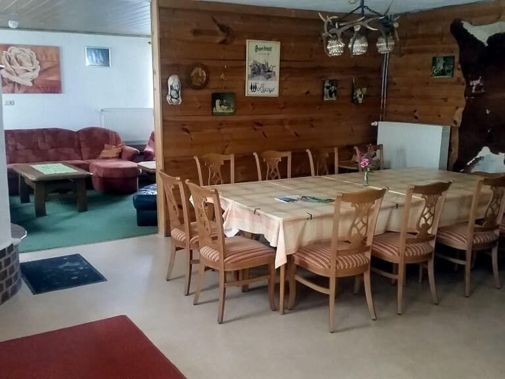 Ferienhaus (210 qm) für bis zu 13 Personen: Im Erdgeschoss befindet sich ein großes Wohnzimmer mit Sat-TV, Couchgarnituren, eine große Küche mit Geschirrspülmaschine, Ceranfeld, Backofen, Mikrowelle, 2x Kaffeemaschine, Wasserkocher, Toaster, sowie ein WC und zwei Duschen. Zwischen der Küche und dem Fernsehraum befindet sich noch der Ess- und Aufenthaltsraum mit Kachelofen. Im Obergeschoss sind 6 Schlafzimmer mit: 3 Doppelbettzimmer, 2x 3-Bett-Zimmer und ein 1-Bett-Zimmer mit Kinderbett. Außerdem noch zwei Bäder mit Dusche und WC. Waschmaschine auf Anfrage. Vor dem Haus befindet sich eine Liegewiese, eine große überdachte Terrasse mit Gartenmöbeln, Grill, Feuerschale, sowie ein Brunnen. Die Betten sind bereits bezogen!