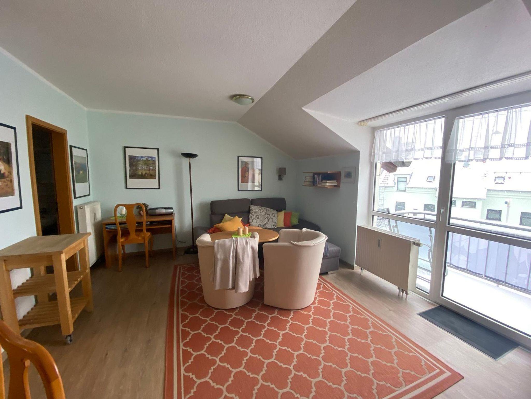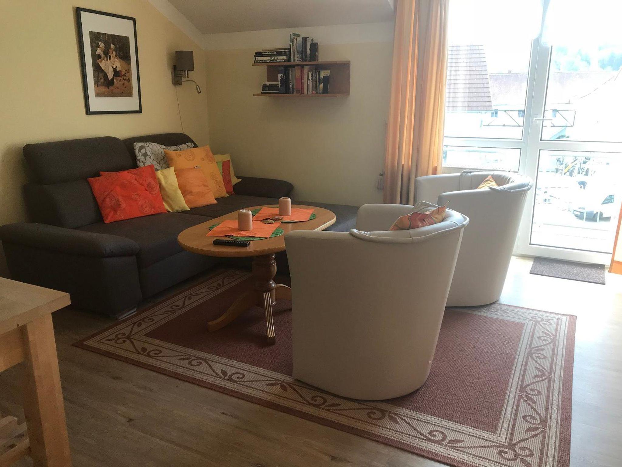 Komfortables Appartement mit zwei Schlafräumen und neuer Küche mit Spülmaschine, Wohnküche mit Essplatz und Sofa mit Sat-TV und kostenfreiem wlan, zwei Balkone, Schlafräume einmal Doppelbett, einmal Einzelbett inkl. Eintritt in die Bade- und Saunawelt AQACUR für 3 Personen für 3 Std. täglich, Tiefgaragenstellplatz und Abstellplatz für Fahrräder, örtliche Guti-Karte für kostenlose Nutzung von Bus und Bahn
