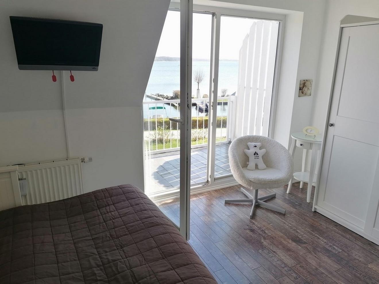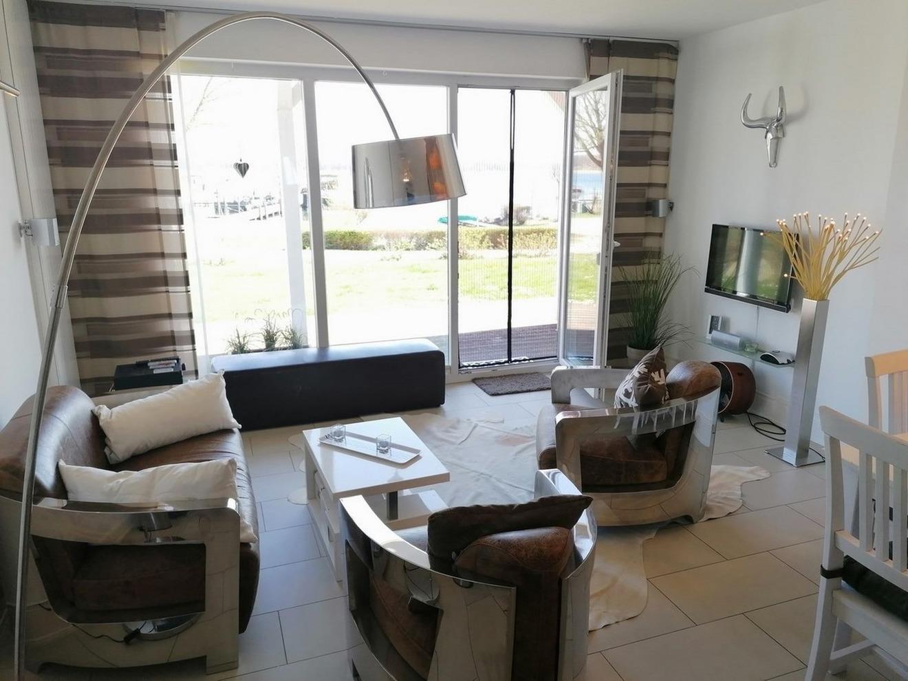 - großes Wohnzimmer mit Couch, 2 Sessel, TV, Essbereich für 4 Personen, Seeblick und Zugang zur Terrasse