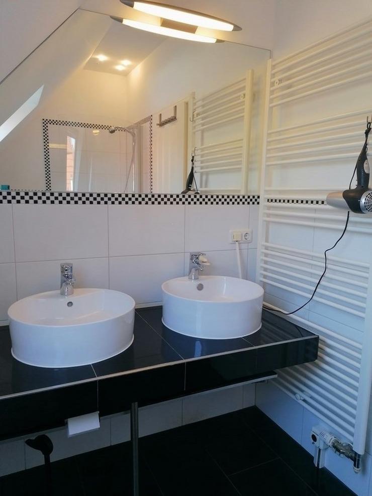 - Badezimmer mit Doppelwaschbecken, Badewanne mit Duschscheibe, WC, Handtuchheizkörper