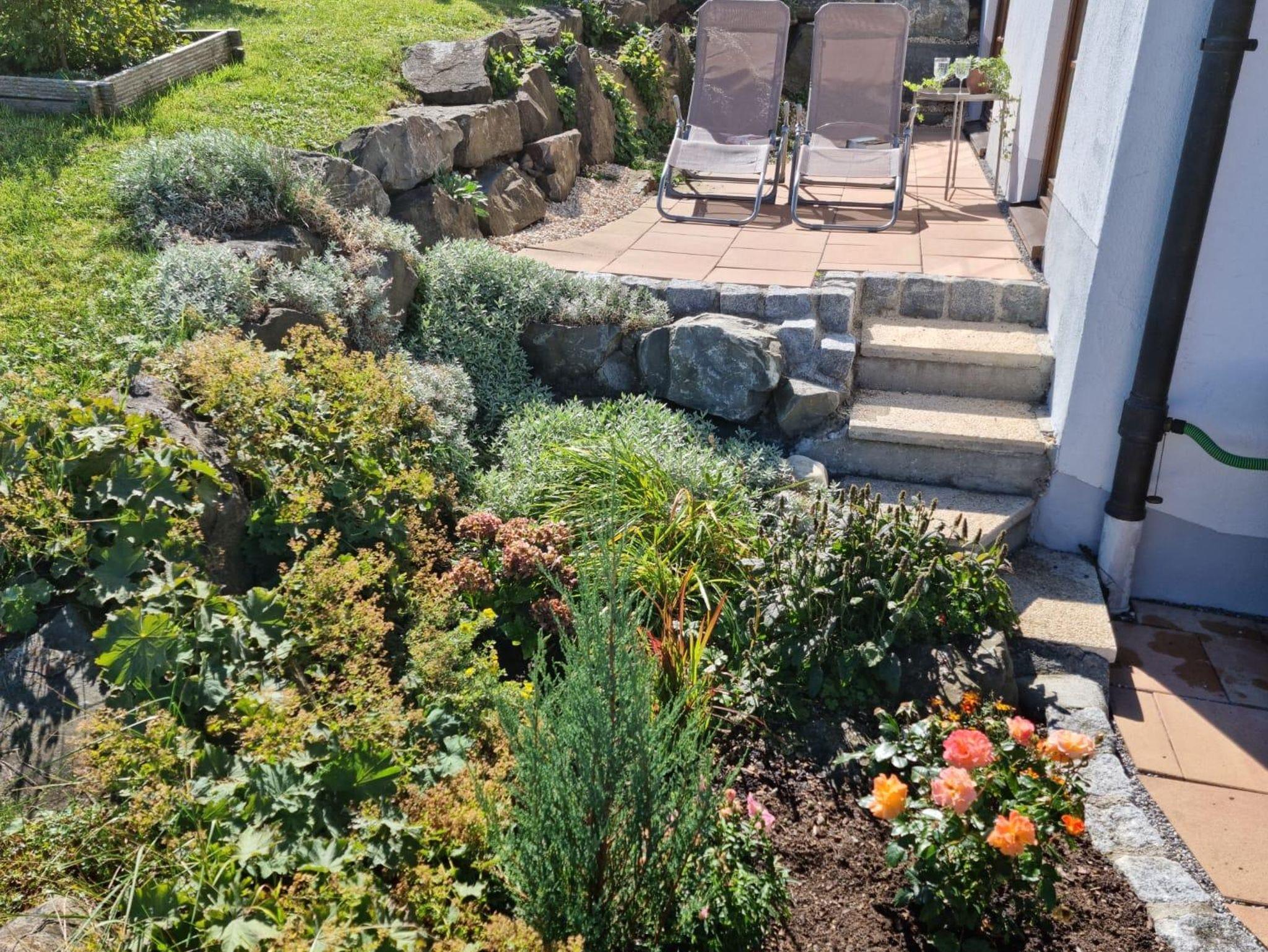 In unserer neu renovierten Ferienwohnung bewohnen Sie unser komplettes Erdgeschoss. Die Wohnung verfügt über drei Terrassen, so dass Sie die Morgen-, Mittags- und Abendsonne genießen können. Die Glasüberdachung an der Süd/West-Terrasse erlaubt auch den Aufenthalt draußen, wenn die Tage mal nicht so schön sind.