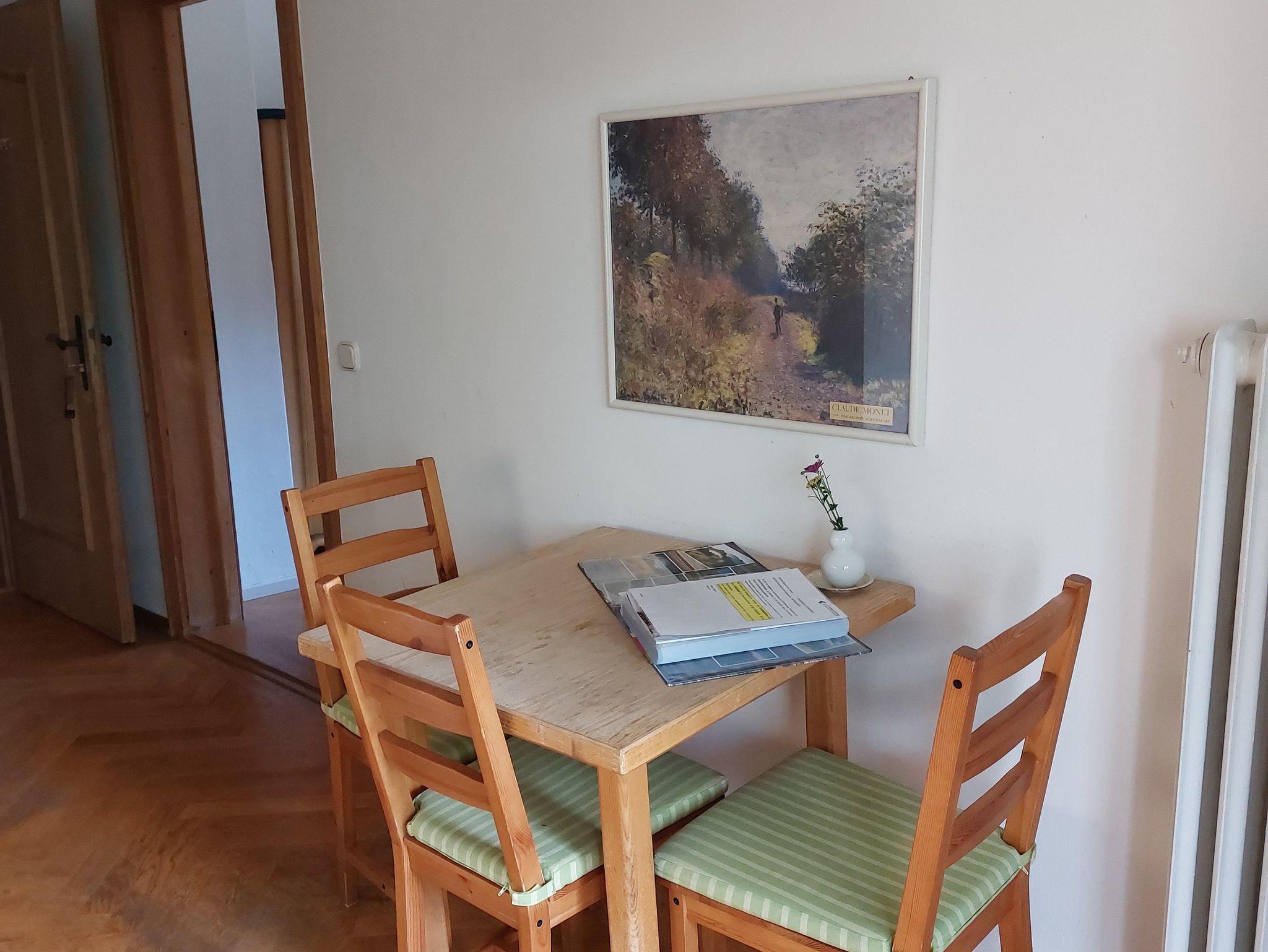 Die Ferienwohnung in einfachem Stil ist mit einer kleiner Küche und Balkon, einem Schlafzimmer mit drei Schlafmöglichkeiten und einem Badezimmer mit Dusche ausgestattet. Die Gäste können die Räumlichkeiten im Erdgeschoss (Gastraum und Weinstube) mit nutzen. Das W-LAN im gesamten Haus ist abschaltbar.