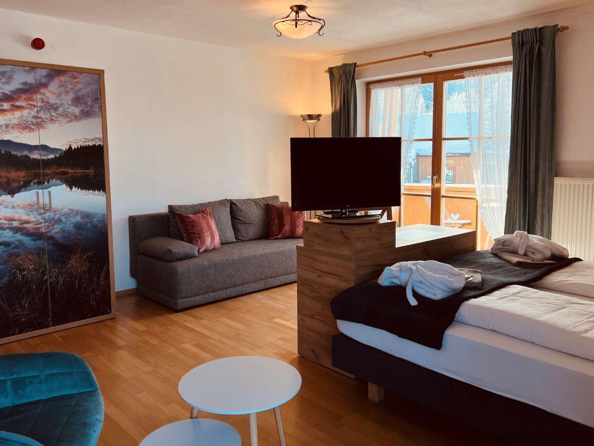 Schlafcouch kann zum Doppelbett ausgezogen werden zum Schlafen für zusätzlich 2 Kinder oder 2 Erwachsene. (Preis auf Anfrage) Zimmer mit Balkon oder Terasse.