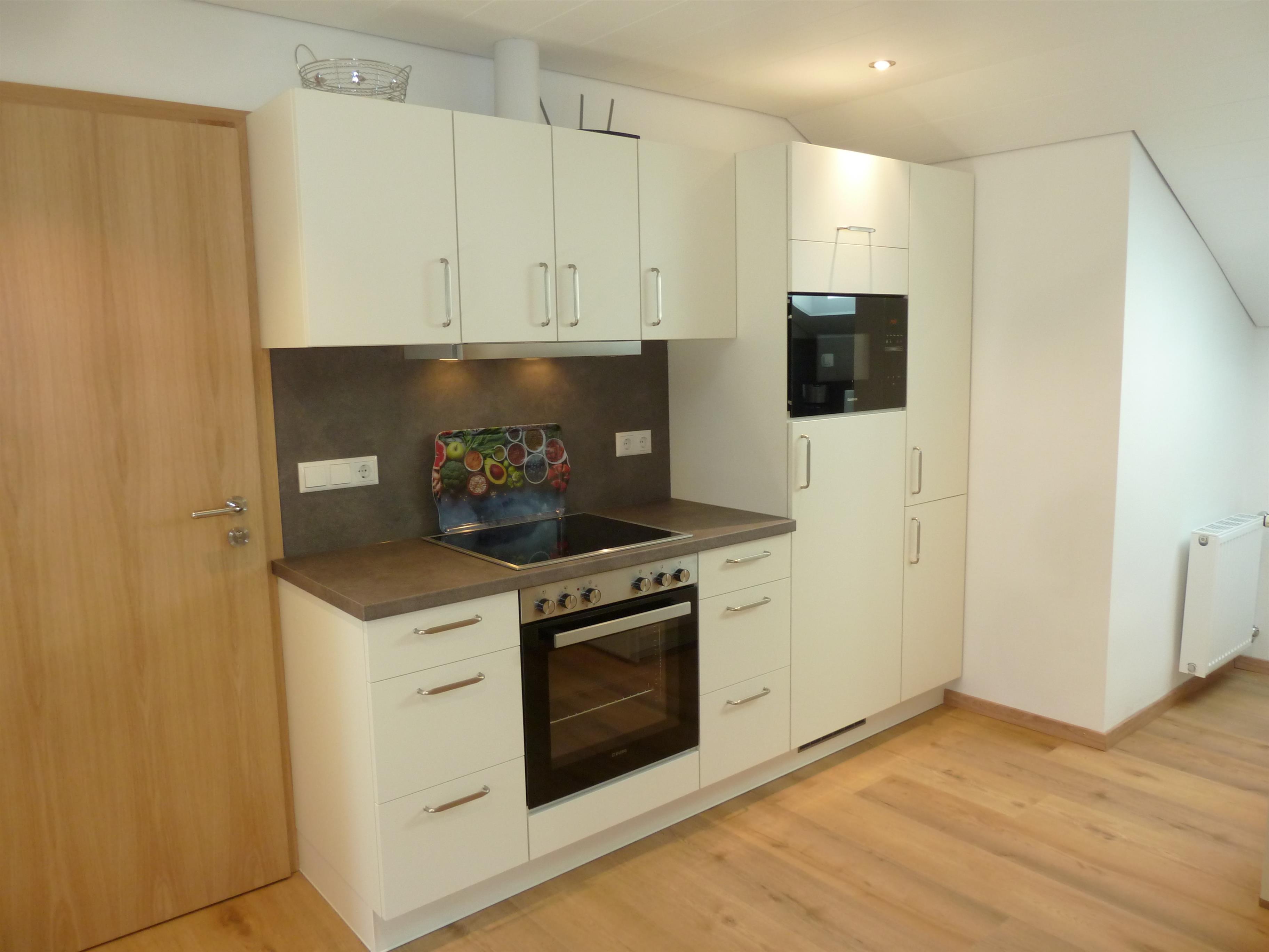 Die großzügige Küche ist komplett ausgestattet mit Geschirr, Kochutensilien, Mikrowelle, Wasserkocher, Kaffeemaschine, Toaster, Kühlschrank mit Gefrierfach, 4-Zonen Ceranfeld, Backofen, Spülmaschine mit Tabs, Reinigungsmittel, Wäscheständer und Akku Staubsauger.